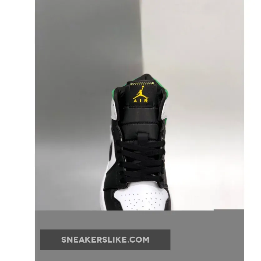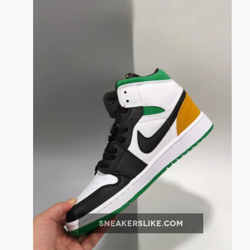 Dressed in a White, Laser Orange, Black, and Lucky Green color scheme. This mid-top Air Jordan 1 features a White leather base with Black overlays paired with Green and Yellow suede on the ankle collar and heel, respectively.