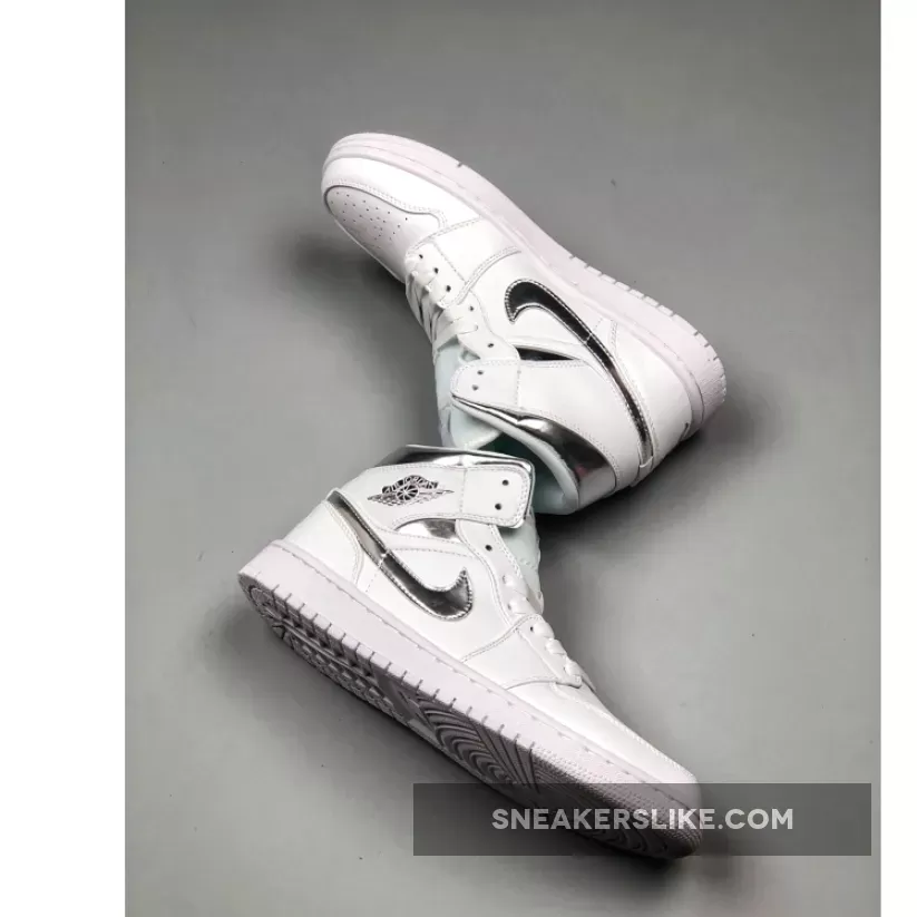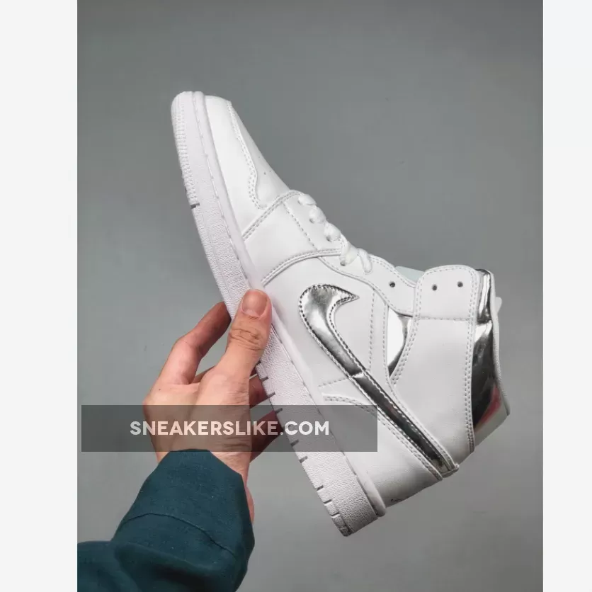 Dressed in a clean White and Metallic Silver color scheme. This Air Jordan 1 features a White leather upper with perforated detailing on the toecap and rubber sole. Metallic Silver accents cover the shoe’s Wings logo, Nike Swooshes, Jumpman on the tongue, heel and inner liner.