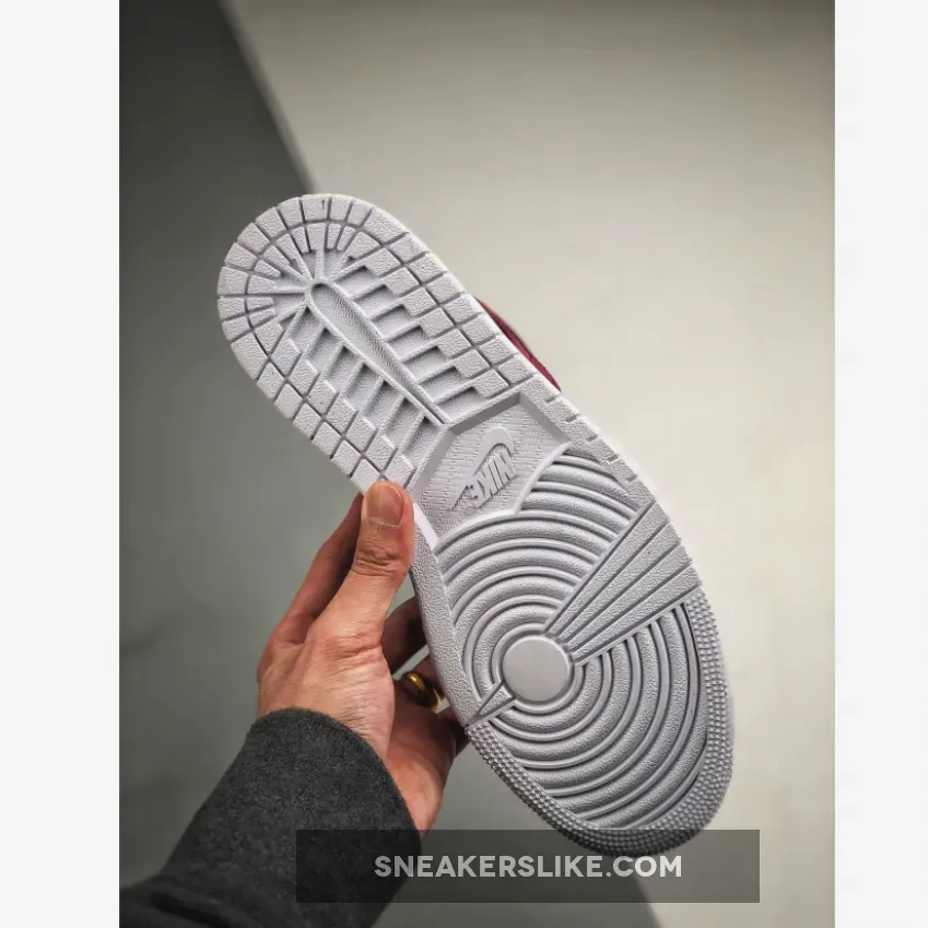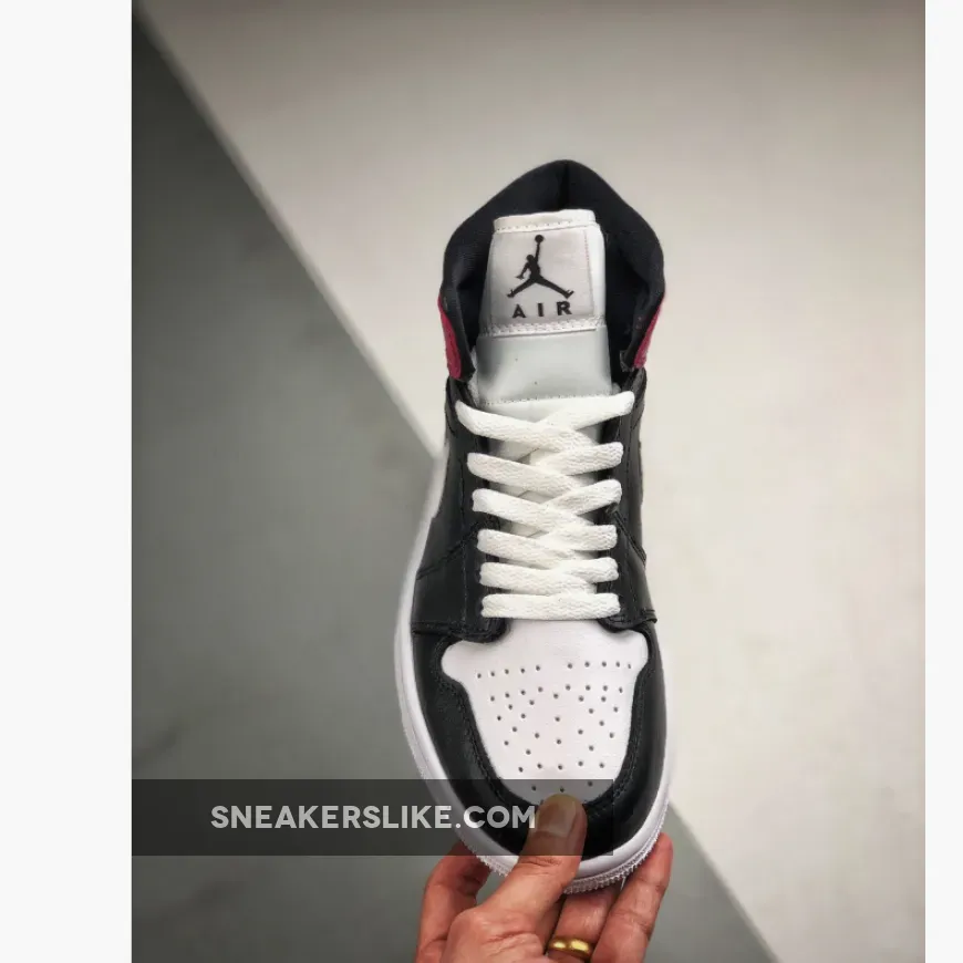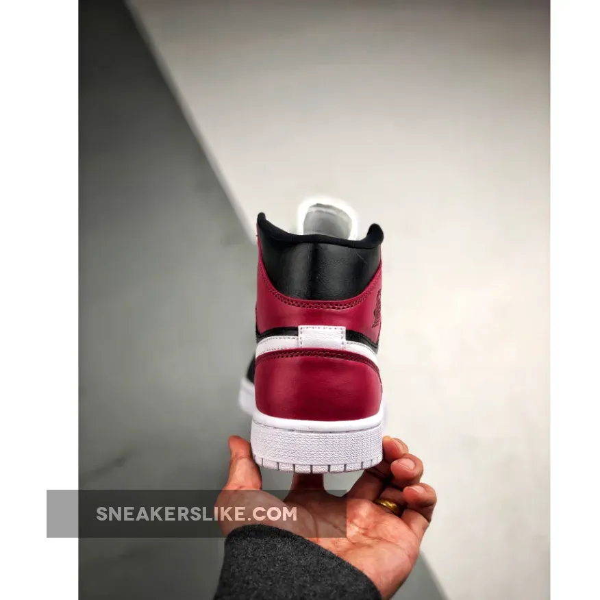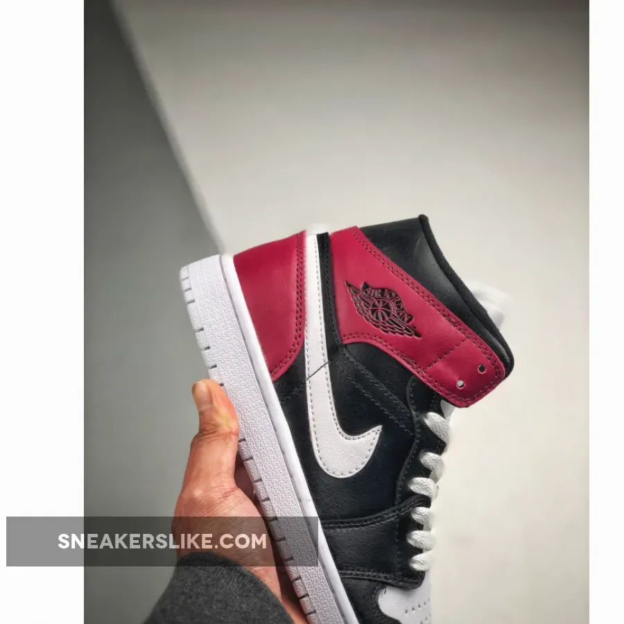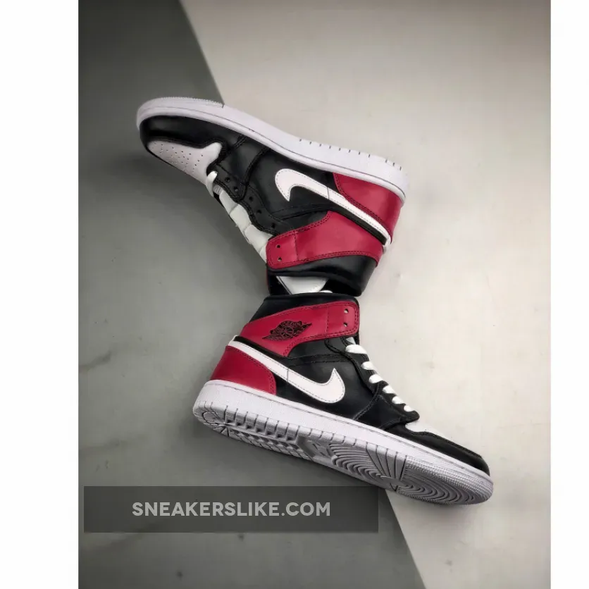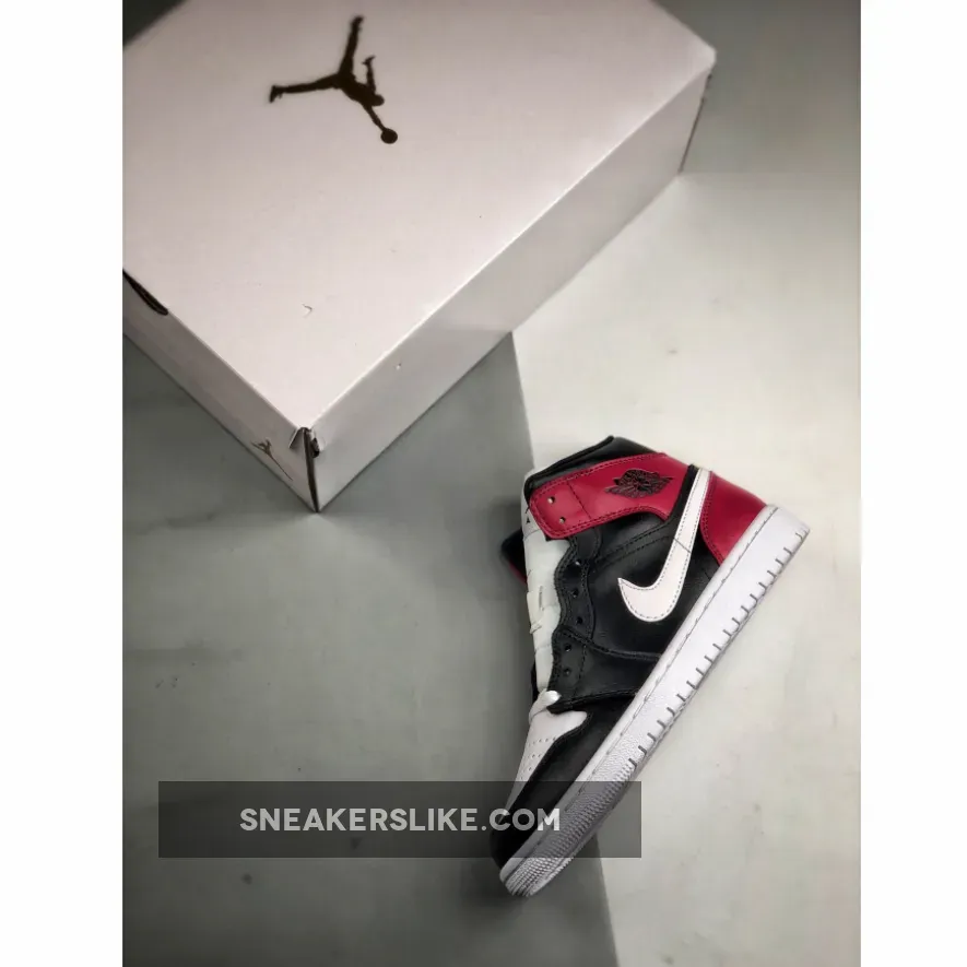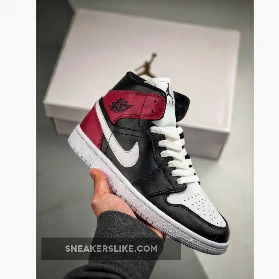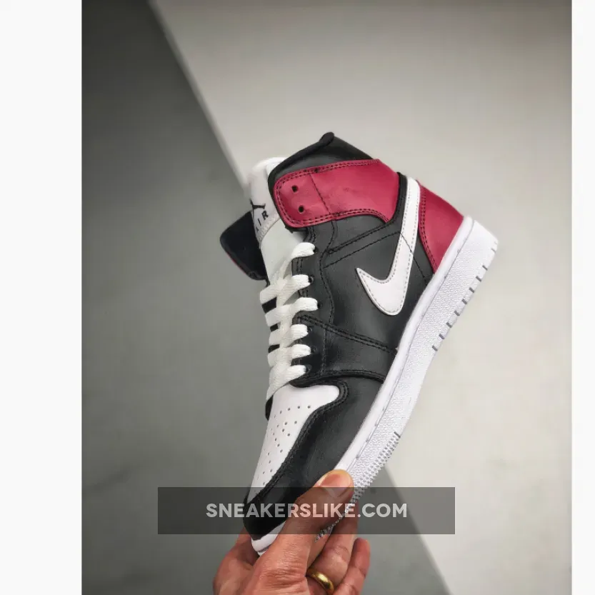 This offering of the mid-top Air Jordan 1 features White leather on the toe and Swoosh with Black leather overlays on the toe, side panels and upper collar. Noble Red is used around the heel completed with a solid White rubber sole.