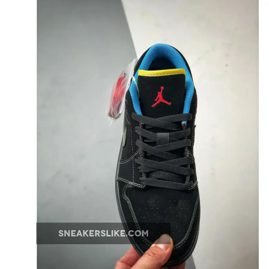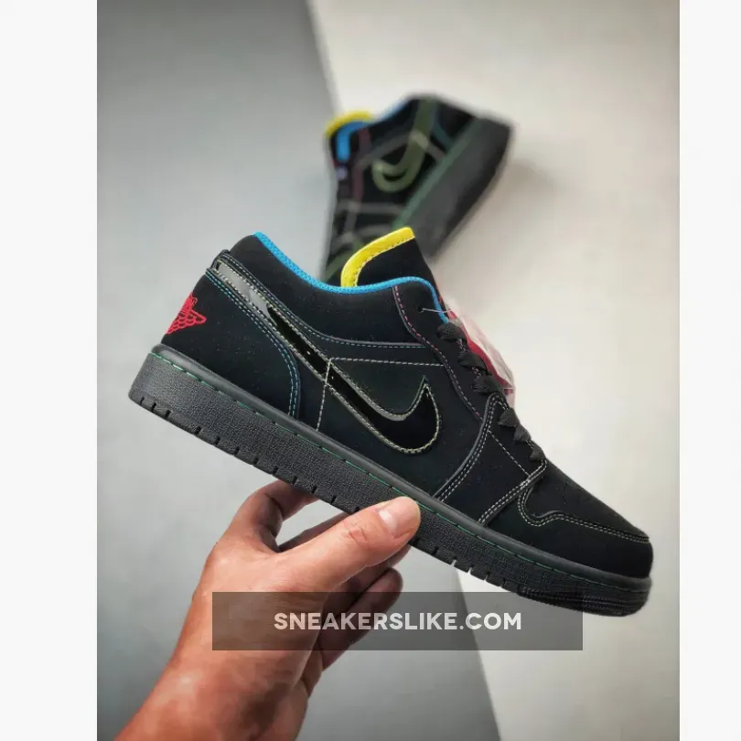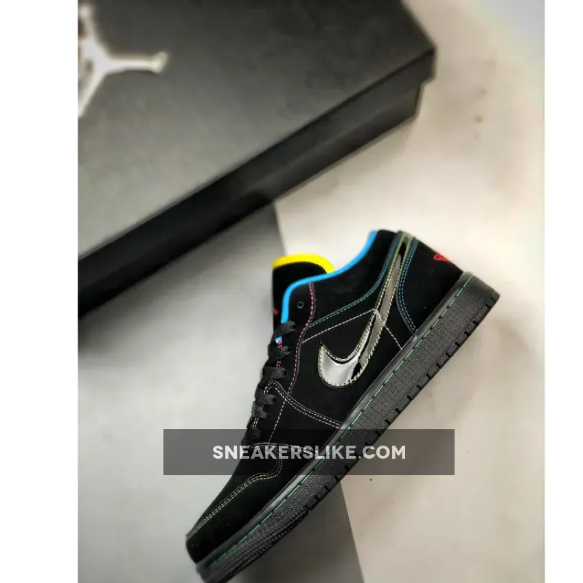 the Air Jordan 1 Phat Low in a black nubuck upper with a glossy faux-croc-skin swoosh and multi-colored contrast stitching.