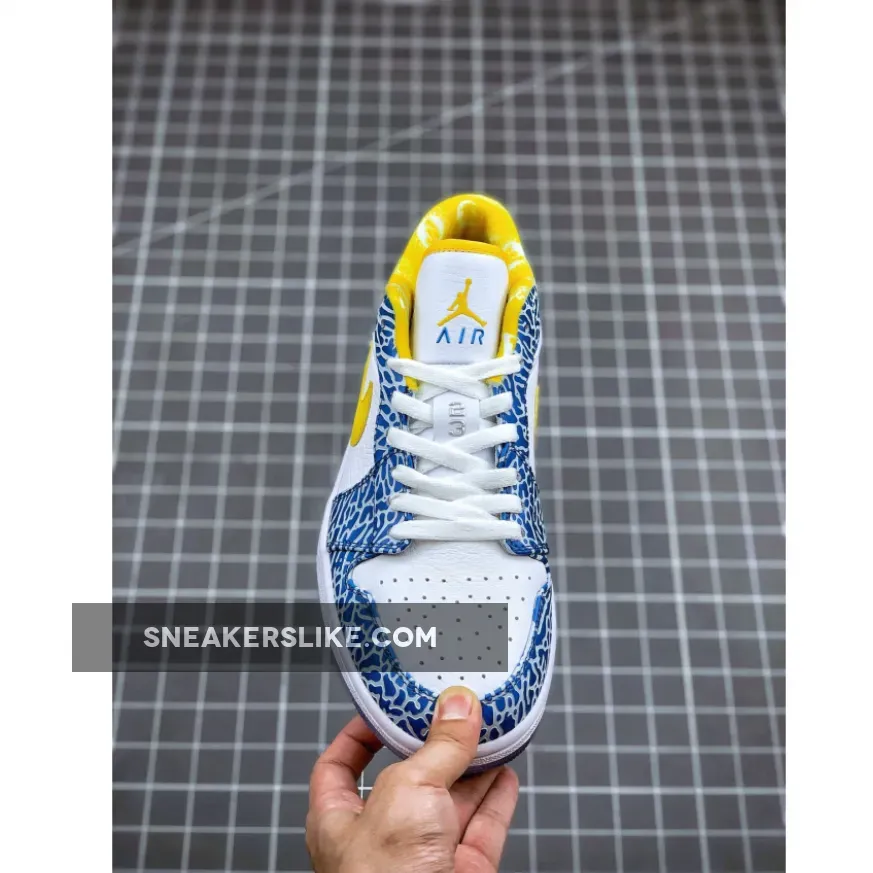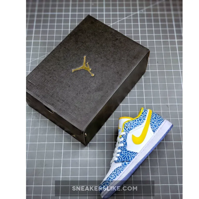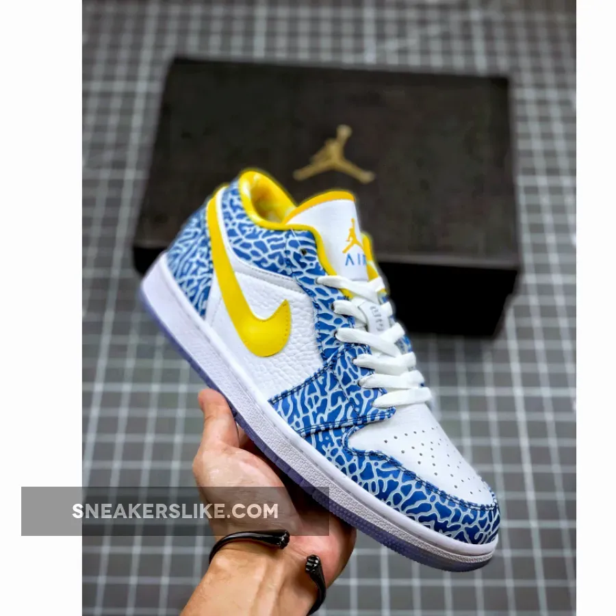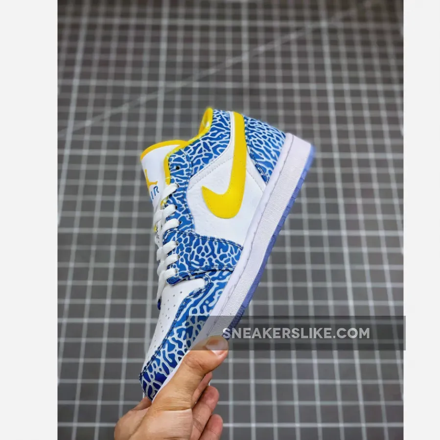 The Air Jordan 1 Low White/Chlorine Blue-Sonic Yellow West Side is part of the Air Jordan 1 (I) Regional Package, which has a pair of Air Jordan 1 (I) for each point on the compass. They were release alongside a number of Air Jordan 1 (I)‘s, and feature a white and blue upper with elephant print throughout the shoe’s upper, remnant of the Air Jordan 3 (III).