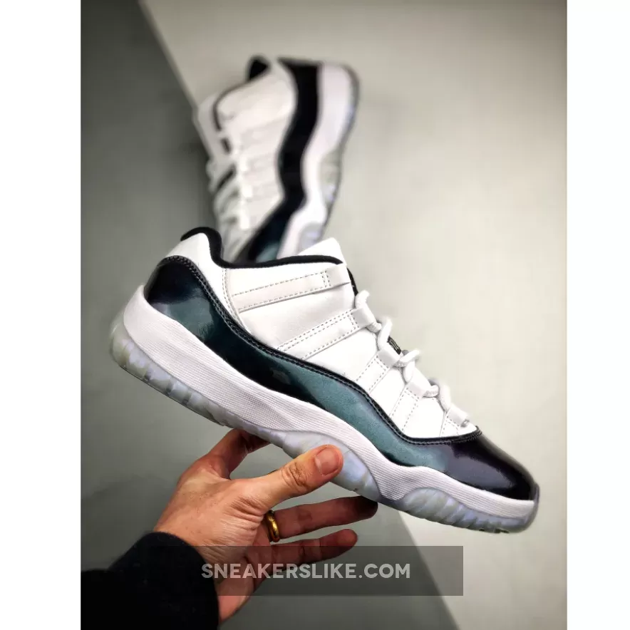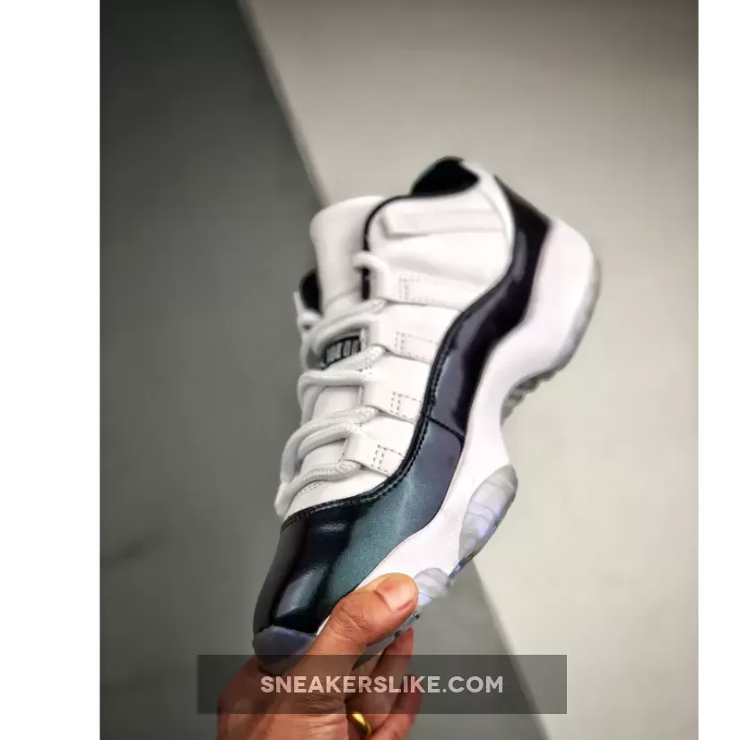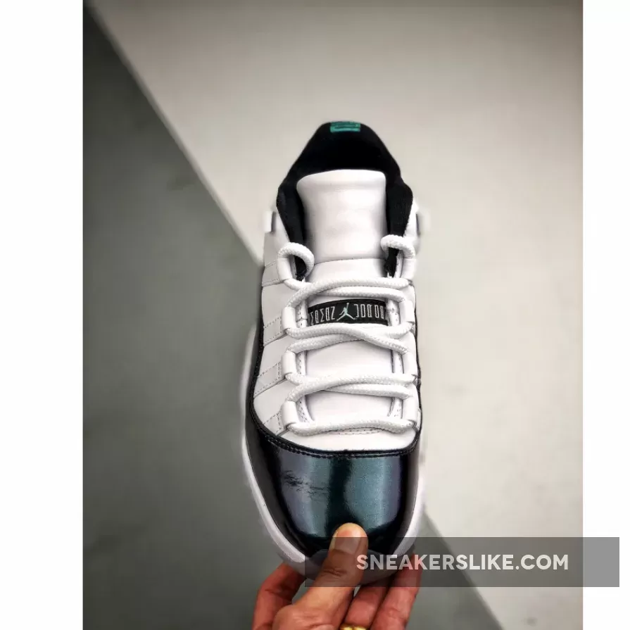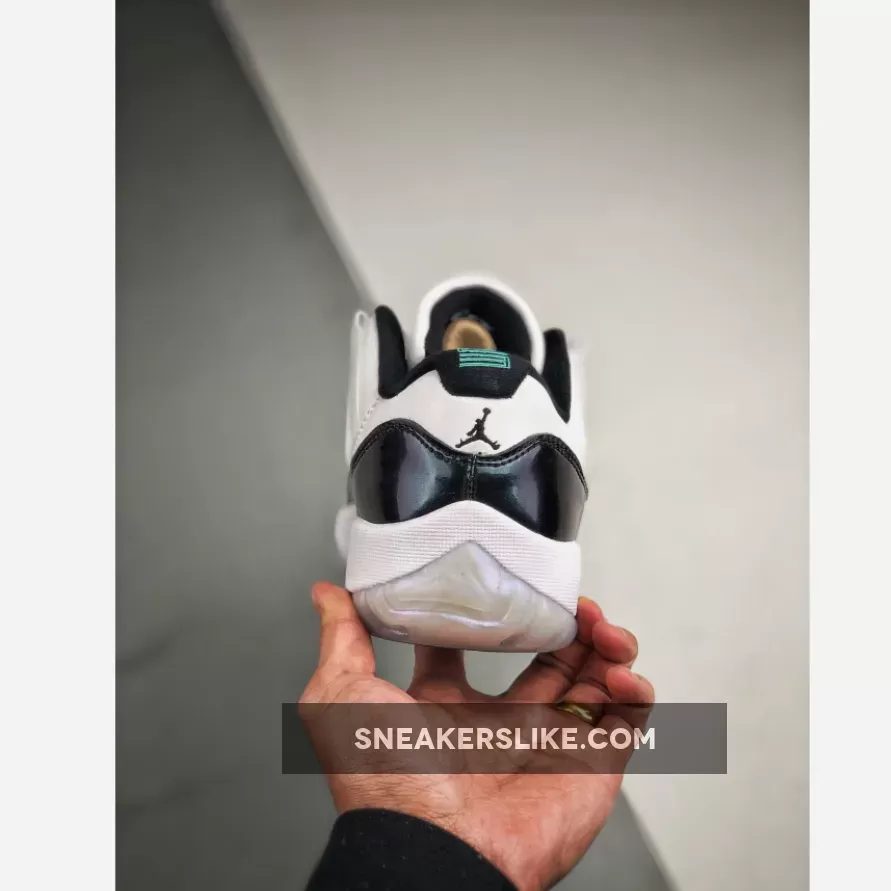The instantly recognizable patent leather rand found on the Air Jordan 11 gets updated for this ‘Emerald’ colorway with a shiny iridescent finish. The Air Jordan 11 Retro Low ‘Emerald’ swaps out the ballistic mesh traditionally found on its high-top counterpart for a premium all-leather build.
