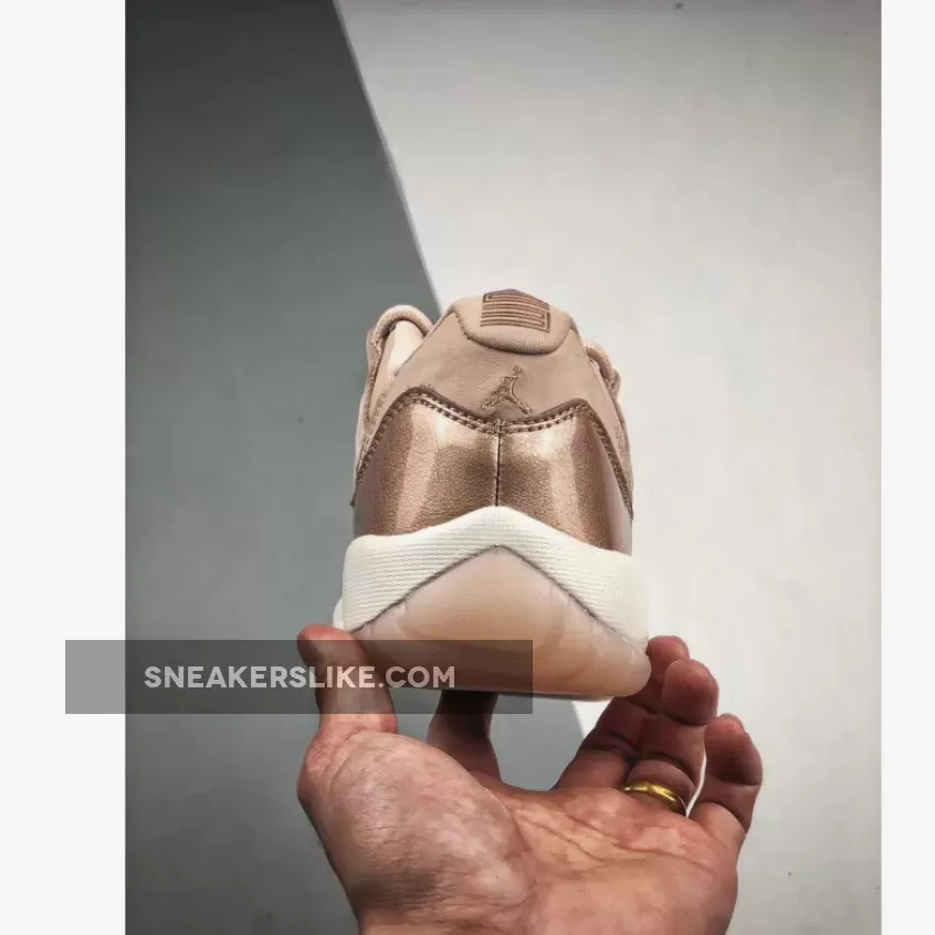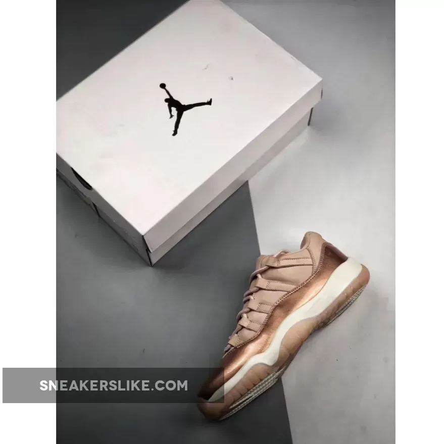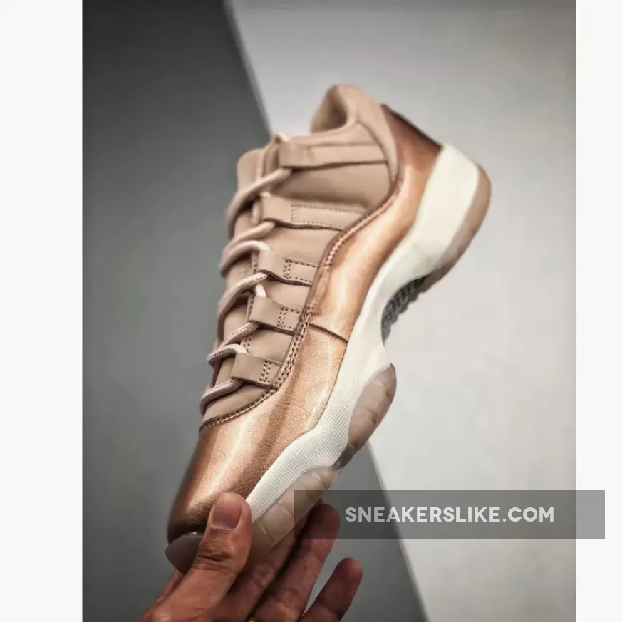 Dressed in Rose Gold-like color scheme. This low-top Air Jordan 11 ditches the usual mesh upper with a new constructed build. Highlighted with its Metallic Red Bronze patent overlay, atop a White midsole and Pink-tinted translucent
