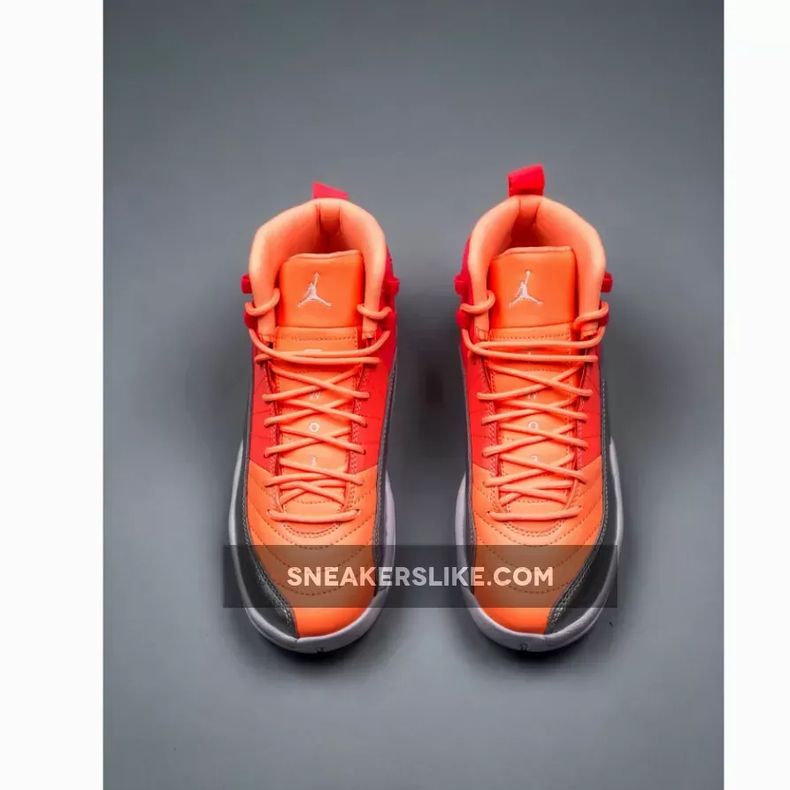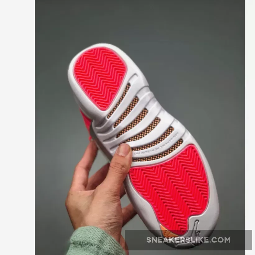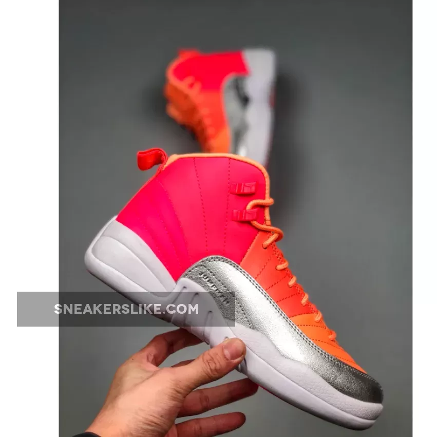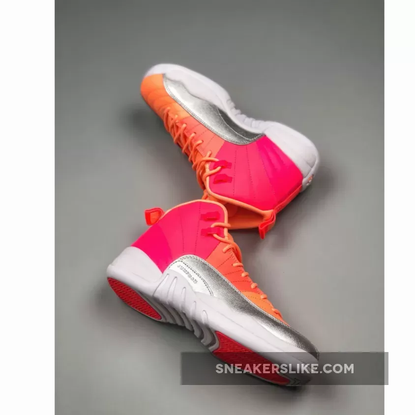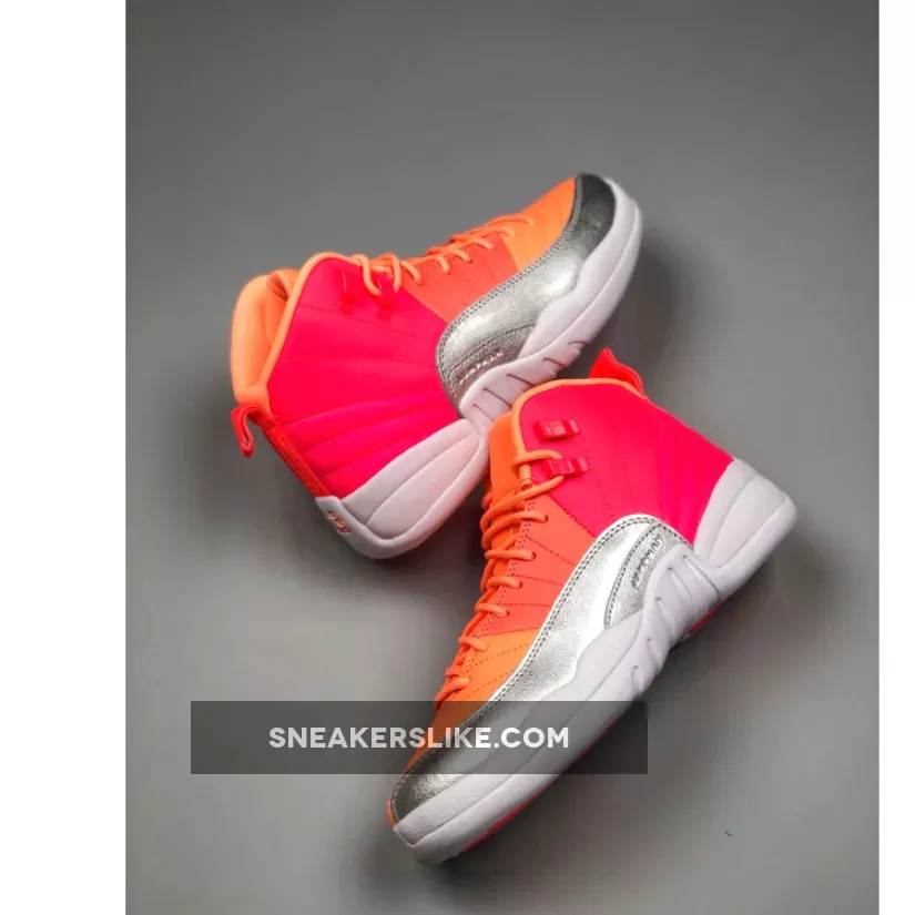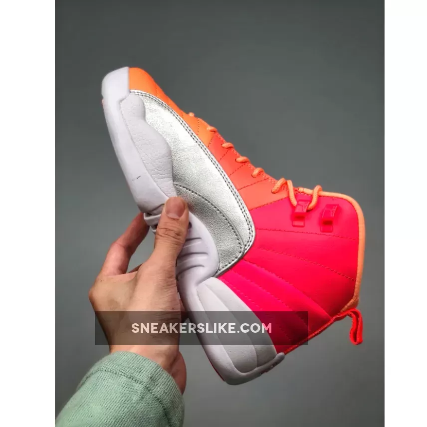 Dressed in a Racer Pink, Hot Punch, Bright Mango, and White color scheme. This Air Jordan 12 is highlighted with a tricolored upper in Orange, Punch, and Pink hues with Silver overlays.