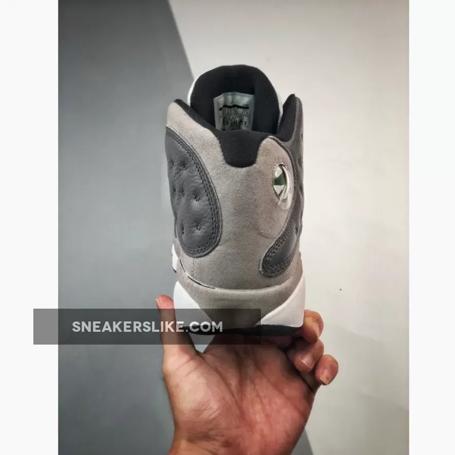 Dressed in a Atmosphere Grey, White, University Red and Black color scheme. This Air Jordan 13 features a Dark Grey leather upper with a lighter shade of Grey on the mudguard and riding up the heel. A White leather toe, Black lining, Red accents and the models signature hologram heel logo completes the design.