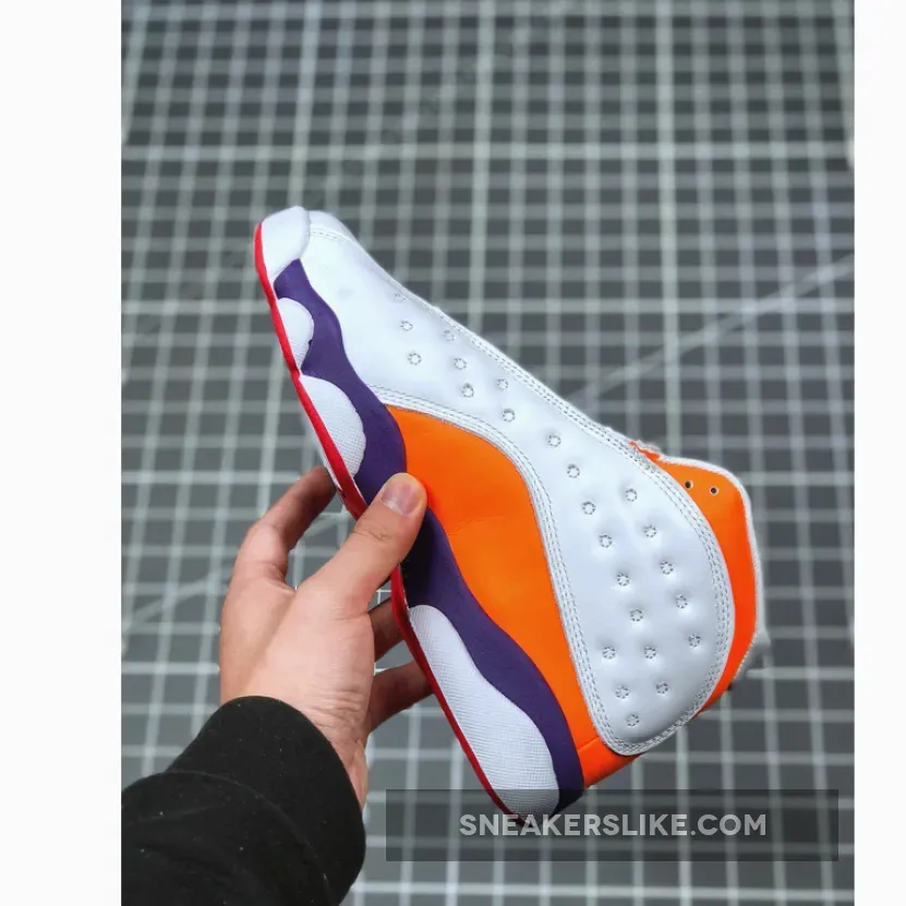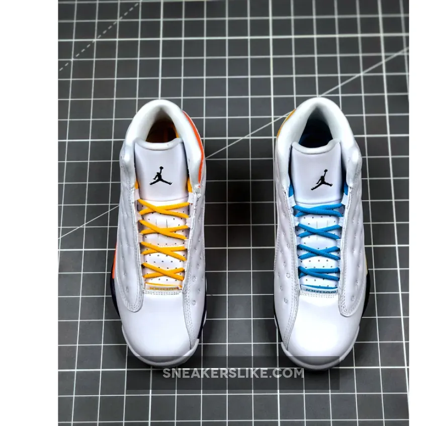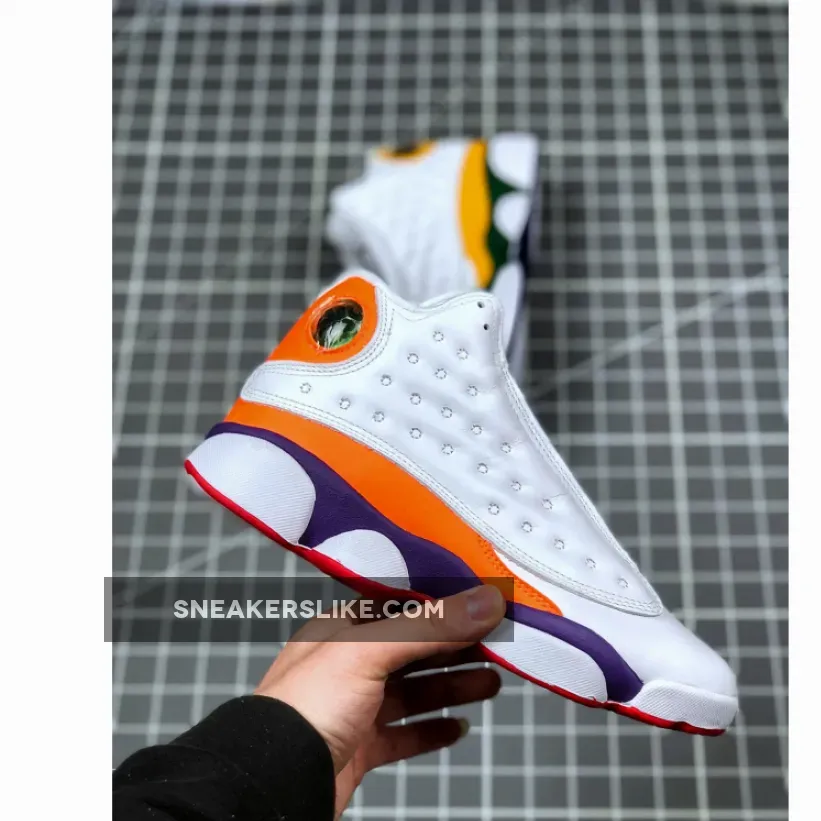 Dressed in a White, Black, Court Purple, and Total Orange color scheme. This Air Jordan 13 features a White-based upper on both shoes, while the right is accented in Orange and Purple with Yellow laces, and the left highlighted in Yellow and Green with Blue laces.