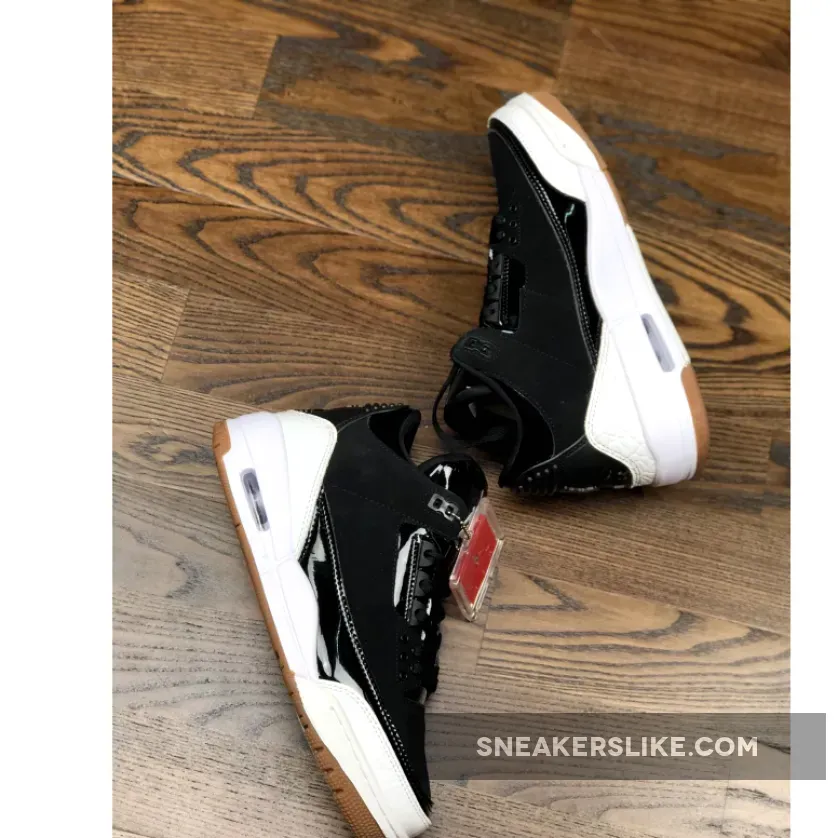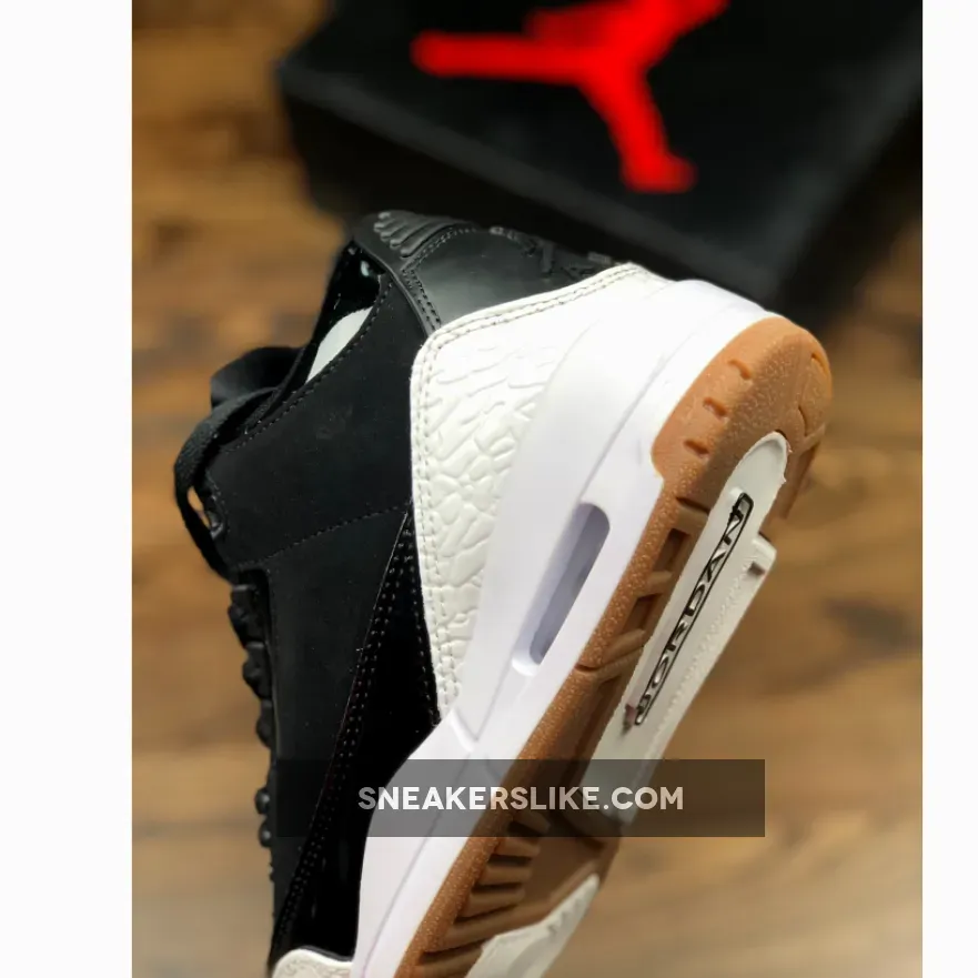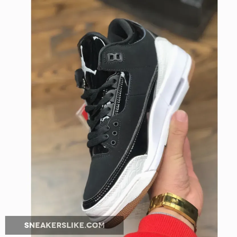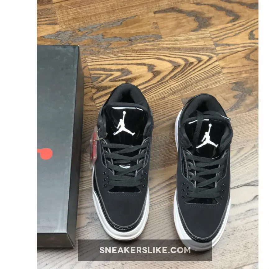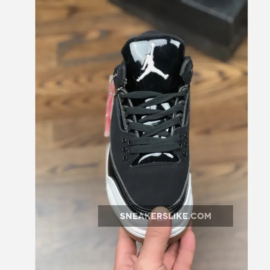 Dressed in a Black and White color scheme. This Air Jordan 3 features a Black upper with patent leather on the tongues and overlays. White detailing appears on the Jumpman branded tongues, overlays on the toe and heel as well as the midsole. A Gum rubber outsole finishes off the design.