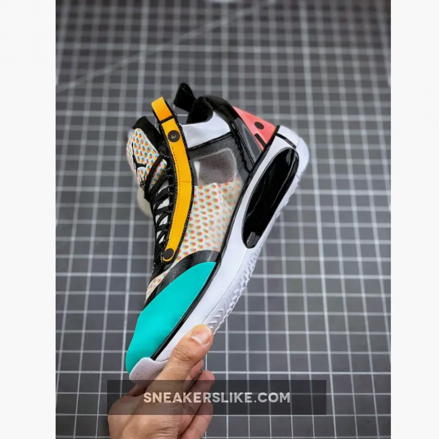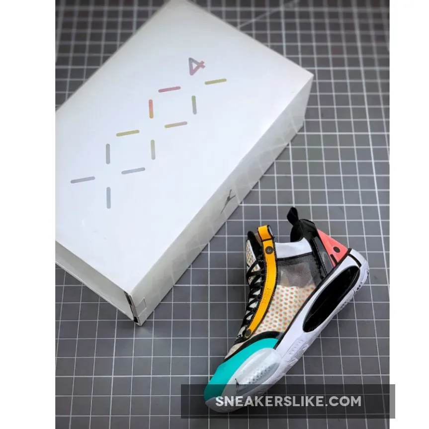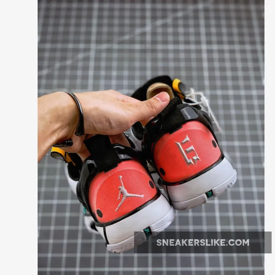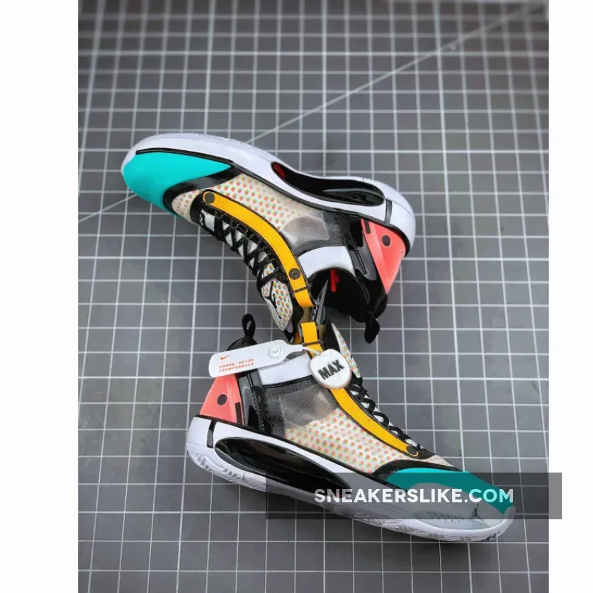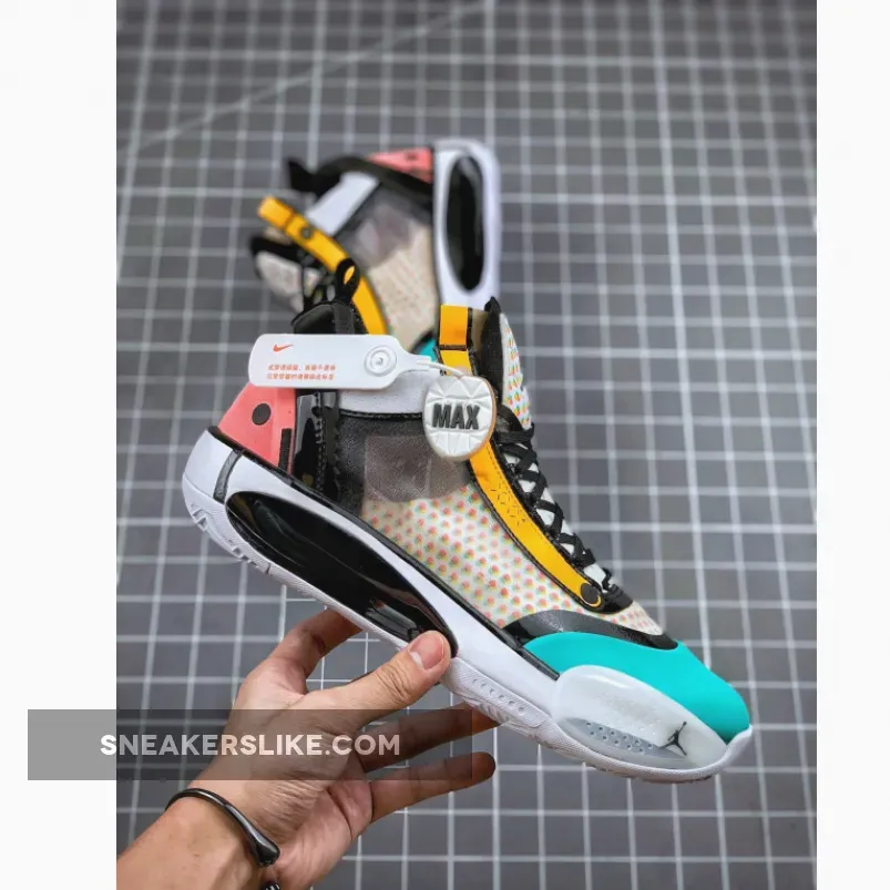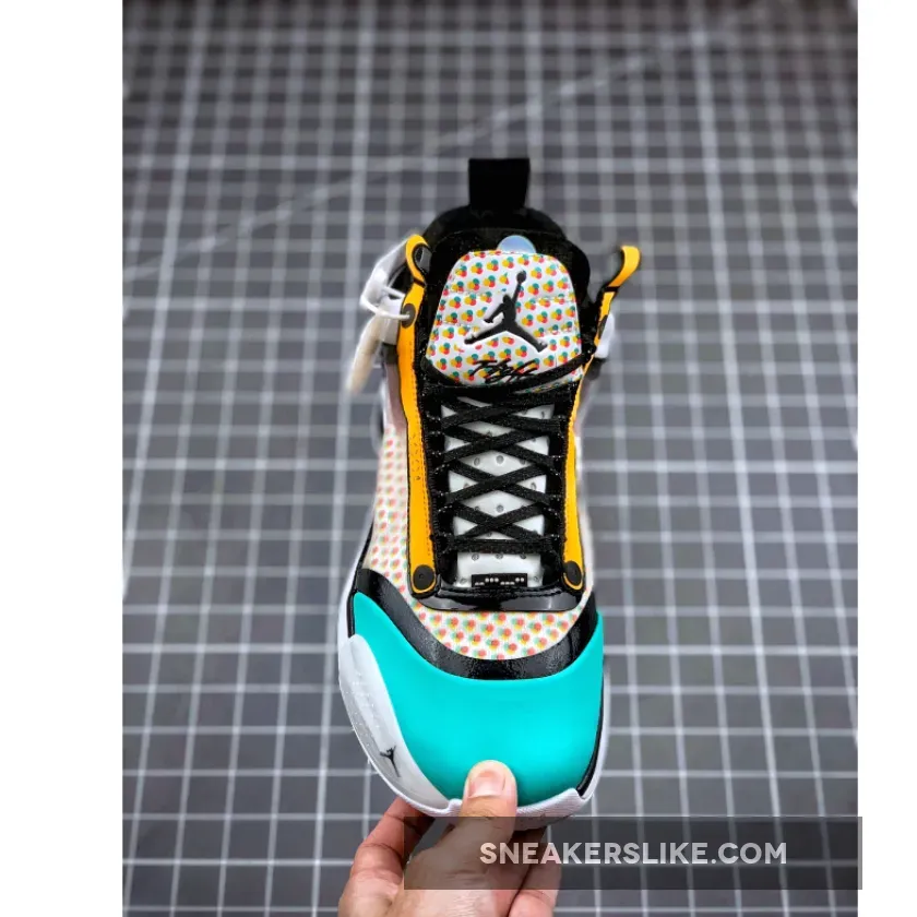 This offering of the low-top Air Jordan XXXIV sports a colorful color blocking with special characters appearing on the inner tongues. Additional details includes Guo’s logo on the right heel in Silver completed with a White rubber sole.