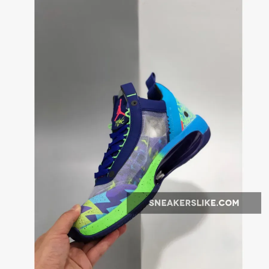 Dressed in a Regency Purple, Rage Green, Persian Violet, and Flash Crimson color scheme. This low-top Air Jordan XXXIV has a vibrant pattern similar to the “Bel-Air” Air Jordan 5 releases that extends onto its rubber outsole.