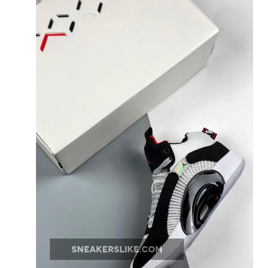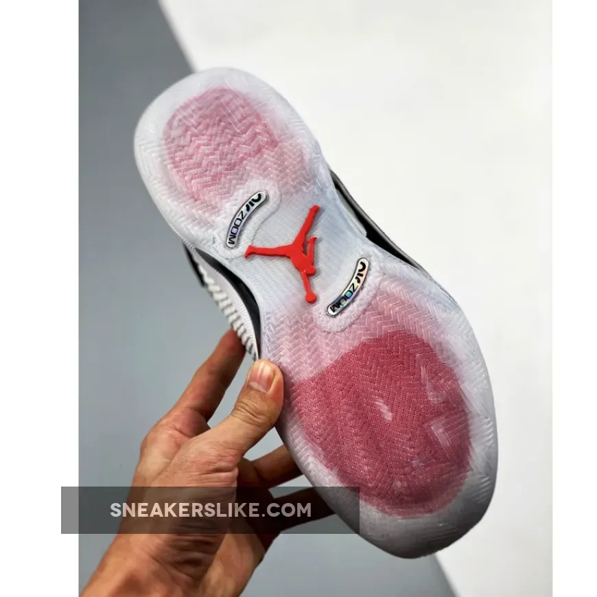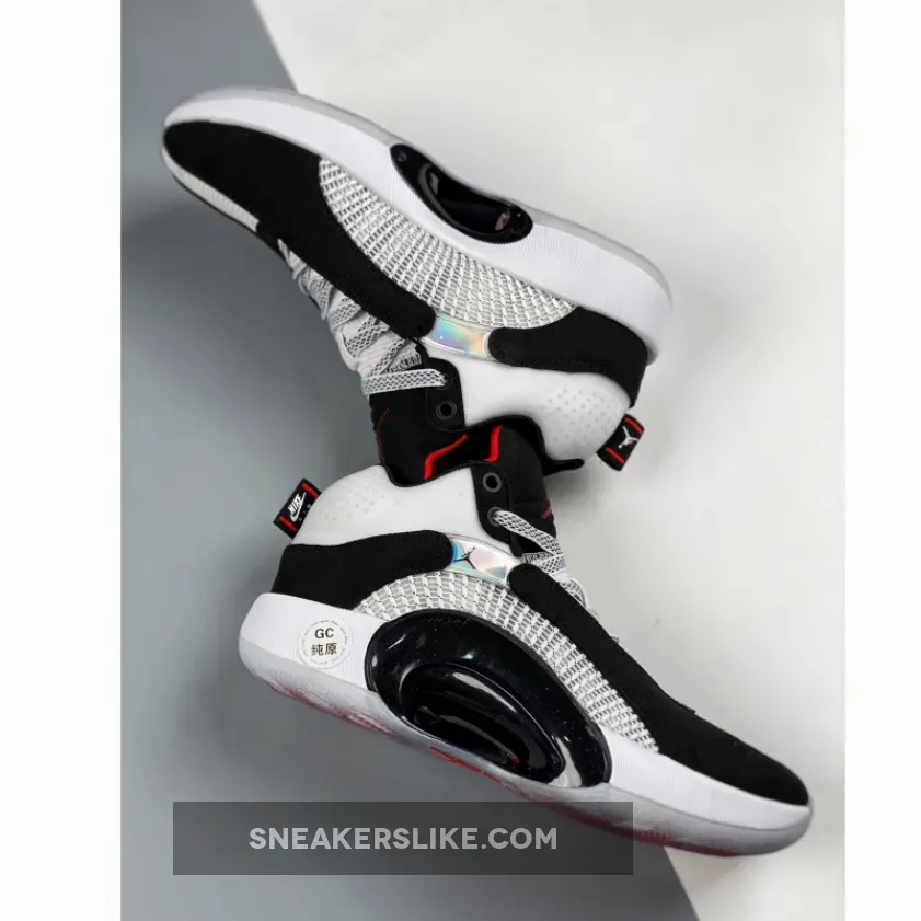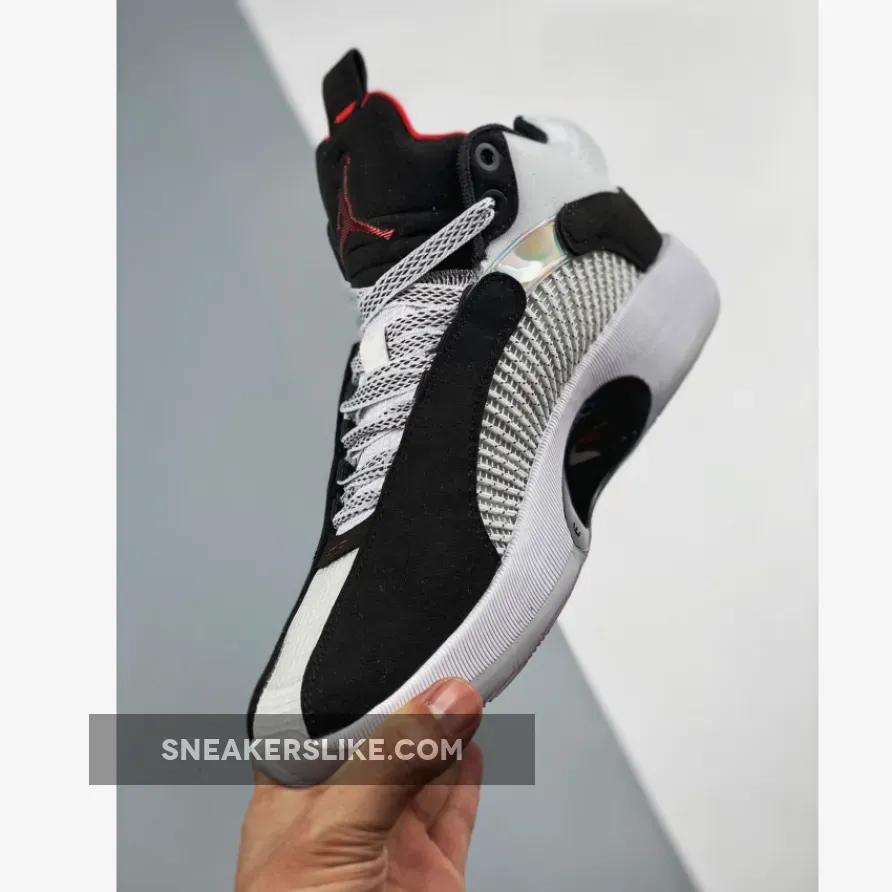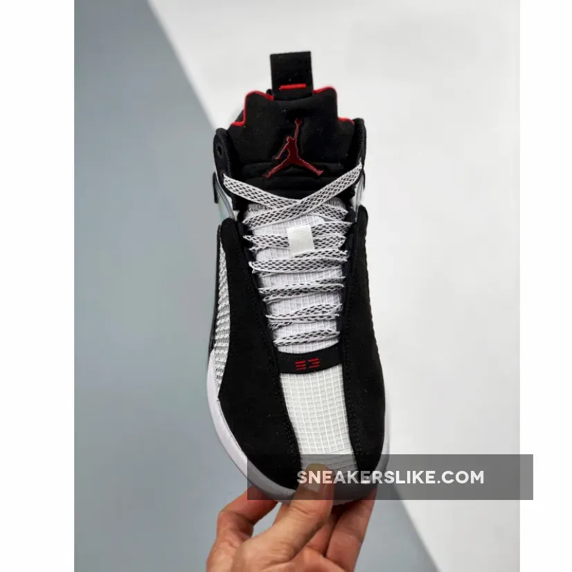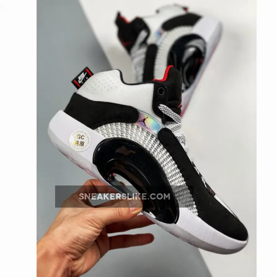 Dressed in a White, Black, and Fire Red color scheme. This Air Jordan 35 features a White upper with Black nubuck overlays.
