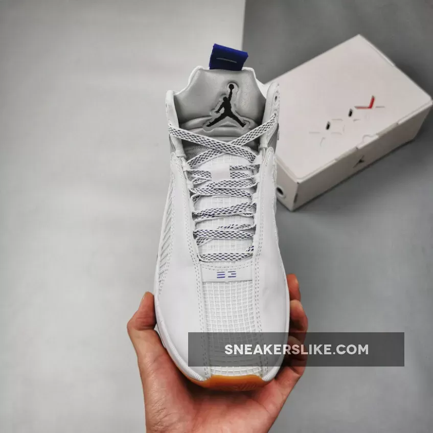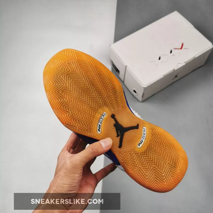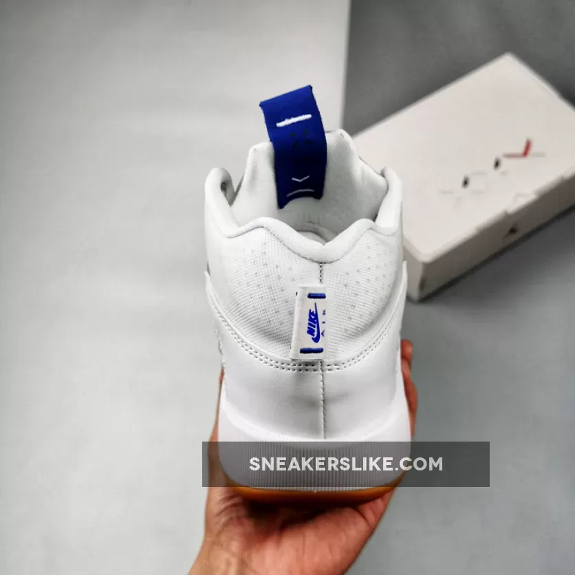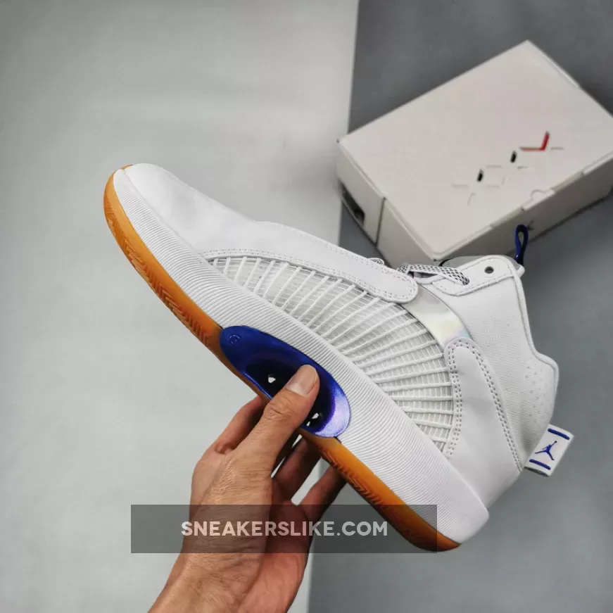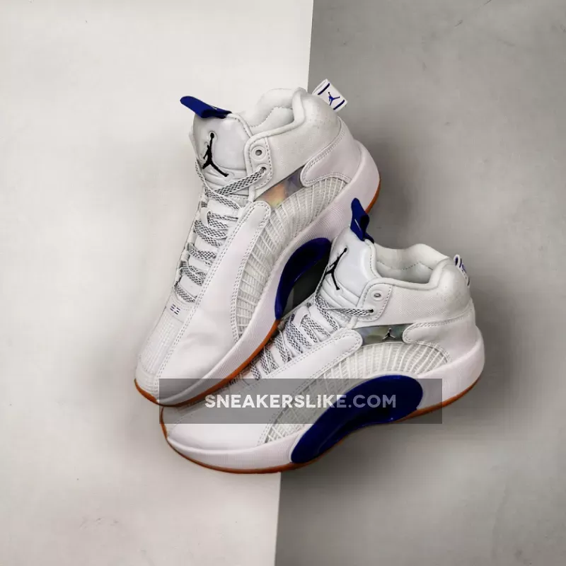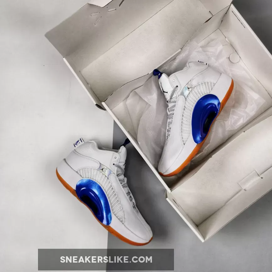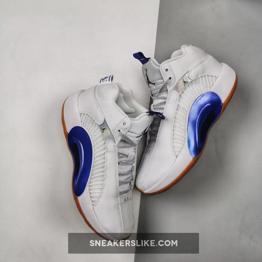 Dressed in a White, Black, Hyper Royal, and Gum Medium Brown color scheme. This Air Jordan XXXV features a White-based upper constructed in a mix of leather and mesh highlighted with iridescent detailing and Royal Blue accents.