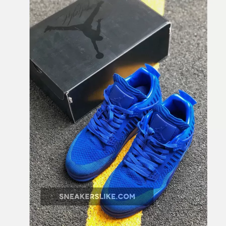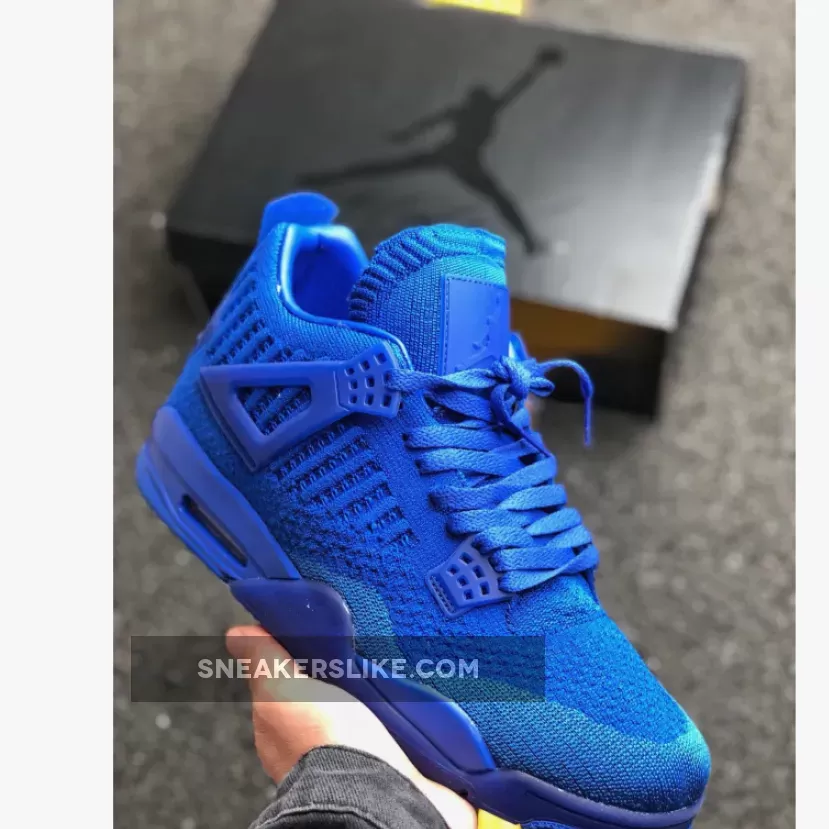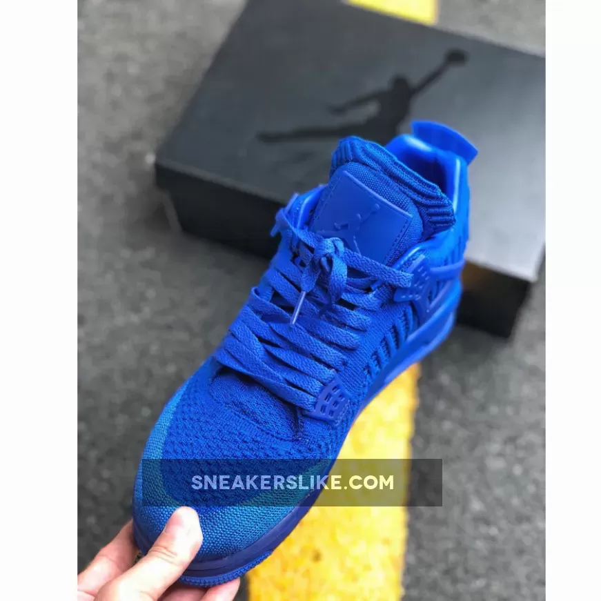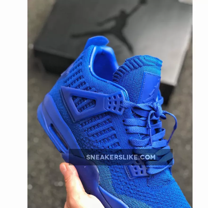 This offering of the shoe arrives in a Hyper Royal and Black color scheme. This Air Jordan 4 comes fully constructed in a Flyknit build, with matching translucent plastic overlays on the wings, tongues, and heels.