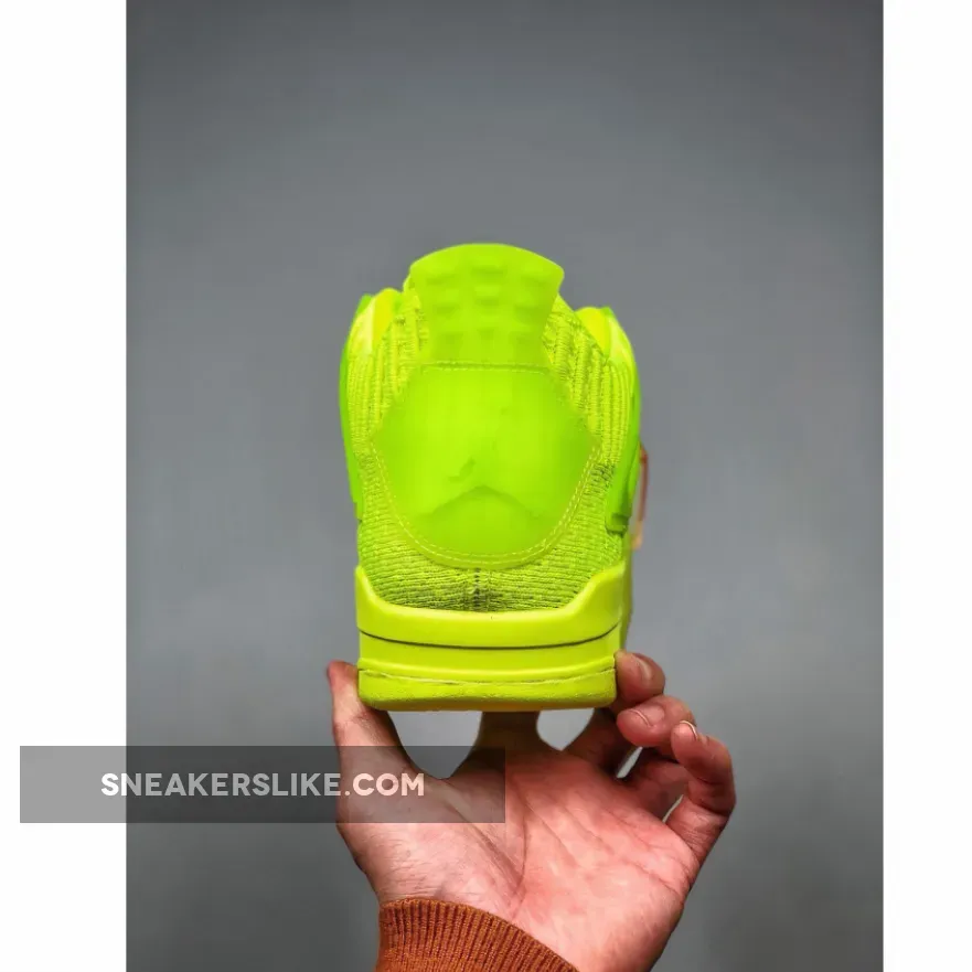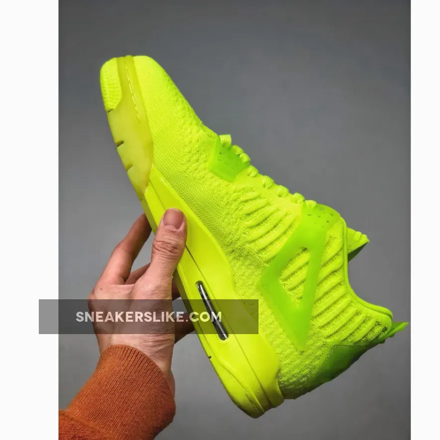 This offering of the shoe arrives in a Volt and Black color scheme. This Air Jordan 4 comes fully constructed in a Flyknit build, with matching translucent plastic overlays on the wings, tongues, and heels.