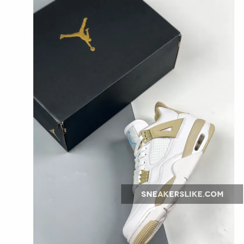 Dressed in a dull-looking White, Boarder Blue, and Light Sand color scheme. This Air Jordan 4 features a White tumbled leather upper with Light Sand and Blue contrasting accents throughout. You can bet that a lot of guys will be trying to squeeze their feet into women’s sizes when these launch.