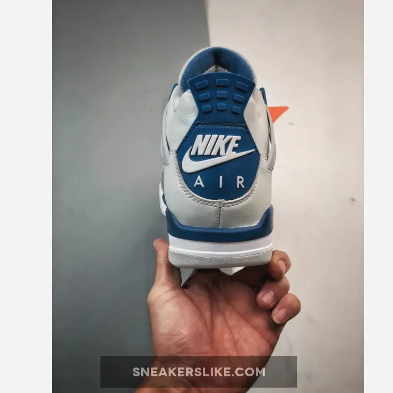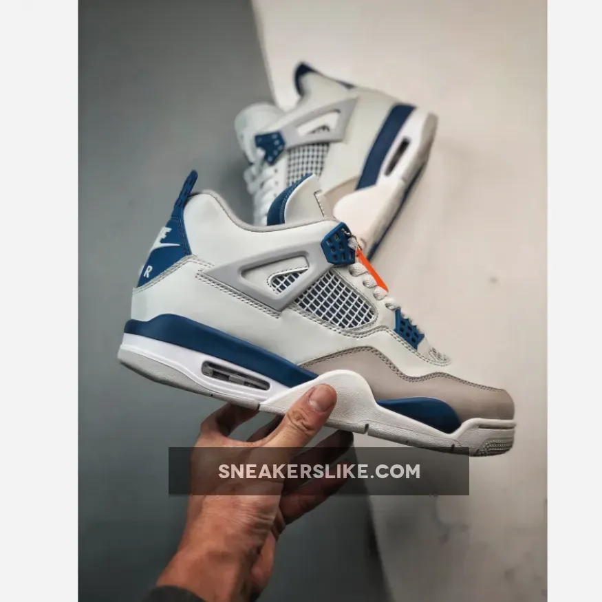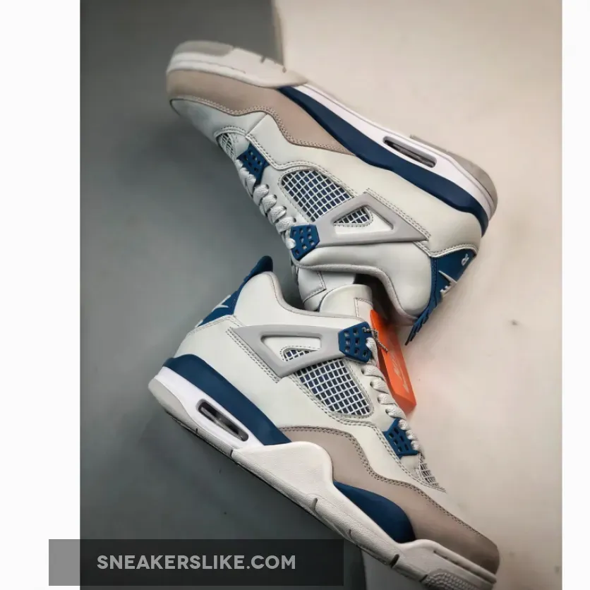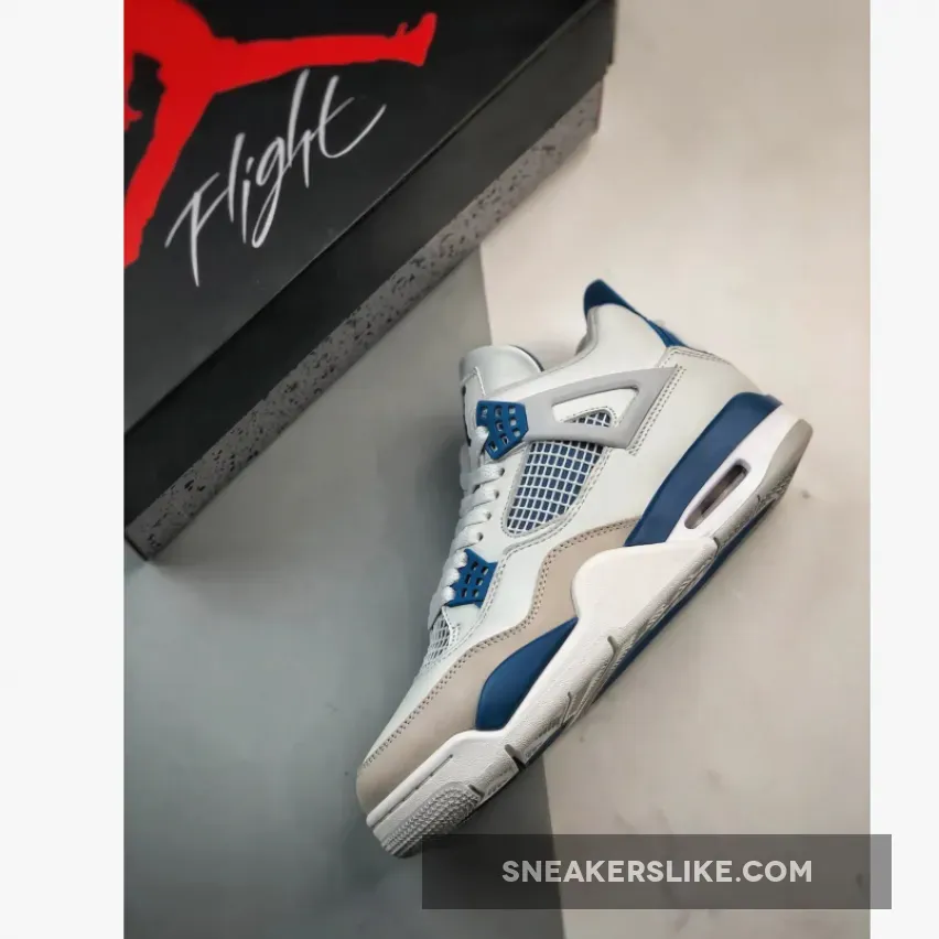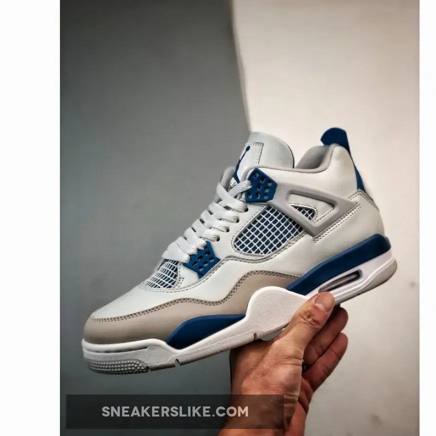 The Air Jordan 4 showcases a timeless color scheme consisting of Off-White, Military Blue, and Neutral Grey. Its upper is crafted from Off-White leather with overlays in Neutral Grey adorning the toe area. The quarter panel is equipped with a “Military Blue” underlay and topped off with the AJ4’s signature net. The design is elevated by Military Blue accents on the eyelets, midsole, heel tabs, and Jumpman logos on the tongues. Adding to the authenticity, the heels bear “Nike Air” branding in White, while a White, Blue, and Grey rubber outsole completes the overall aesthetic.