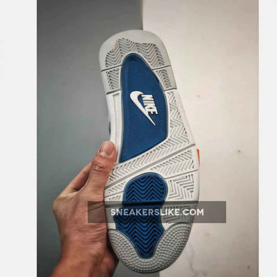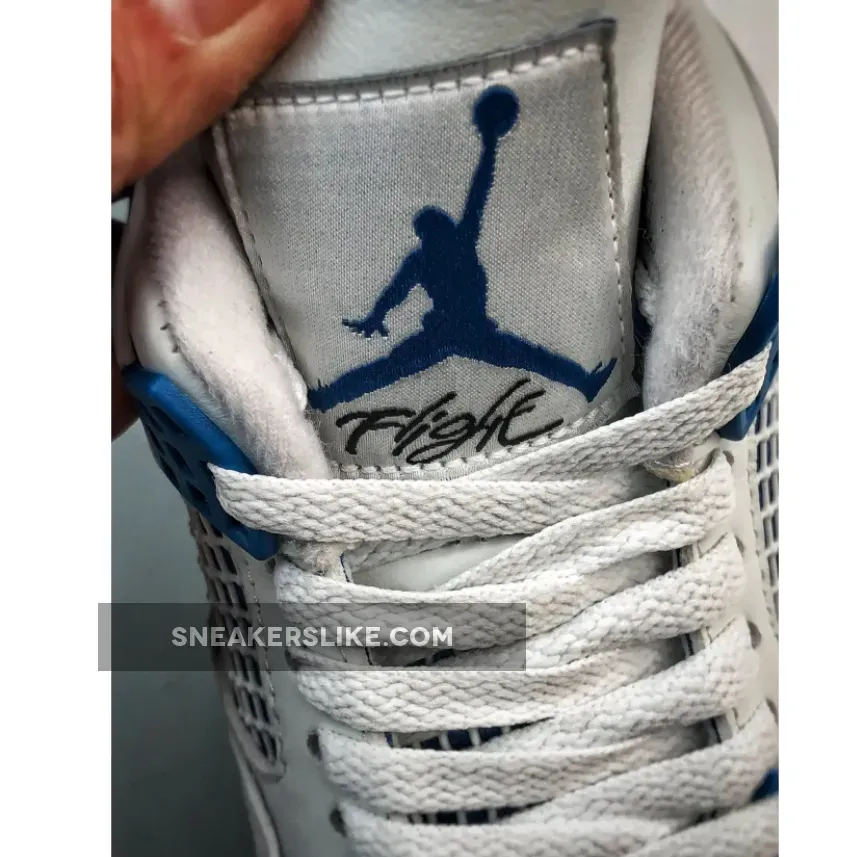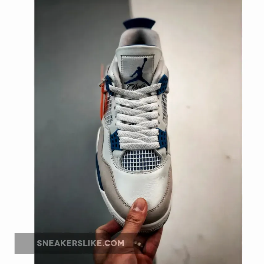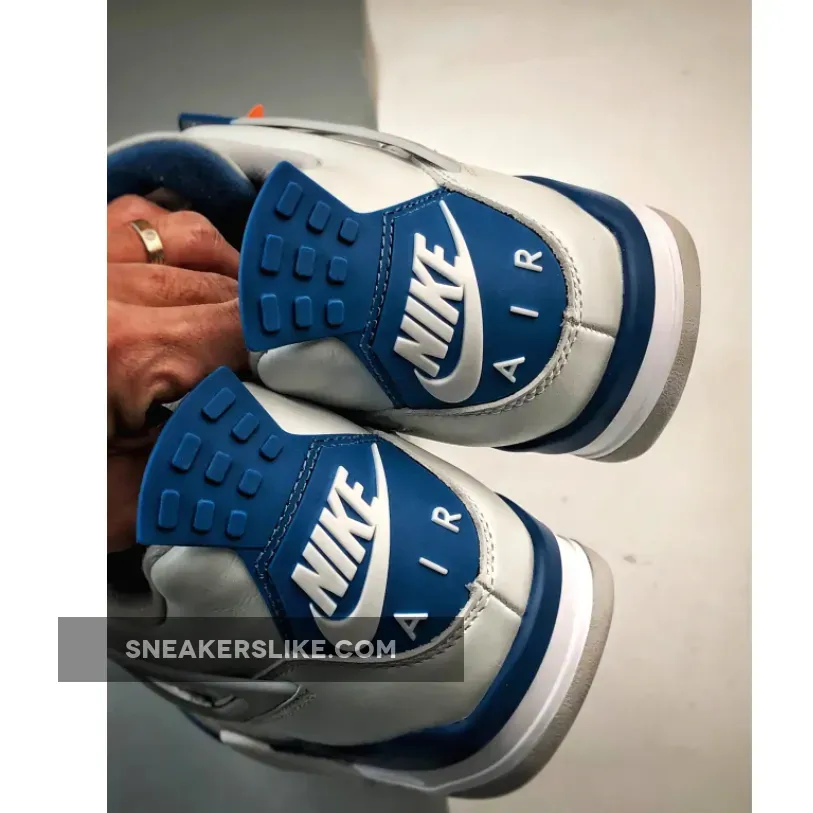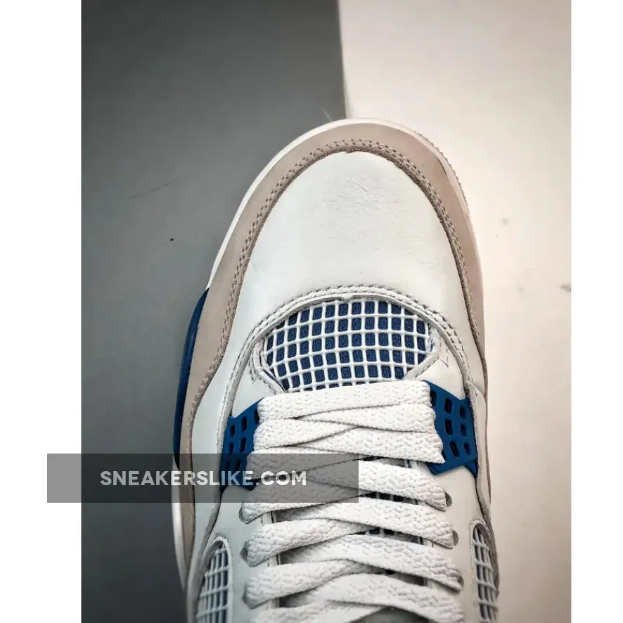 The Air Jordan 4 showcases a timeless color scheme consisting of Off-White, Military Blue, and Neutral Grey. Its upper is crafted from Off-White leather with overlays in Neutral Grey adorning the toe area. The quarter panel is equipped with a “Military Blue” underlay and topped off with the AJ4’s signature net. The design is elevated by Military Blue accents on the eyelets, midsole, heel tabs, and Jumpman logos on the tongues. Adding to the authenticity, the heels bear “Nike Air” branding in White, while a White, Blue, and Grey rubber outsole completes the overall aesthetic.