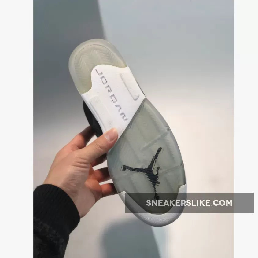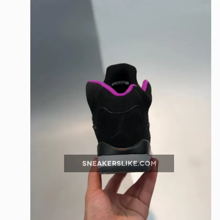 This Air Jordan 5 GS features a full Black nubuck upper with a ribbed textured tongue. Deadly Pink accents is seen on the inner tongue and Shark Teeth overlaying the White midsole.