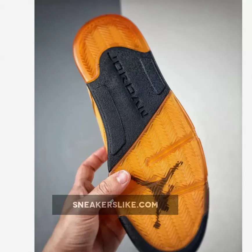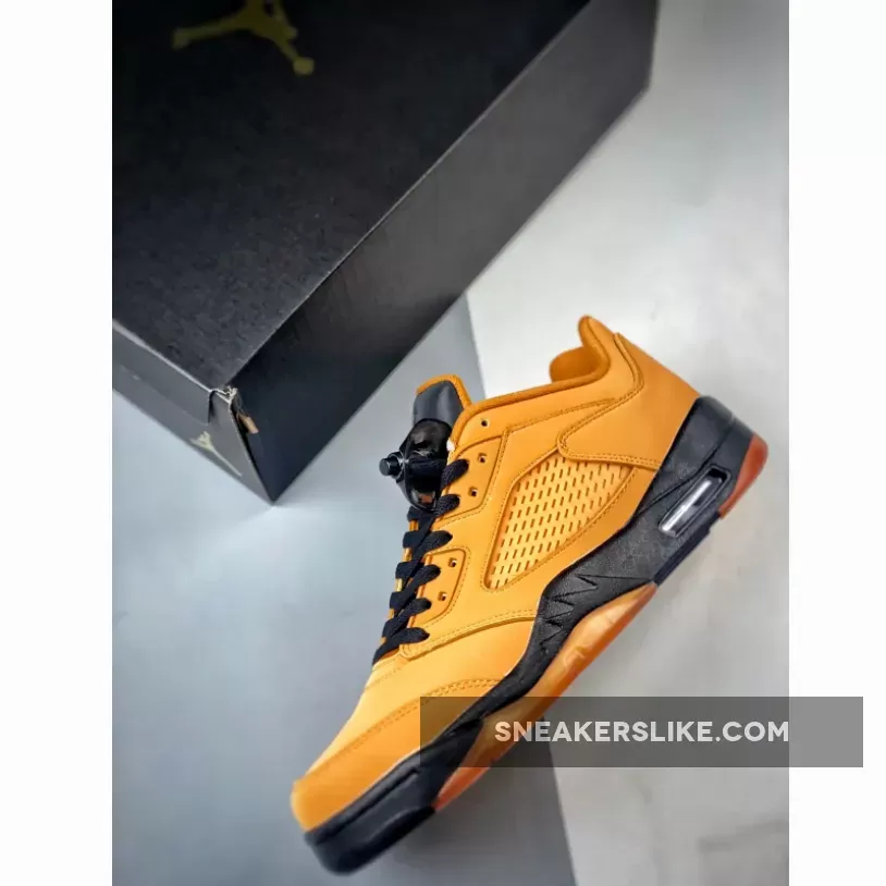 This low-cut AJ5 has a smooth leather upper in the titular dark yellow Chutney from heel to toe. Even the mid-panel translucent TPU mesh netting also follows the same hue. Bright red joins the mix of colours on the lace-lock accent and the embroidered Jumpman on the tongue. The leather tongues are in contrasting black. Utilizing Chutney on the base and liner while Black adorns the tongue, laces, and midsole. Finishing the look is a translucent outsole.