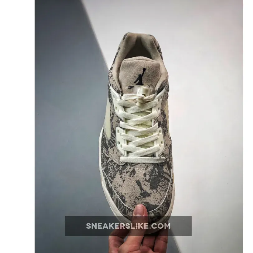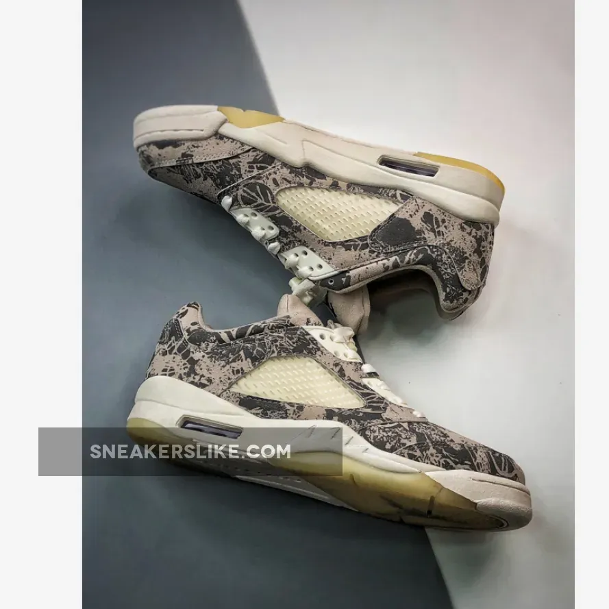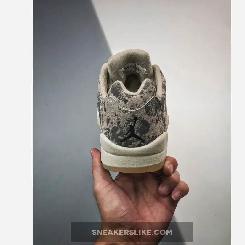If you’re a Jordan fan, you probably have a couple of Air Jordan 5s in your collection, but if you haven’t maybe the Air Jordan 5 Low “Expression Cream Grey” will convince you. Originally released in 1990, the high-top version of the Air Jordan 5 was inspired by World War 2 fighter jets, and although only its initial run only saw four colourways, it’s become a staple Jordan silhouette ever since. As with most Jordan releases, a number of new colourways and mash-ups followed, before a low-top version also debuted later down the line. This AJ5 Low “Expression Cream Grey” sees the low-top model come smothered in suede, as opposed to the smooth leathers that made up the original pairs. Neutral hues of cream and brown form an all-over camo-like pattern, whilst cream accents decorate the lacing unit and mesh side panels. Jordan branding appears on the tongue and insoles and takes on a rich, chocolate brown shade.