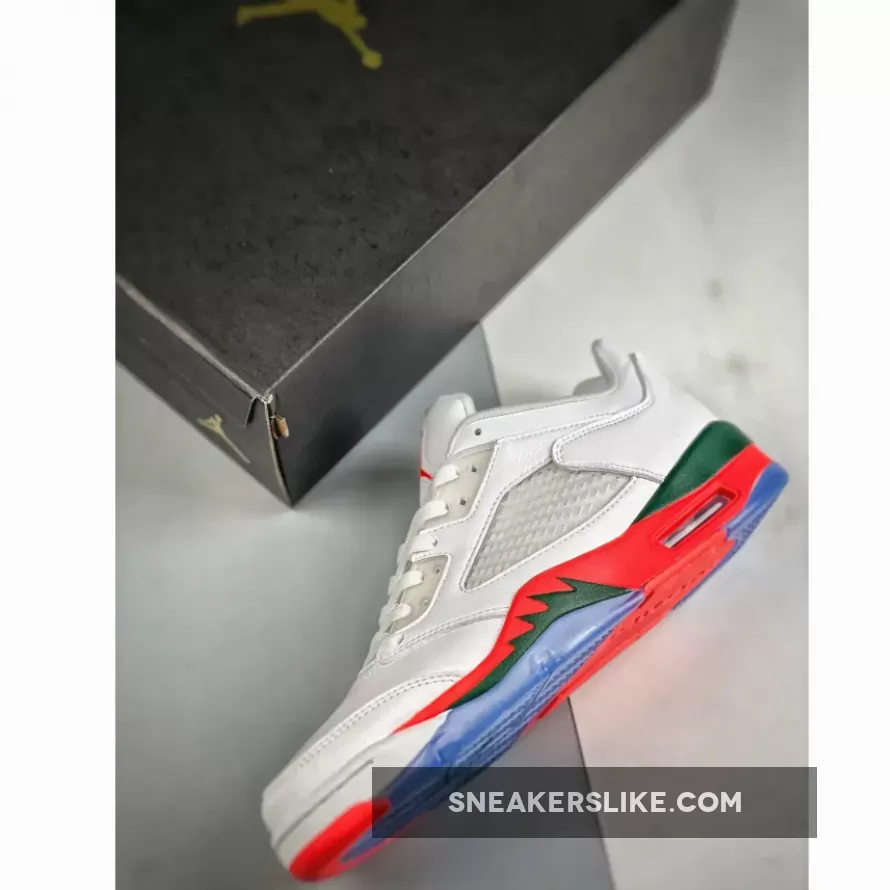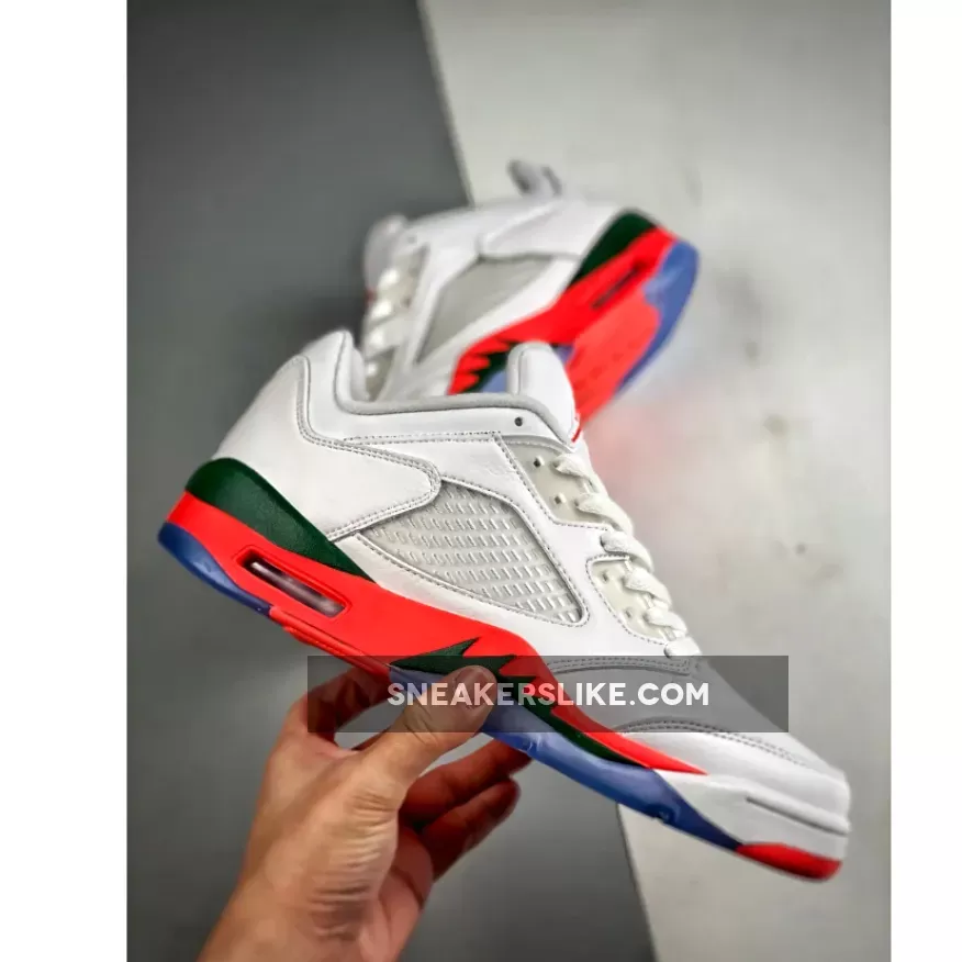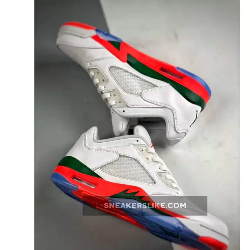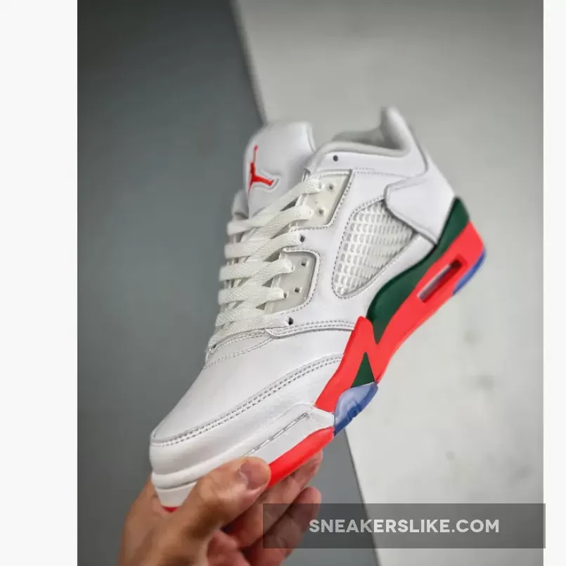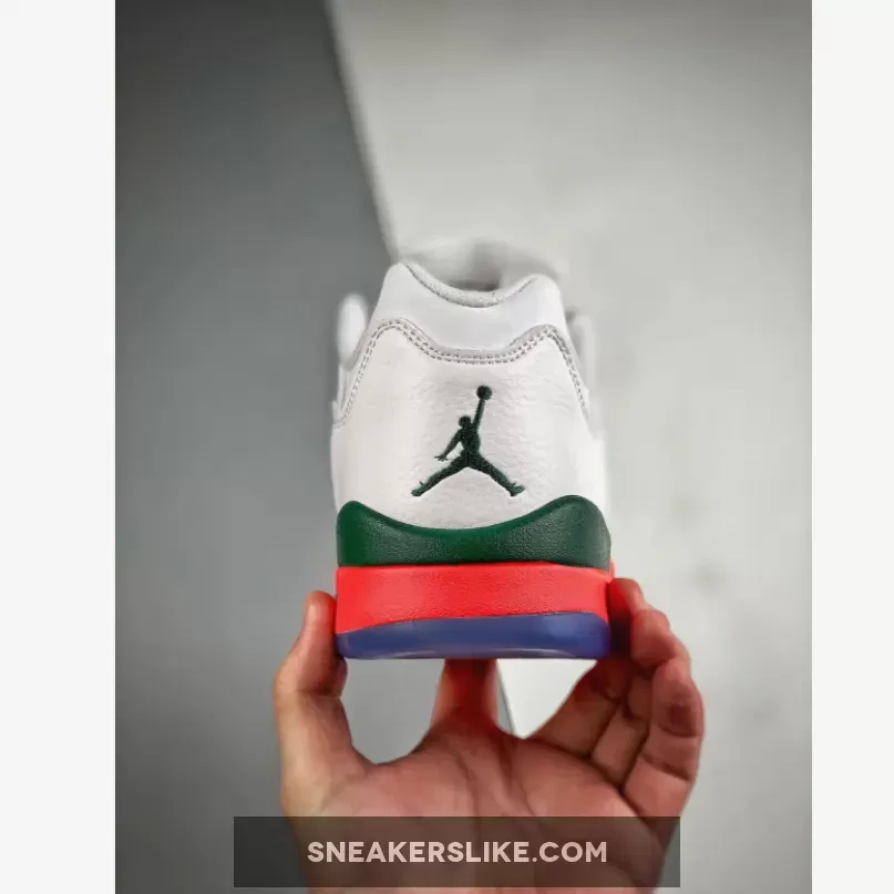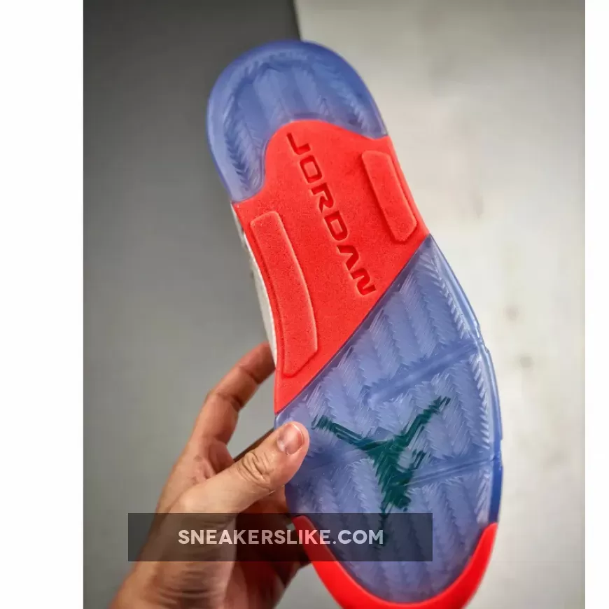 The standard Air Jordan 5’s enduring features, such as the plastic fence on the tongue as well as midfoot, continue to be evident. The Jumpman emblem and lace lock feature a vibrant animated orange color, while green accents add vibrancy to the tongue padding and sockliner.