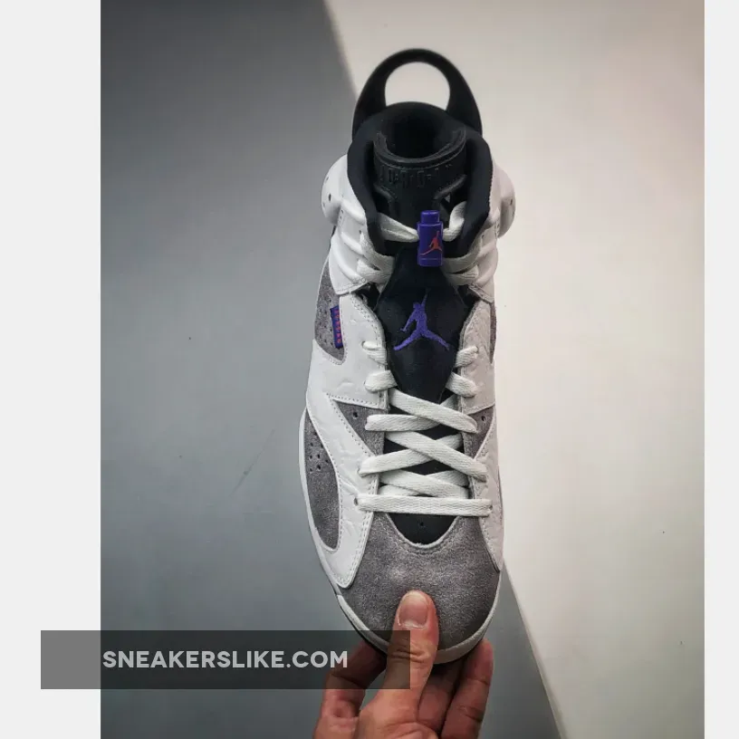 Now the Air Jordan 6 is the latest retro model to receive the “Flint” makeover. The shoe sports a White leather upper with Grey suede underlays. Purple and Infrared are used as accents throughout, while having Black detailing, a new branding tab on the lateral side atop an icy translucent outsole.