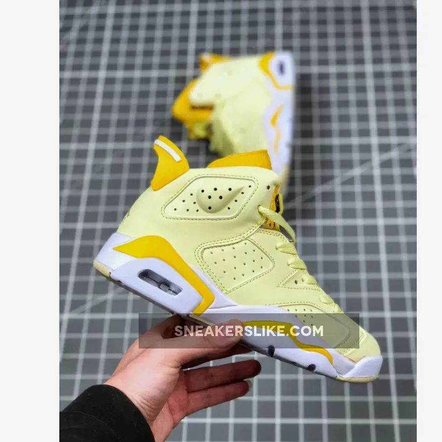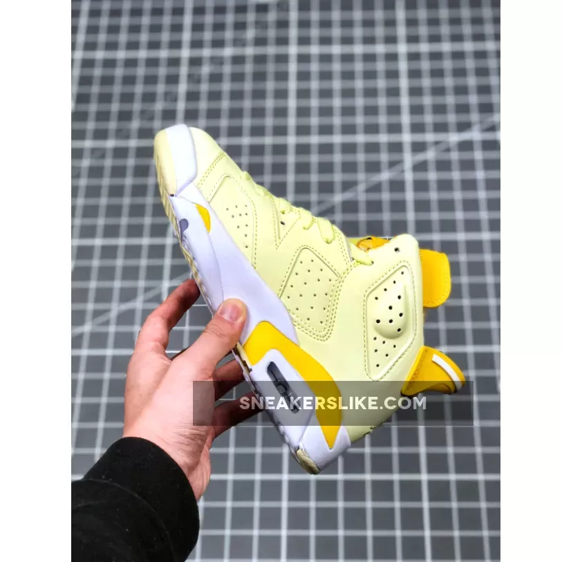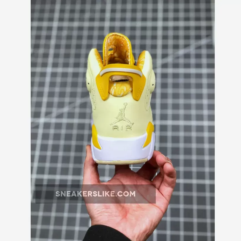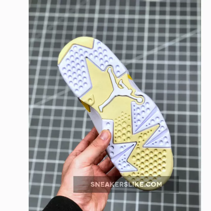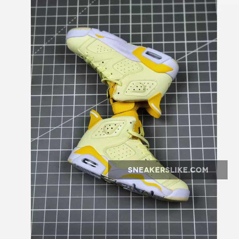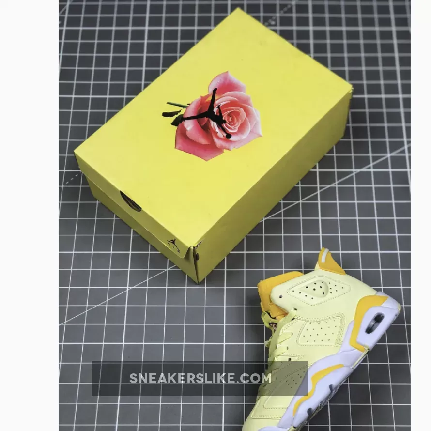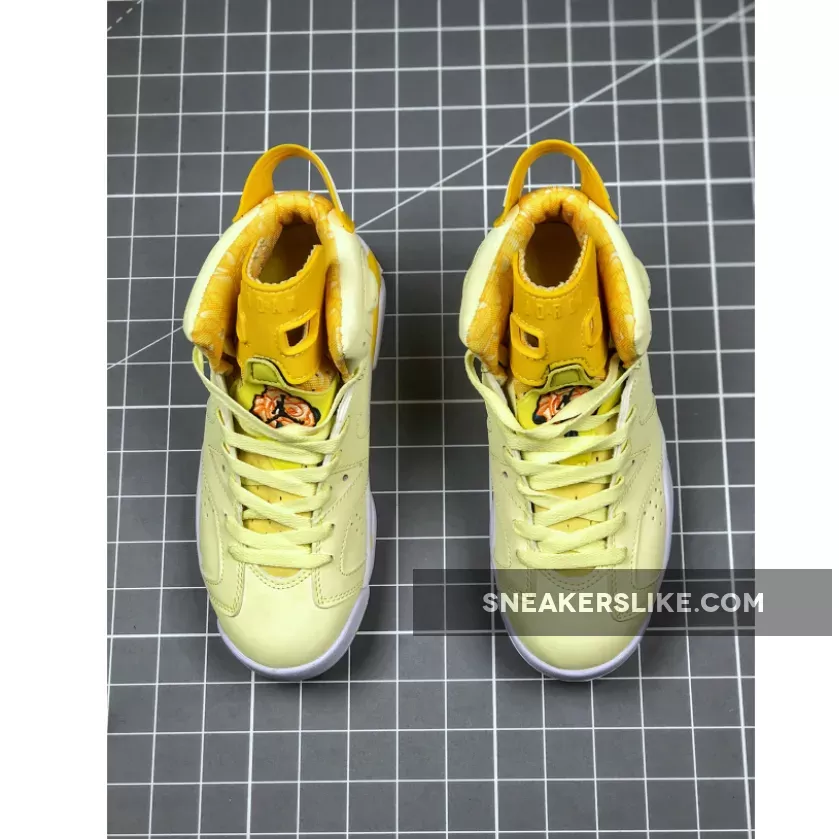 This Air Jordan 6 comes dressed in a Crimson Tint, Dynamic Yellow, Black and White color combination. Sticking out is an embroidered Yellow flower on the tongue while a Black Jumpman is placed in the middle.