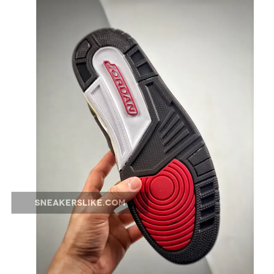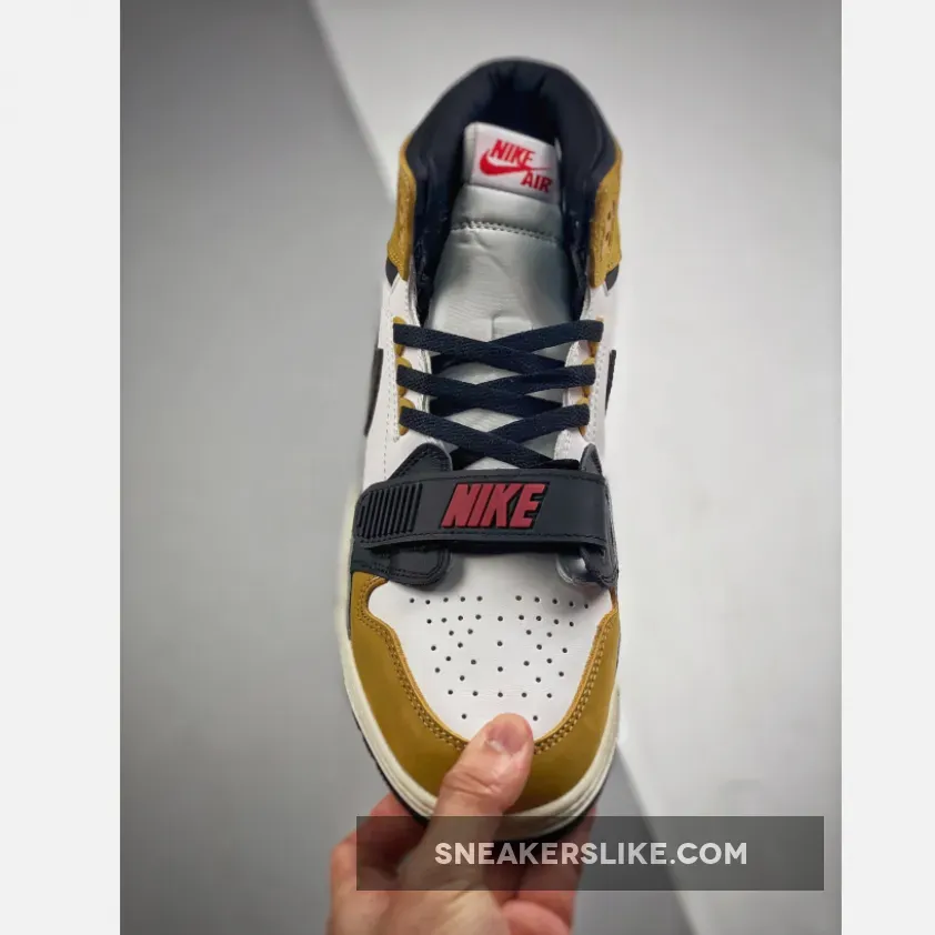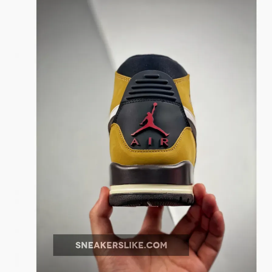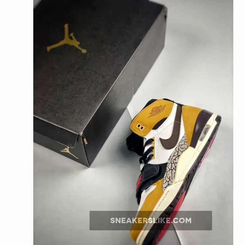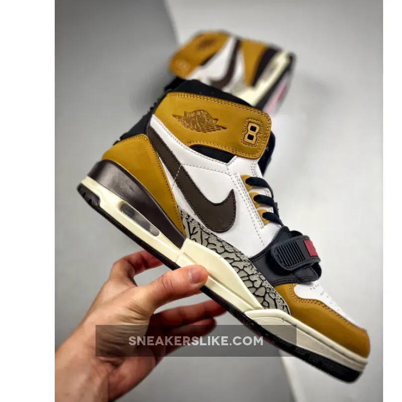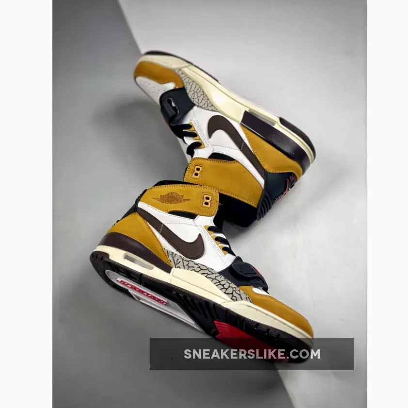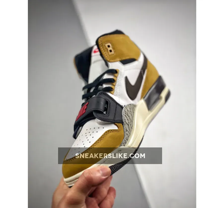 This release sports a similar Gold Harvest, Black, and Sail color scheme with Red contrasting accents throughout. Nike branding on the tongues and strap along with elephant print overlays completes the design.