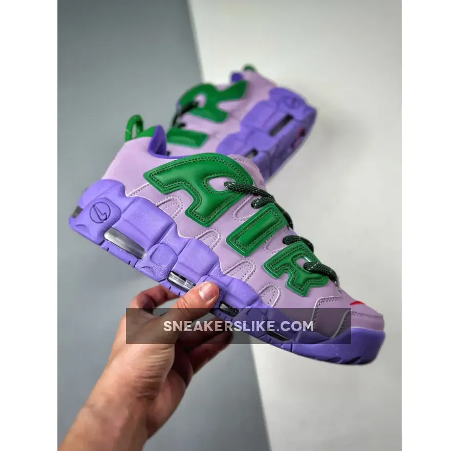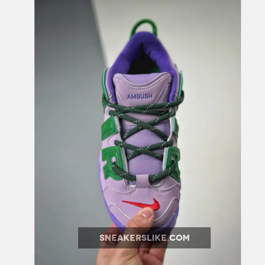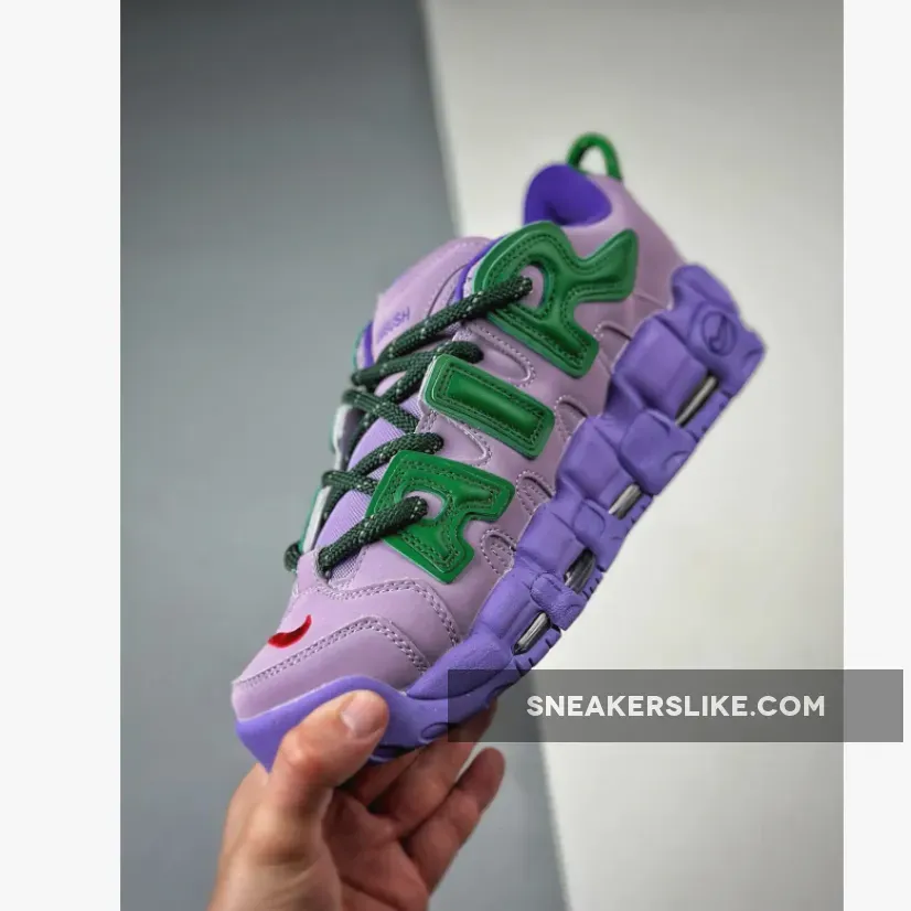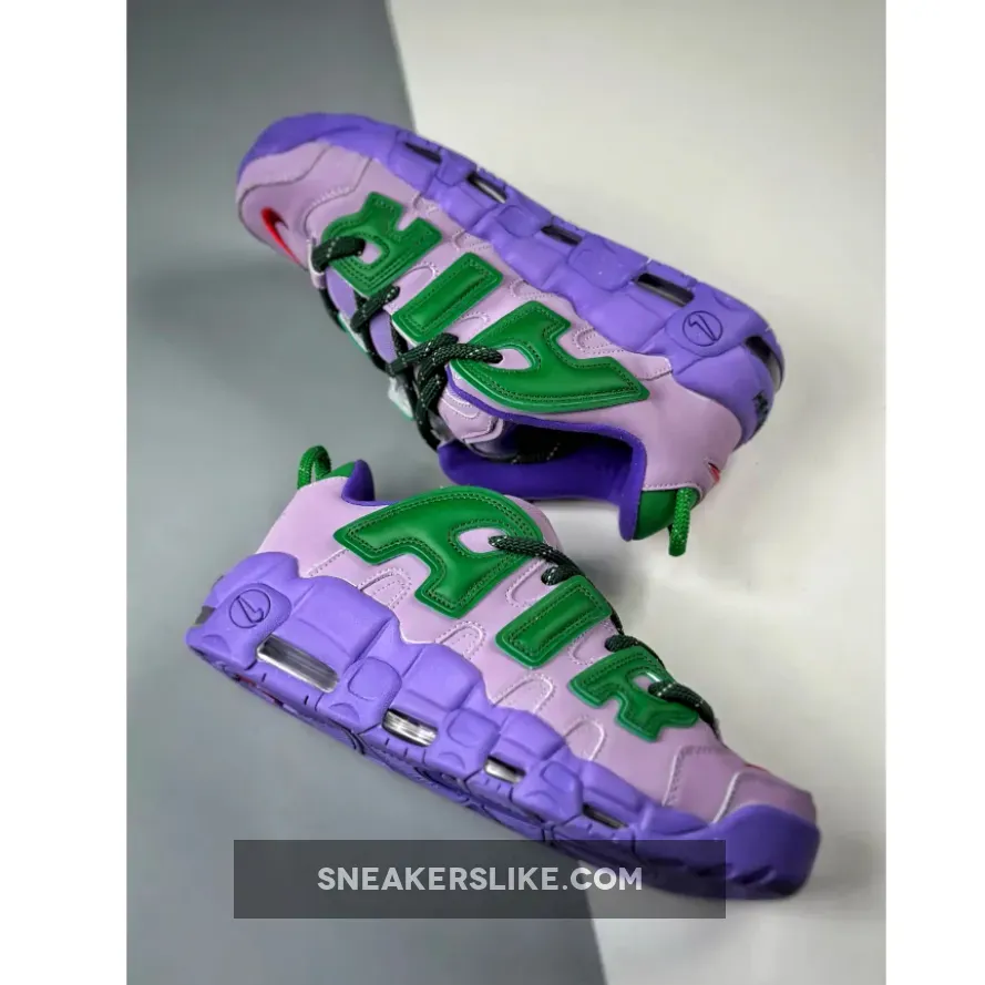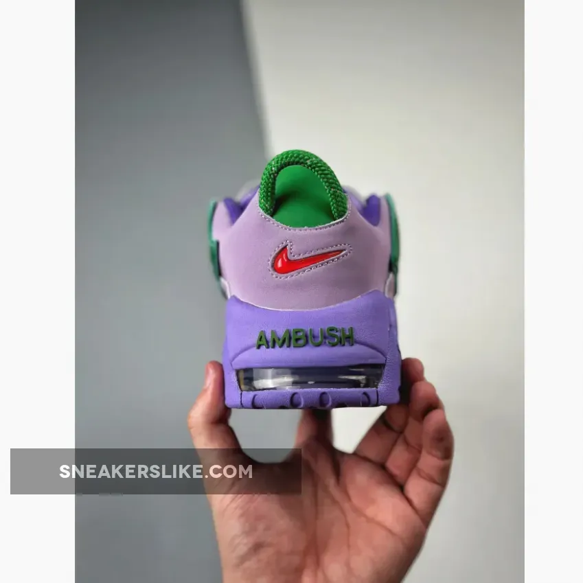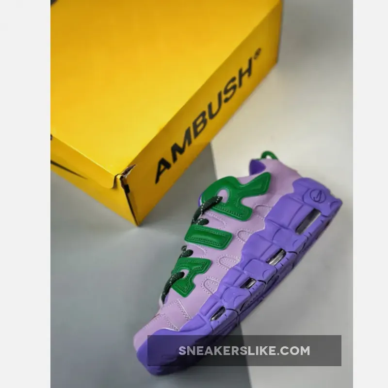 Adorned in a captivating color palette comprising Lilac, Apple Green, University Red, and Team Green, this Ambush x Nike Air More Uptempo Low variant boasts a predominantly Lilac upper that is accentuated by vibrant Green “AIR” lettering emblazoned on the sides, complemented by rope laces, back heel pull tabs, and “AMBSUH” branding gracefully showcased on the heels. The toe box and heels feature University Red Swooshes alongside prominent “AMBUSH” branding on the tongues, while the purple inner lining exudes a luxurious feel. Notably, the shoe will be available in men’s sizes, catering to a diverse range of preferences.
