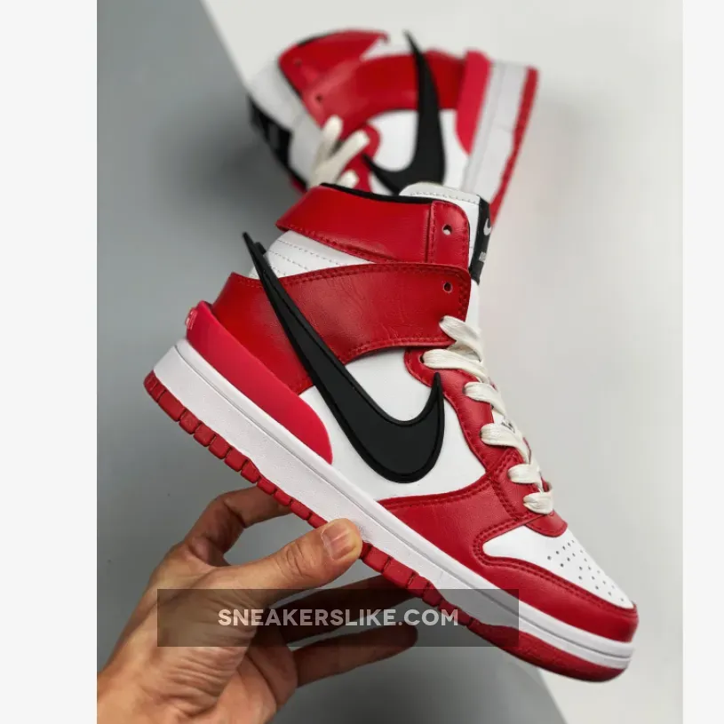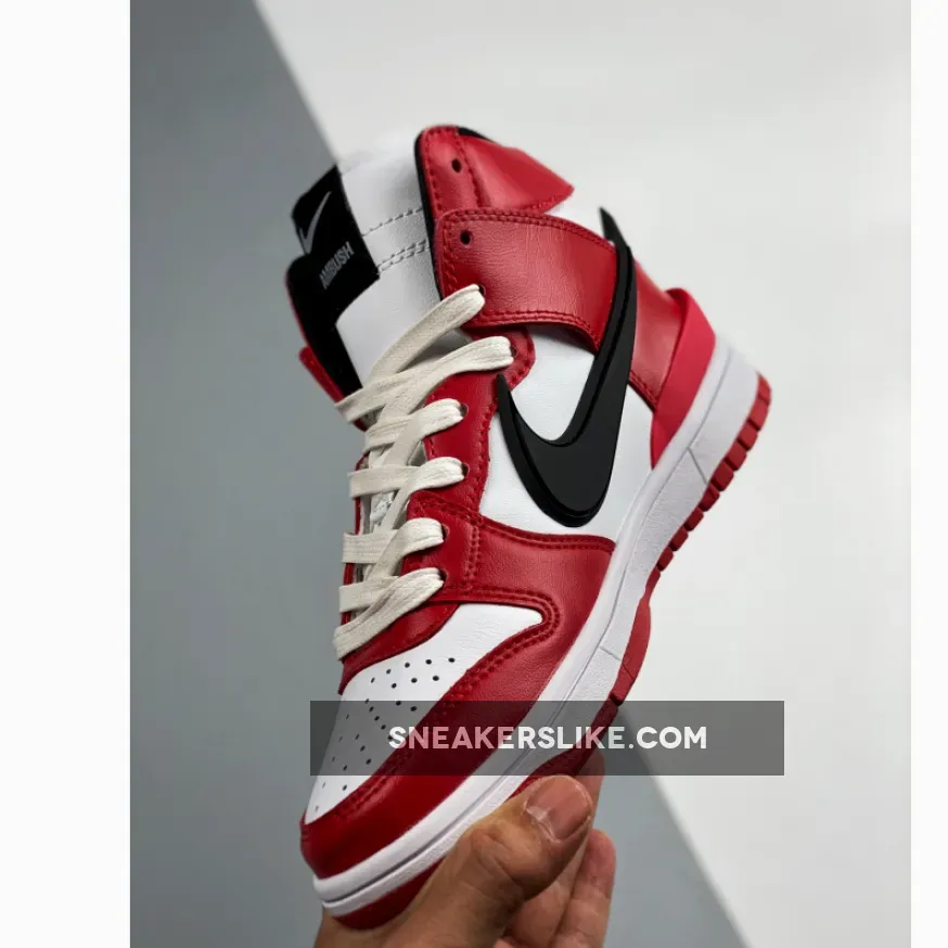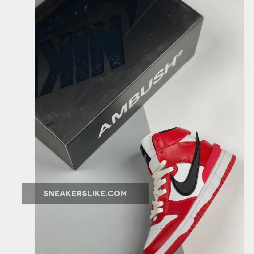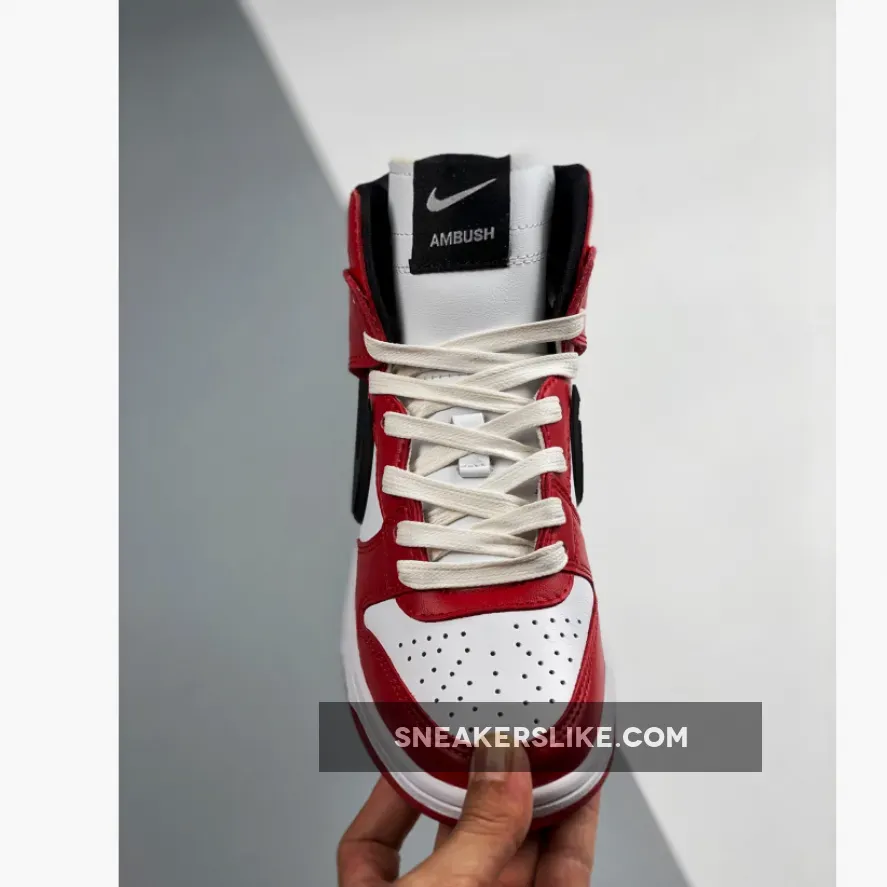 This offering of Ambush’s Nike Dunk High sports the popular “Chicago” color blocking. It features a White leather upper with Red leather overlays and her signature Swooshes in Black extending beyond the heel.