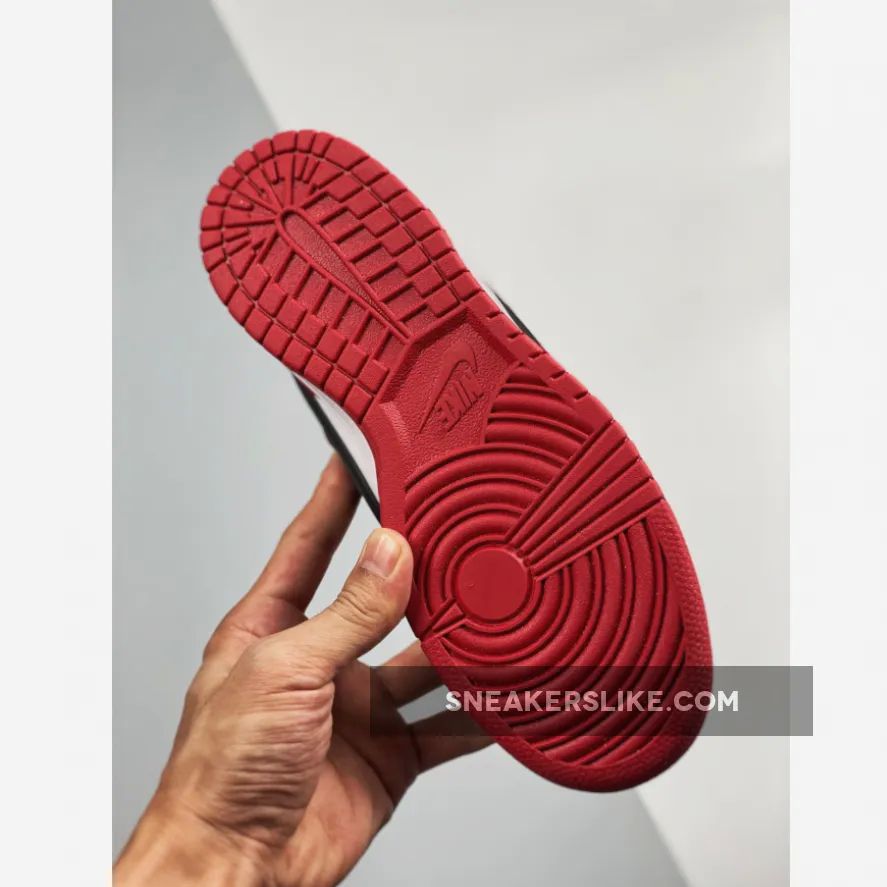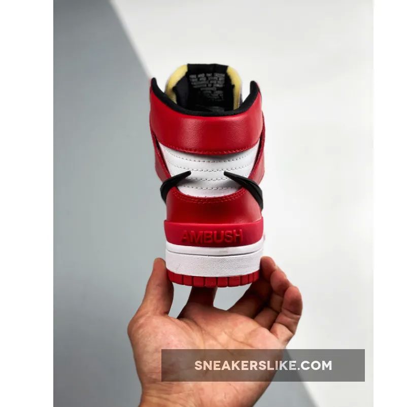 This offering of Ambush’s Nike Dunk High sports the popular “Chicago” color blocking. It features a White leather upper with Red leather overlays and her signature Swooshes in Black extending beyond the heel.