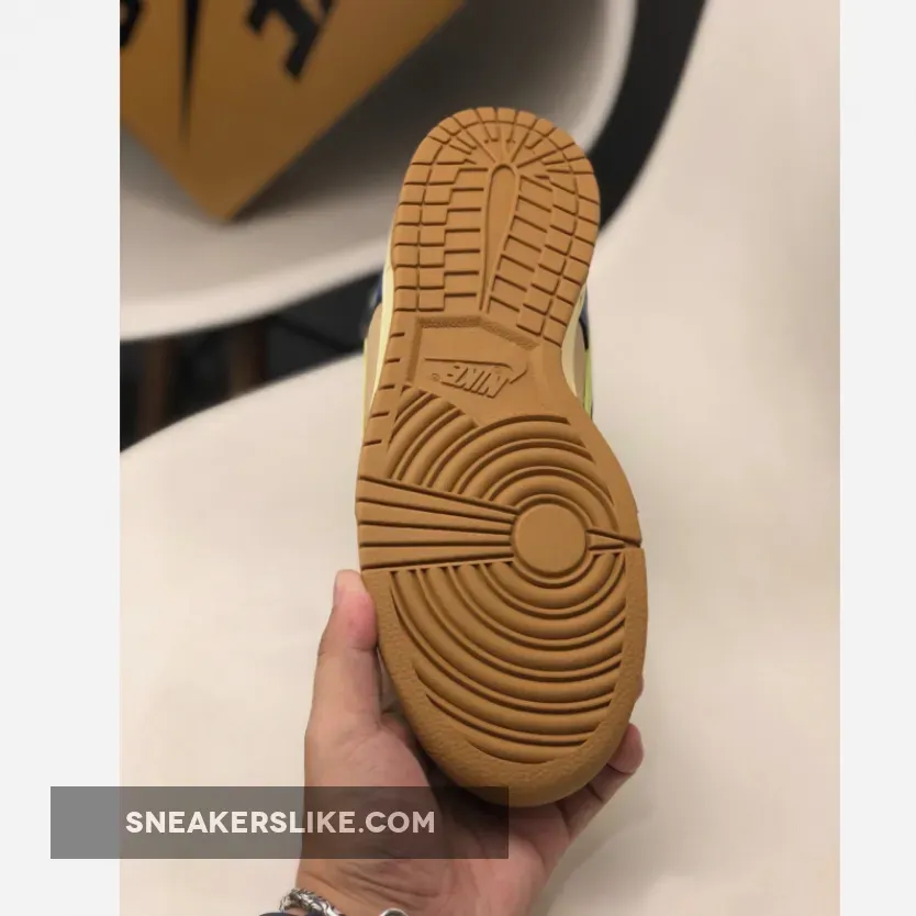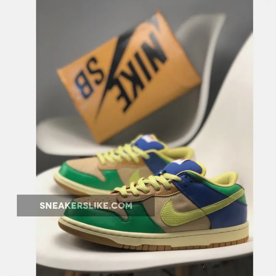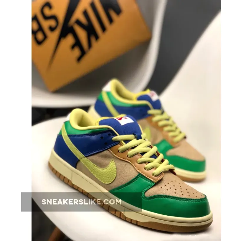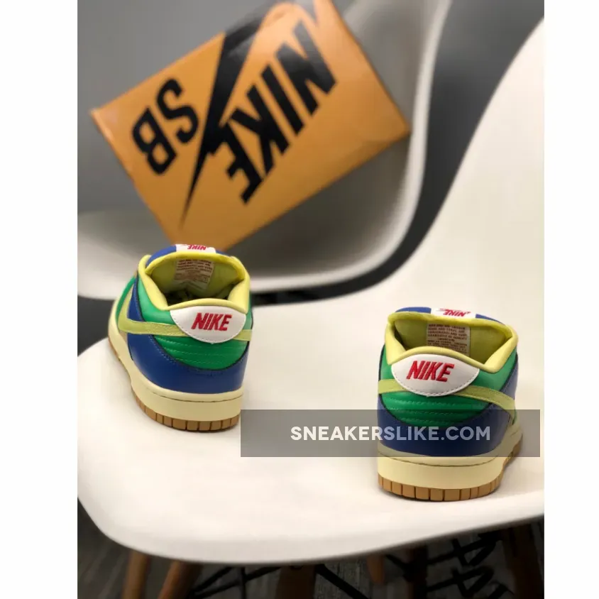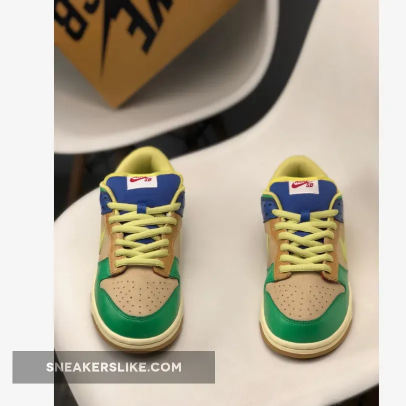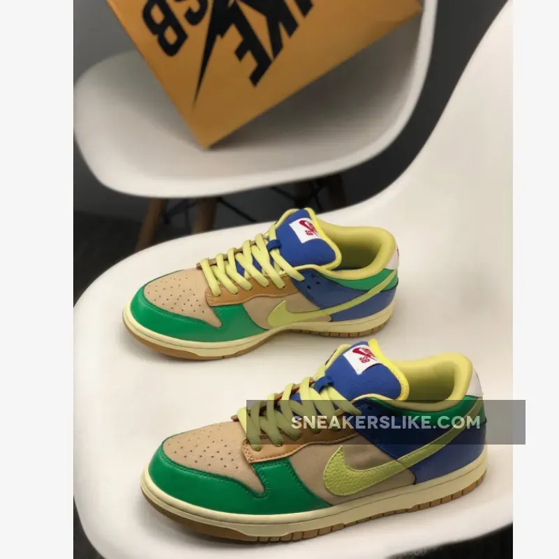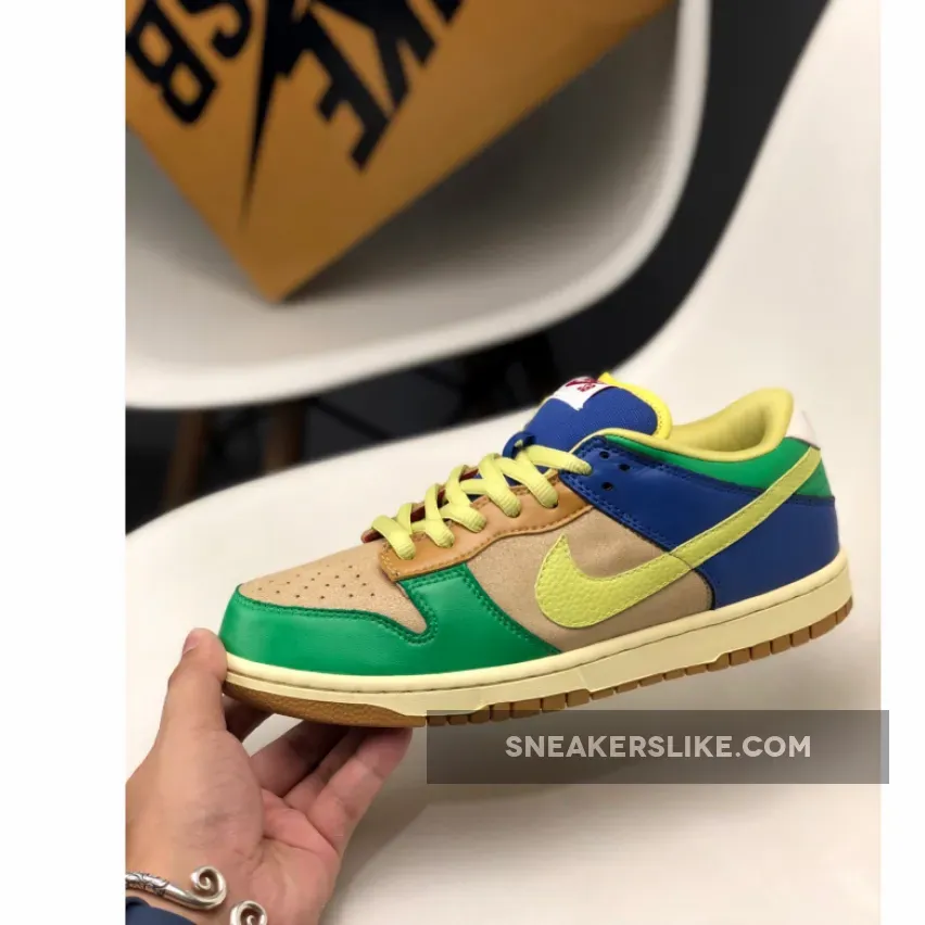 This Dunk features a colorful upper in shades of Blue, Green, Yellow, Red, and Brown with alternating panels in full-grain and crackled leather.