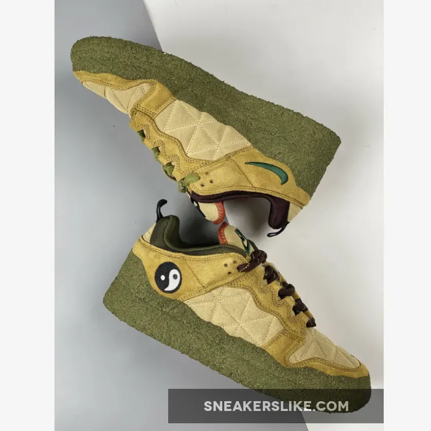 Cynthia Lu-led streetwear brand Cactus Plant Flea Market has collaborated again with Nike to bring us the nature-inspired Cactus Plant Flea Market x Nike Dunk Low Grass. The base of the upper is in light green quilted suede, channeling gardening gloves, while the overlays on the toe cap, mudguard and eyestay panels are in moss green suede while the collar flap is a slightly fuzzier suede in the same colour. The shoe also has mismatched elements. The right shoe features brown rope-like laces, embroidered CPFM and a Swoosh in green on the tongue and an embroidered yin yang symbol on the lateral collar flap. The left shoe features moss green laces, and embroidered Nike text logo and swoosh in black on the tongue and an embroidered Nike Swoosh in green on the collar flap.