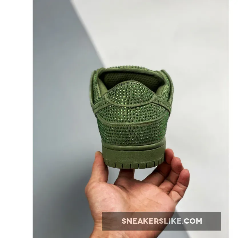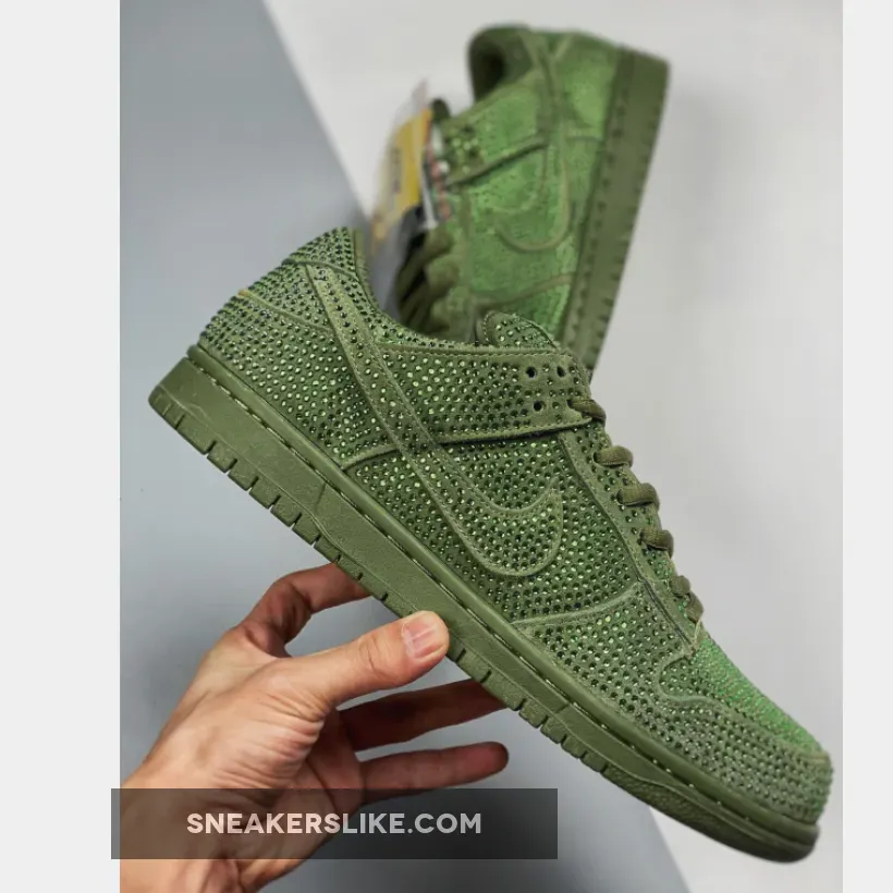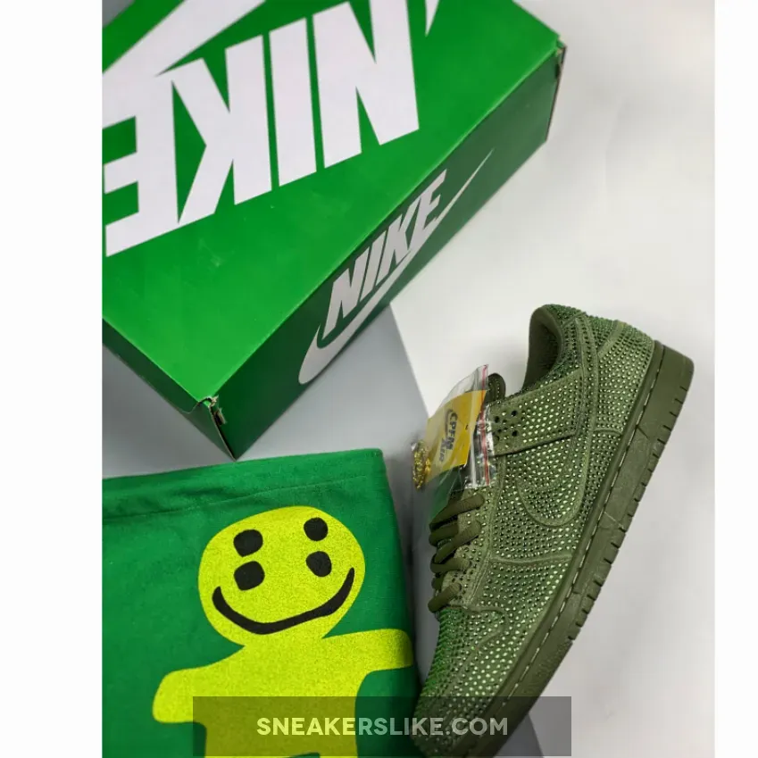 These CPFM x Nike Dunk Low styles will come dressed in “Pure Platinum” and “Spiral Sage” color blockings. The shoe features an oversized Swoosh, borrowed from the prior CPFM Nike Blazer, extra padding to the tongue and detachable double lace flaps. Its entire upper is covered in Swarovski crystals resembling a disco ball.