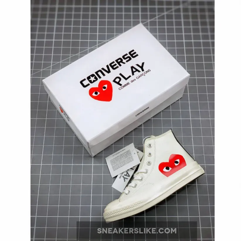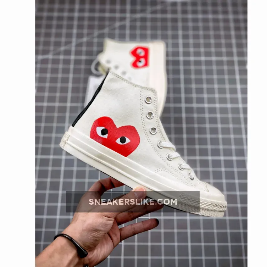 One of the most popular sneaker collabs of all-time, the Comme Des Garcons Play x Converse Chuck 70 is a classic which belongs in every sneaker collection. The eye-catching Comme Des Garcons Play logo is the main attraction of this trainer, adding a playful aspect to the classic Chuck 70 silhouette. The red heart logo stands out against a neutral white upper, perfect for pairing with almost any outfit you can think of.The CDG Converse is the perfect example of how to combine high-end with streetwear. The avant garde Japanese fashion house Comme Des Garcons’ partnership with Converse goes all the way back to the 2000’s but it is this 2015 release which is held up as the flagship model of the collaboration. The finishing touch comes in the form of a contrasting black strip which runs along the back of the sneaker.All CDG x Converse releases tend to sell out so be sure to act quick to secure your pair today.