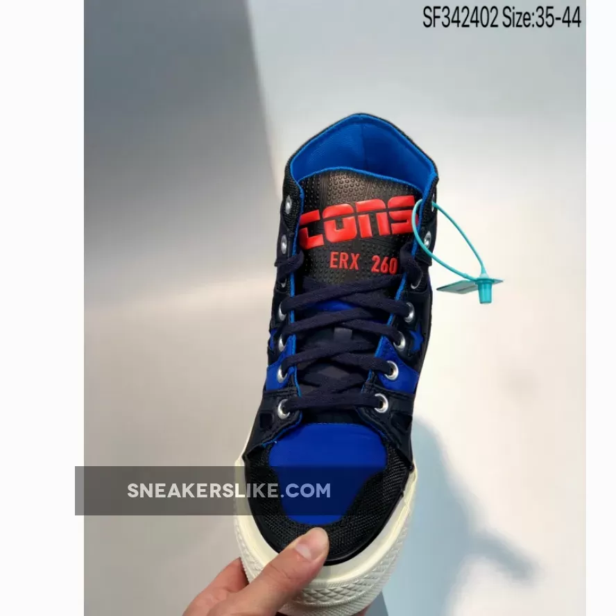 TAKE IT TO THE TOP. A hybrid of unmistakable styles, the all-new Chuck 70 E260 combines premium comfort with the coveted basketball lifestyle look. Constructed with tough nylon and fused with colour-blocked overlays, we’ve re-imagined the bold ’90s ERX260 for the great outdoors. Mountain-inspired colour palettes and elastic hiker laces tie the look together in authentic trail-ready fashion. Branded with CONS, Star Chevron and vintage licence-plate logos, these sneakers pay homage to icons of Converse past.
