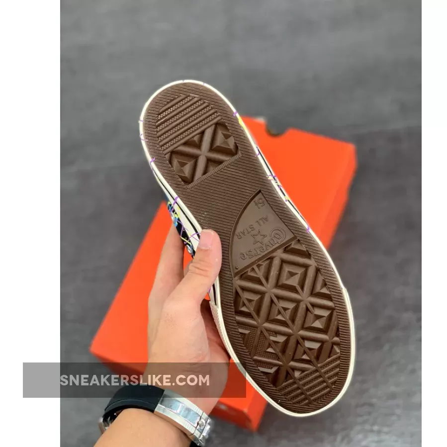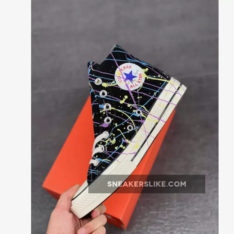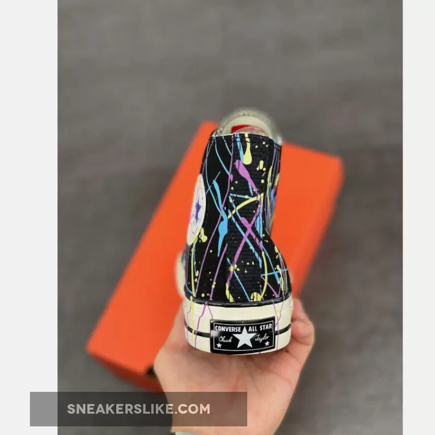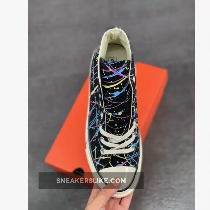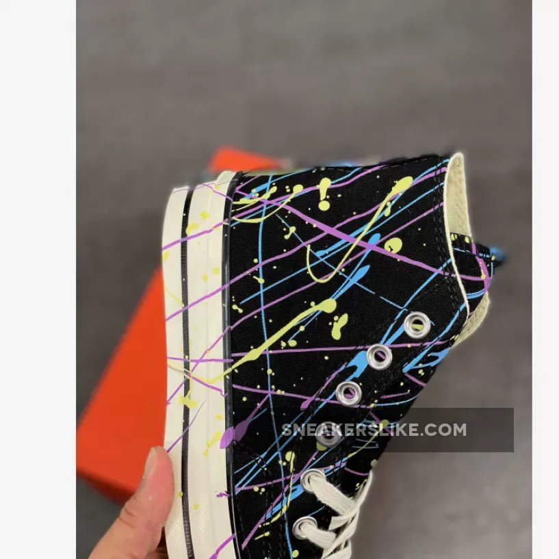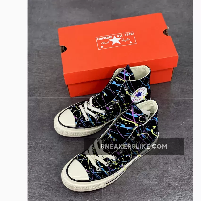 The black pair is adorned with pink, blue and yellow paint streaks while the egret pair looks to a mixture of blue, black and white. These splashes, dots and lines leave no part of the upper untouched, running from the heel right up to each pair’s signature rubber toe cap. Though the hues used may be different, each of these high-cut Chuck 70s features a leather All-Star badge on its medial collar and silver eyelets.