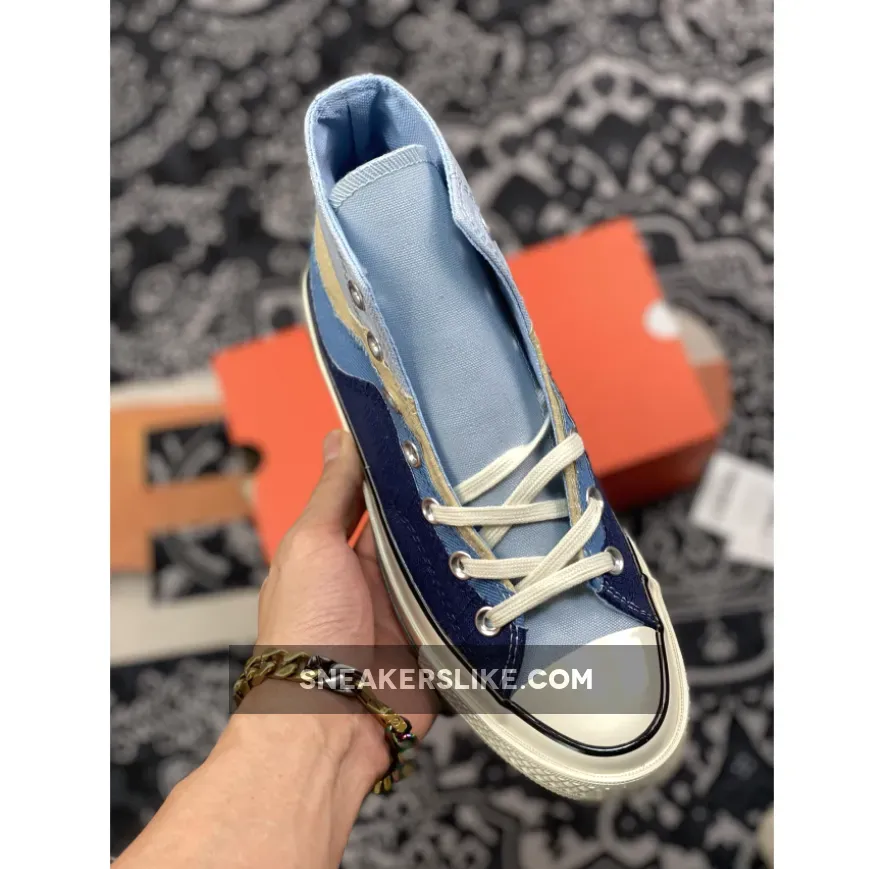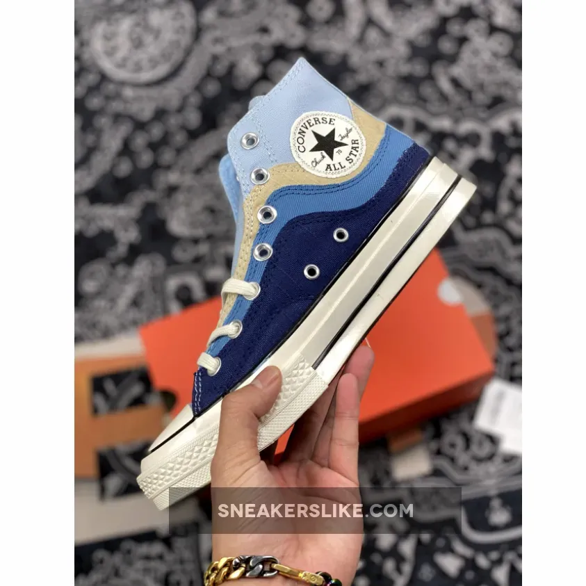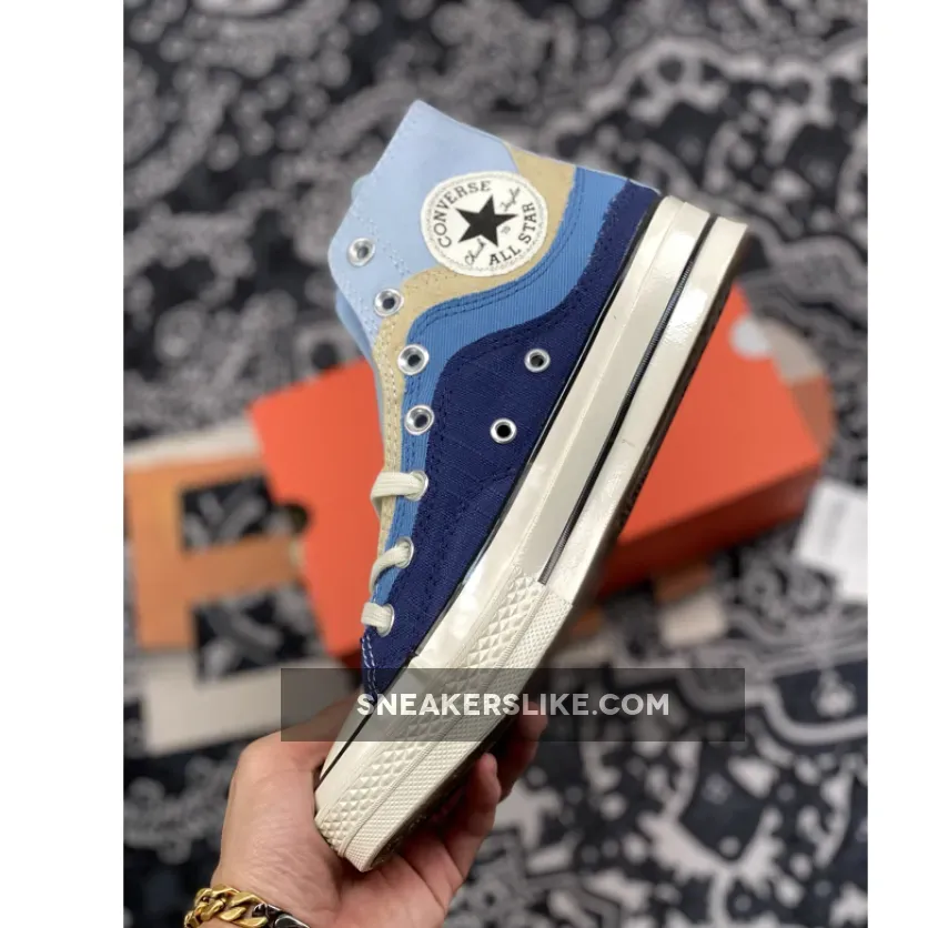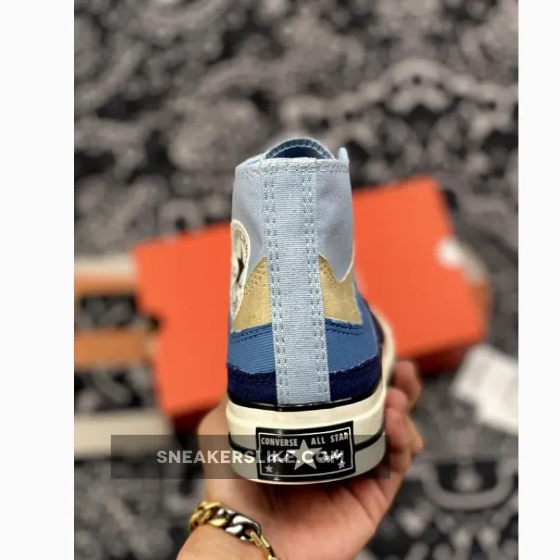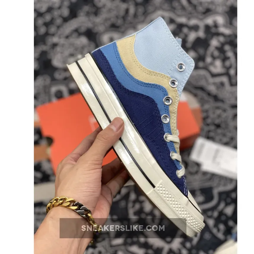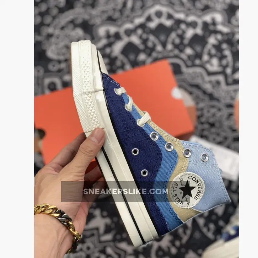 The Converse Chuck 70 High ‘The Great Outdoors’ features a layered design that draws inspiration from natural landscapes, and the ways in which water interacts with land at different temperatures. The upper is constructed from organic canvas in Chambray Blue. A visual thermal effect is achieved by adding wraparound overlays in tan ripstop, blue twill canvas and navy slub canvas.