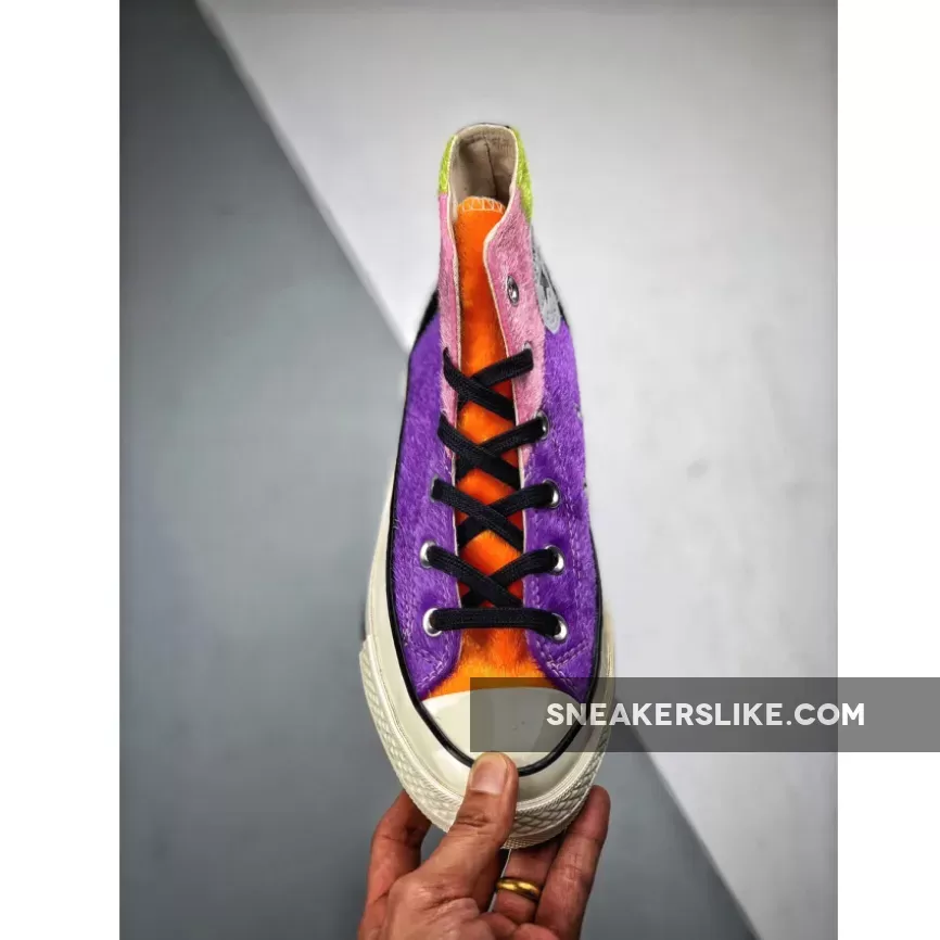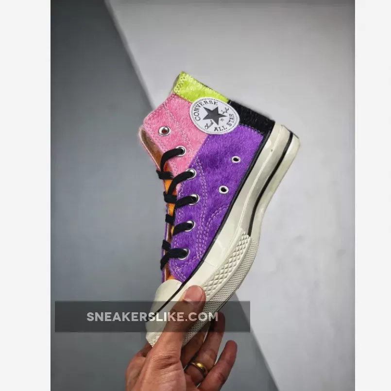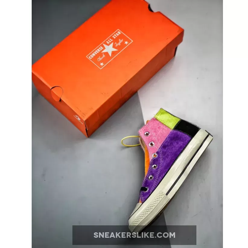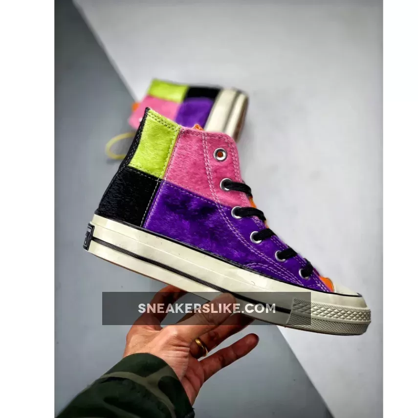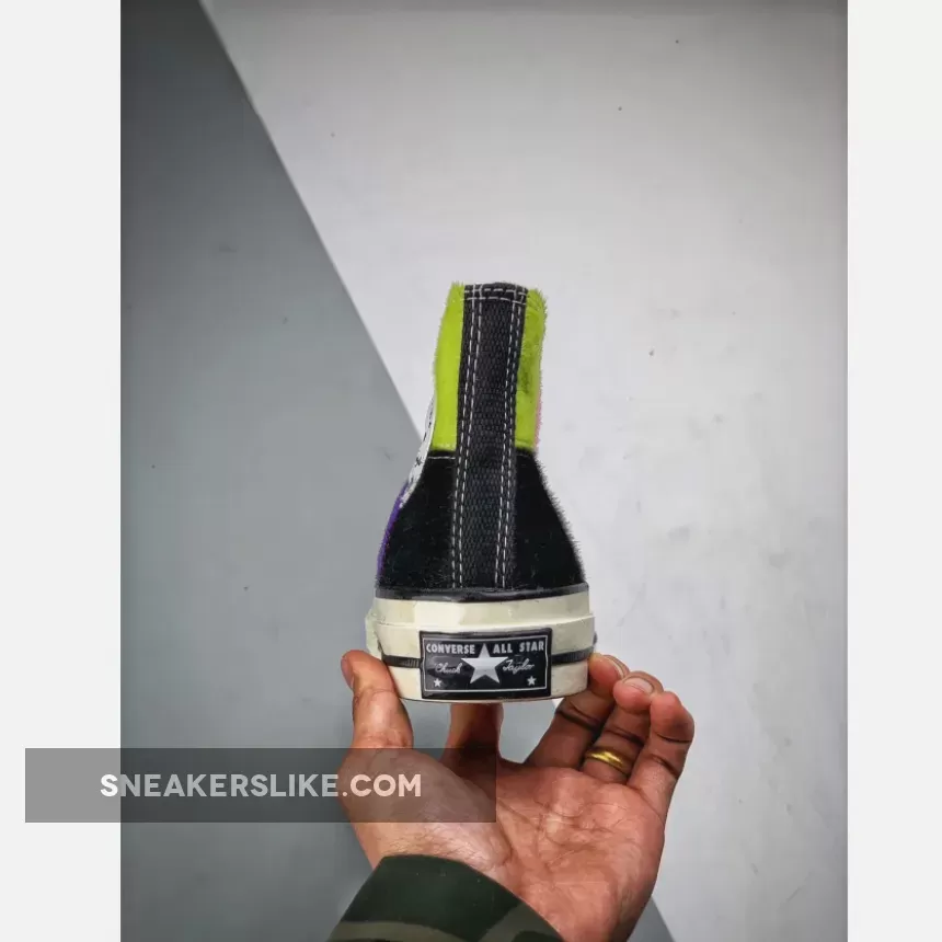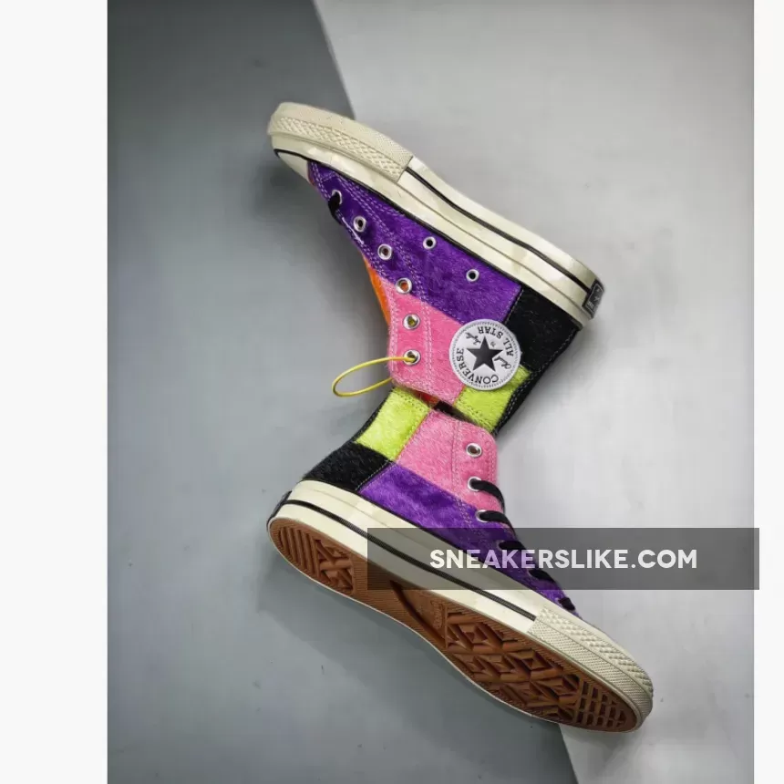 This Converse Chuck Taylor is completely covered in a shaggy synthetic fur highlighted in a mix of Purple, Pink, Orange, Green and Black color tones.