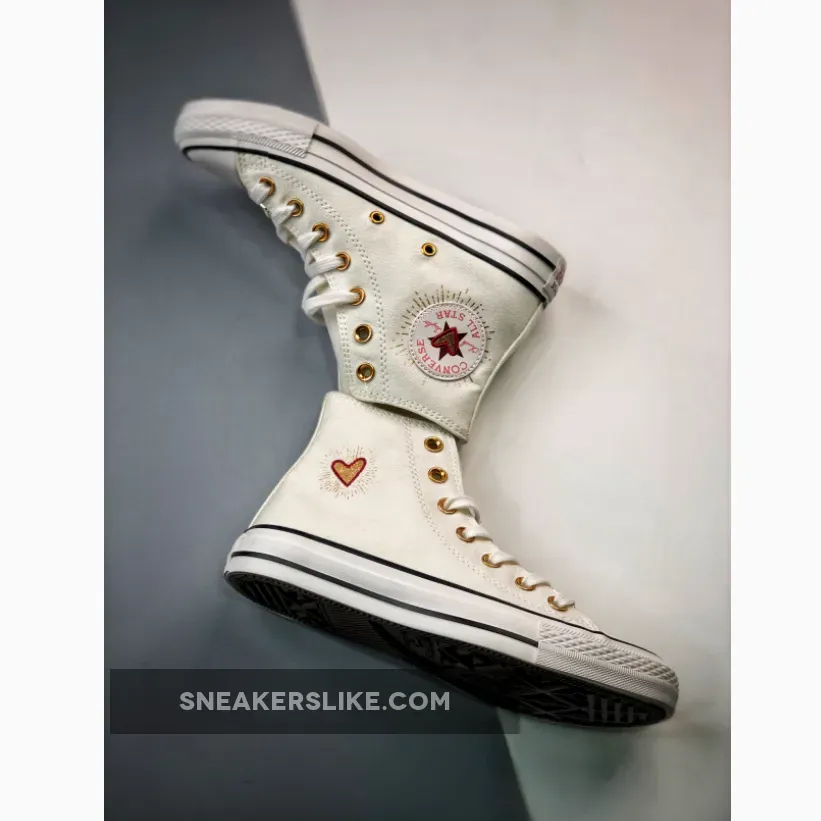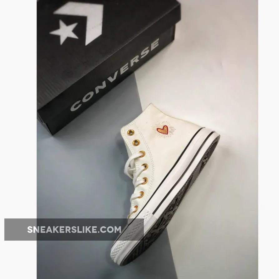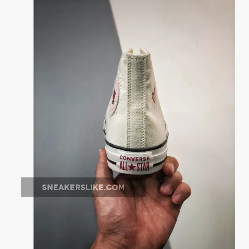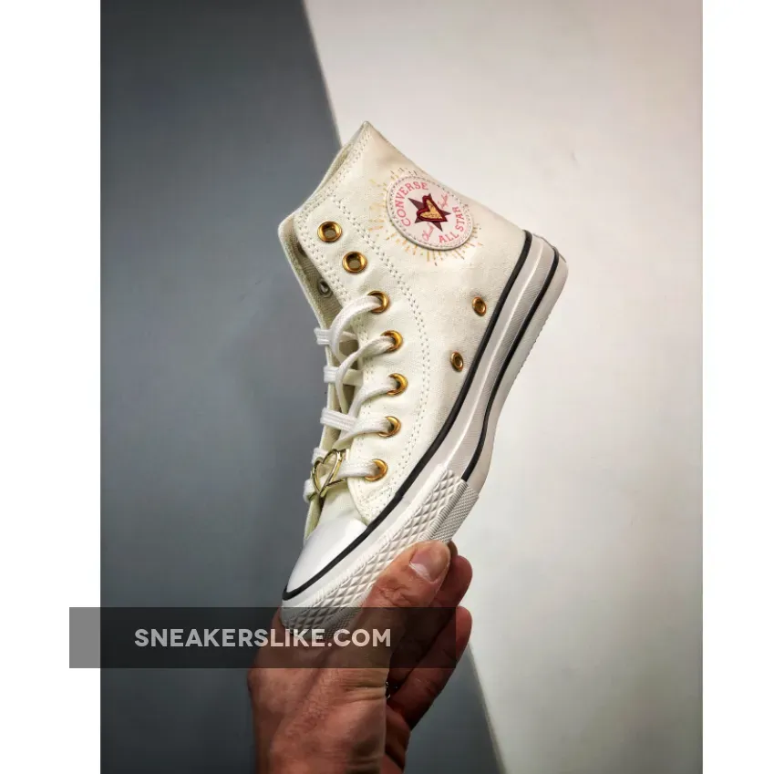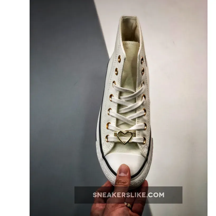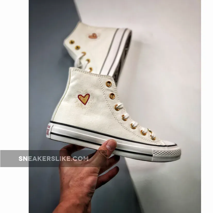 Converse’s classic Chuck Taylor is part of the brand’s V-Day collection. Take a closer look at the Converse Chuck Taylor High Hearts White. This high-cut Chuck Taylor has a Vintage White durable canvas upper. The lateral ankles of the shoe show off gold hearts with Back Ally Brick red embroidered outlines. Metallic gold eyelets and metallic gold heart deubrés add a touch of extravagance.