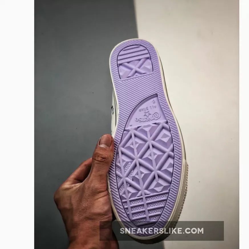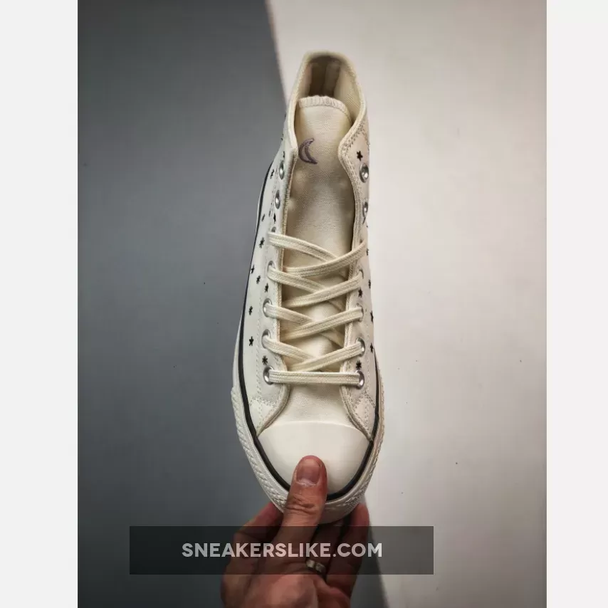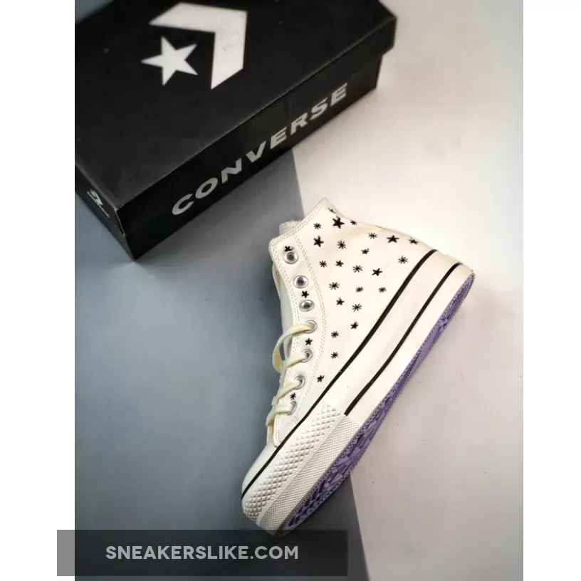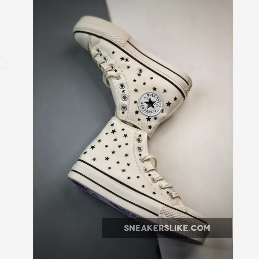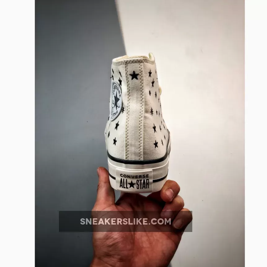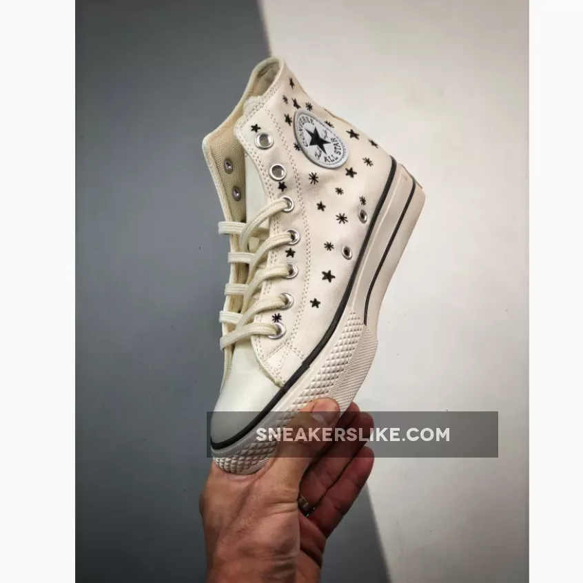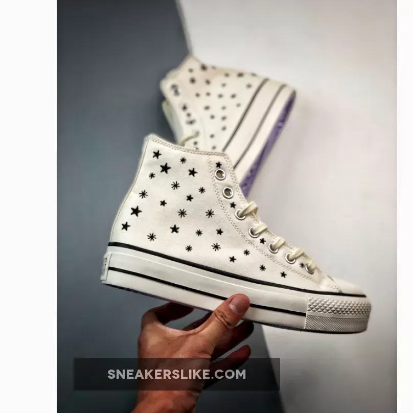 The newest head-turning Converse Chuck Taylor Lift will get you counting your lucky stars. Check out the Converse Chuck Taylor Lift Crystal Energy High Egret. This high-cut Chuck Taylor Lift has an Egret-coloured canvas upper with embroidered black stars scattered all over. Just like other Chucks, this shoe sports the iconic star ankle patch on the medial side and black-and-white Converse All Star rubber heel patches. A white rubber toe cap and a white diamond-patterned toe bumper cap off the style of these kicks.