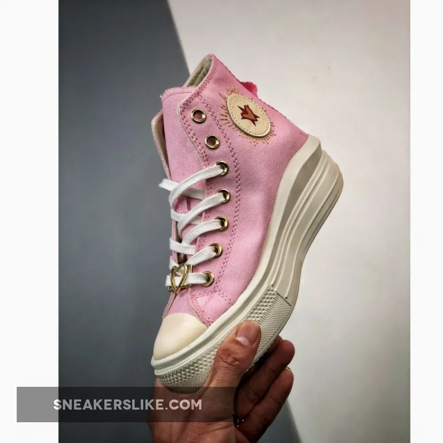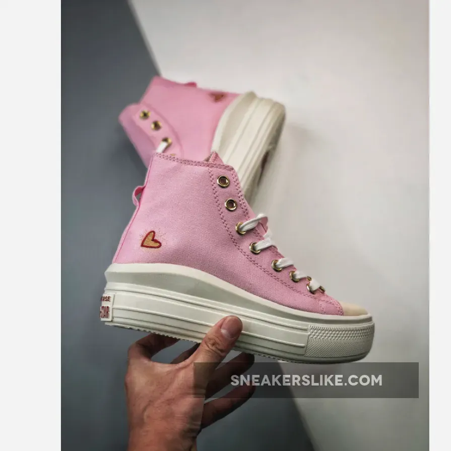 The Converse Chuck Taylor Move Platform High Hearts Pink will catch your eye with its adorable design. This high-top shoe is dressed in a durable baby pink canvas upper including the lightweight tongue and mini pull tab. It’s complemented with elegant metallic gold eyelets and a heart-shaped lace dubrae. The All-Star Chuck Taylor patch at the medial side is now designed with a pink and gold heart which matches the love-themed decor on the lateral side. Overall, a great pair for your dainty looks.