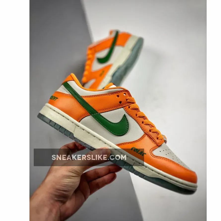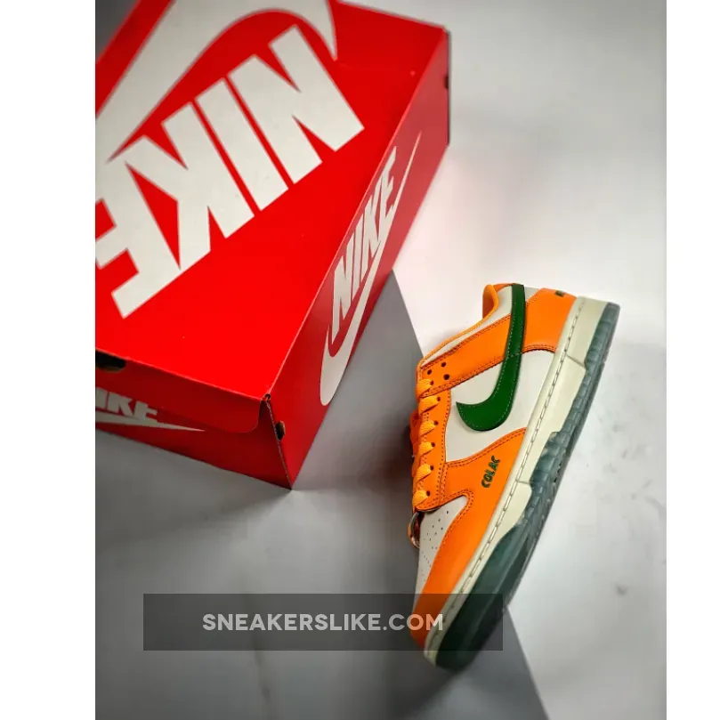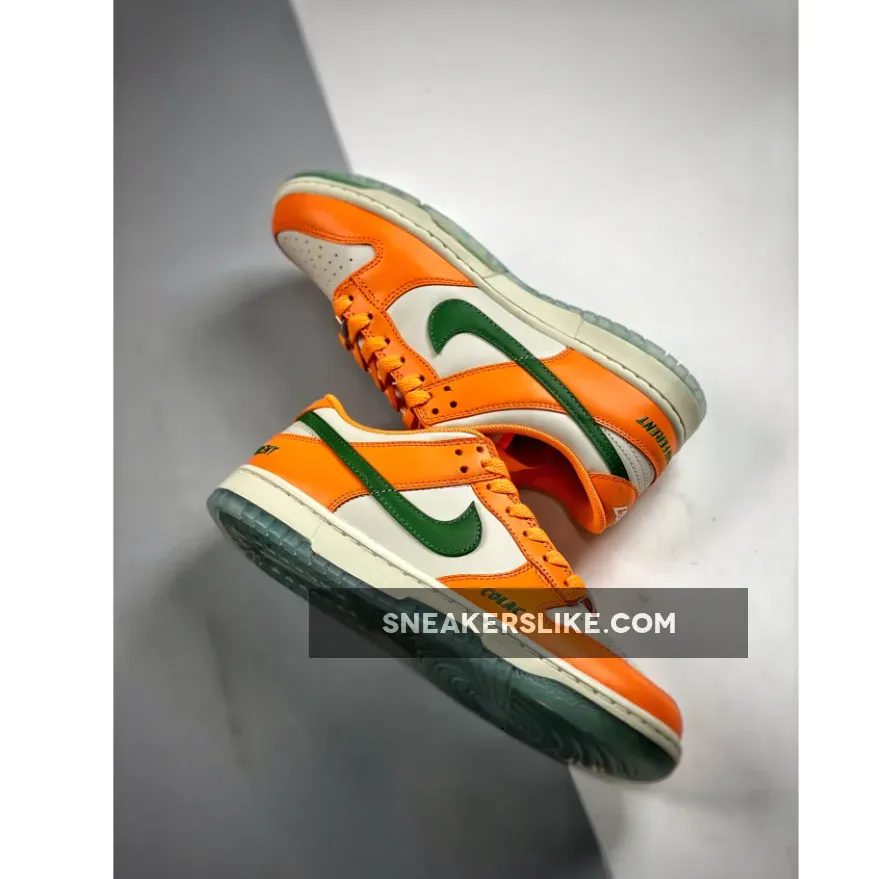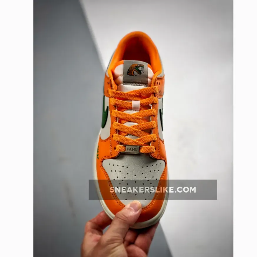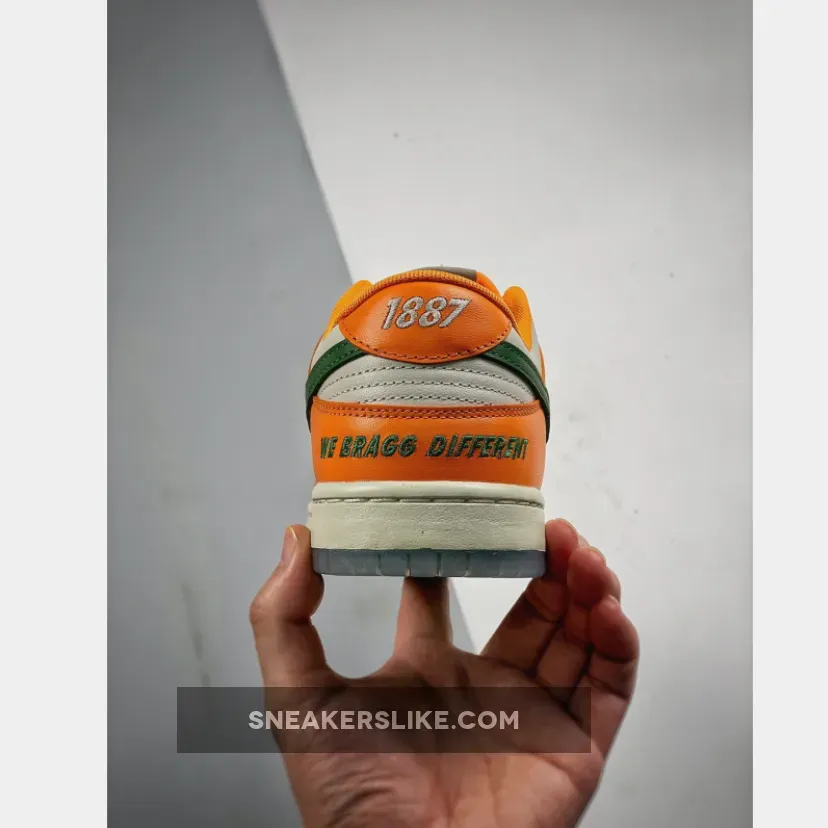Previewed below, the Florida A&M x Nike Dunk Low comes dressed in the school’s colors consisting of a White leather base paired with the Orange on the leather overlays, laces, and lining. Elsewhere you will find Green Swooshes as well as custom details such as the school’s rattlesnake, Rattler mascot on the tongues, text behind the tongue tags, and 1887, the year the university was founded, embroidered on the heels. Lastly, you will find “COLAC” (College of Love and Charity) on the lateral forefoot with text on the heels atop a graphic translucent outsole.