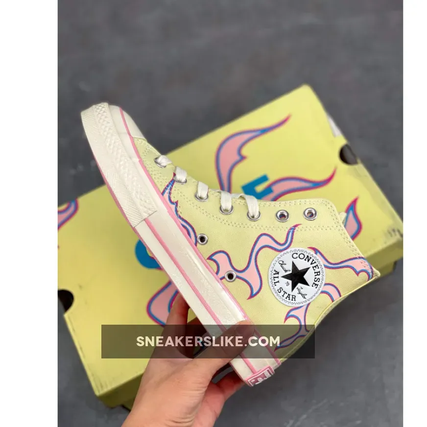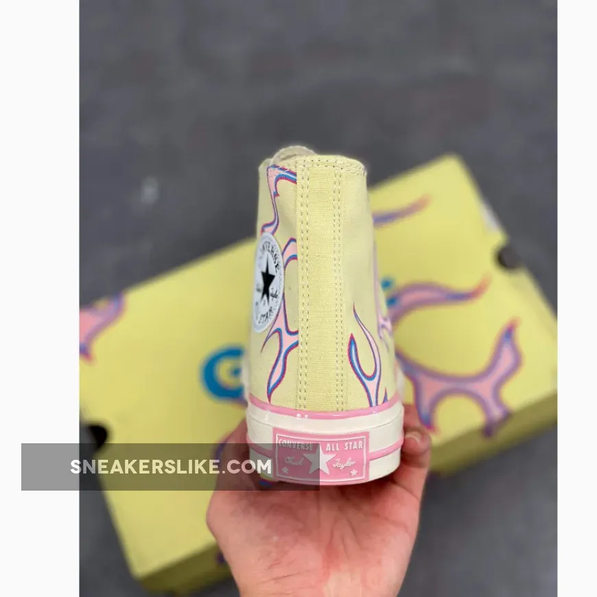 Tyler, The Creator, in collaboration with Converse, opts for a more familiar, grounded feel for their latest creation. With this latest Chuck 70, flames appear all across the parchment-toned canvas. The flames are shaded with shades of both pink and purple. Furthermore, shades of pink mark the foxing stripes and back labels, contrasting the white cap toe and the midsole.