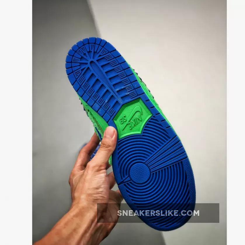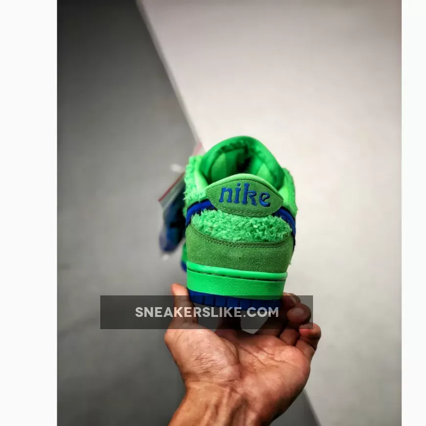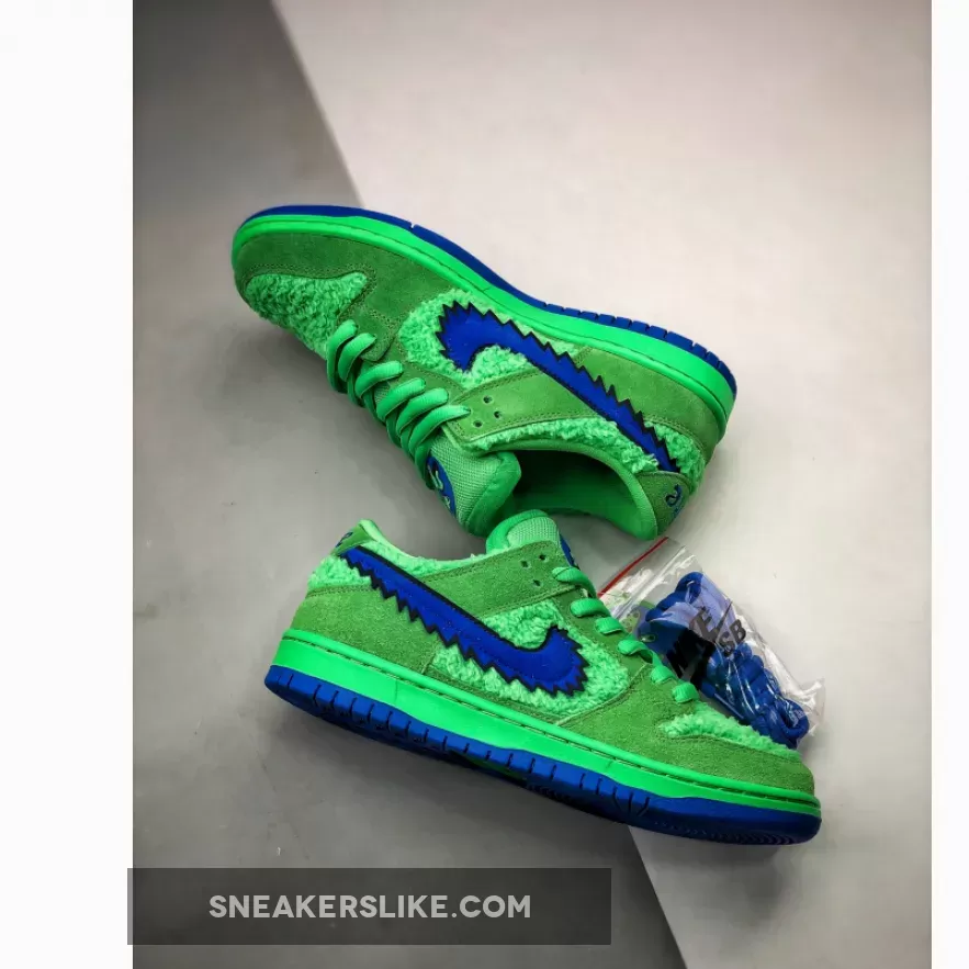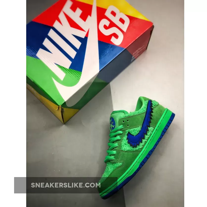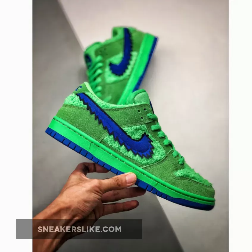 Inspired by The Grateful Dead Bears, the Nike SB Dunk Low Grateful Dead Bears Green Blue is a statement pair that’s designed to catch eyes. Presented in a high-voltage finish with difficult-to-miss details and a variety of textures, this sneaker will be the pair you turn to when you really want to make an impact.The upper is crafted from super soft neon green faux fur and suede overlays are added to deliver structure and create a bang-on-trend multi textured look. Nike’s iconic Swoosh comes in electric blue with a jagged edge and the textured tread matches the electric hue for added interest. Utility-style laces allow you to create a fit that feels customised and Nike’s exclusive cushioning is added to support your foot where you need it most. Specially designed to make a statement, wear these SB Dunks with your best joggers and a tee and they’ll instantly steal the show.