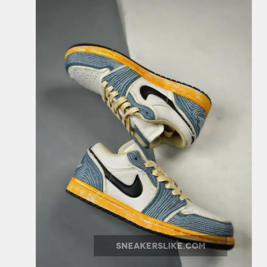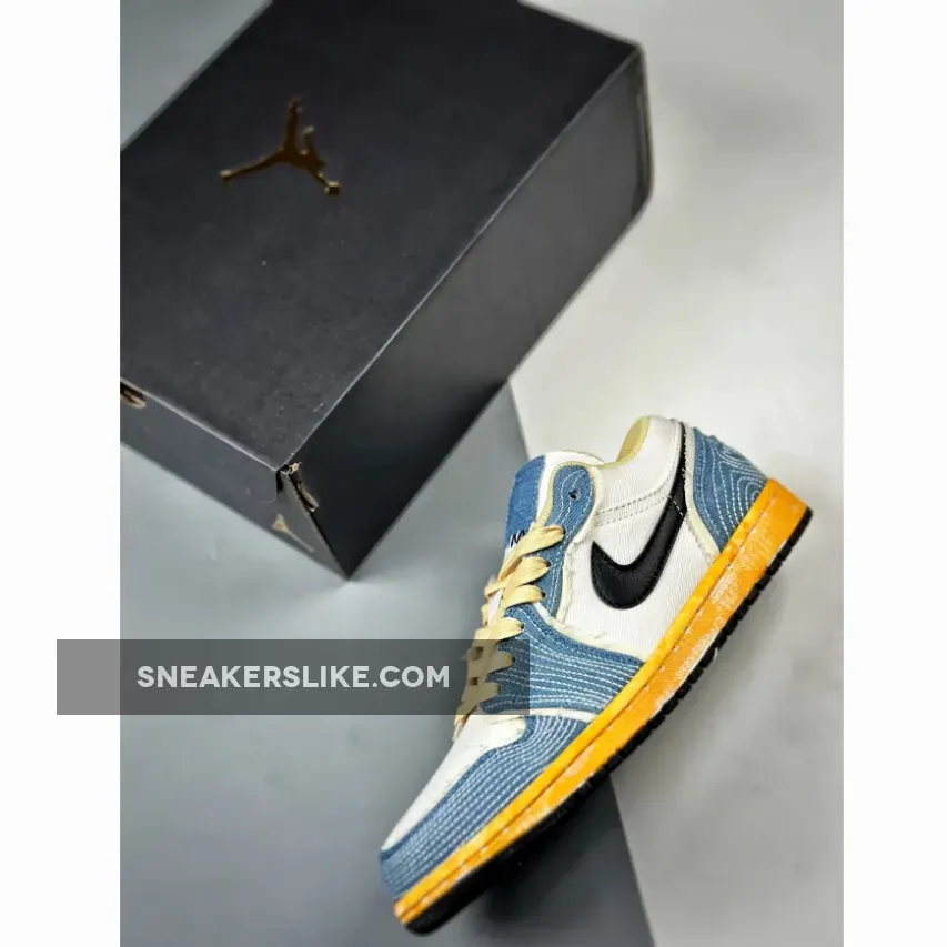 this Air Jordan 1 Low comes with White canvas on the base, distress and worn-like denim fabric on the overlays around the toe box, forefoot, eyestays, and heels. Utilizing an aged look, the shoes also have frayed edges and Black tumbled leather Swoosh logos. Exposed stitching runs throughout with exposed foam on the tongues and ankles. Other details include an aged midsole, Cream laces, a graphic on the insoles, and a Black rubber outsole.