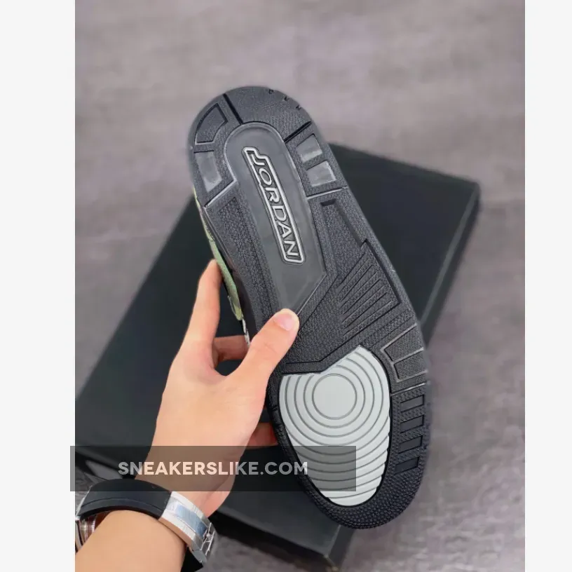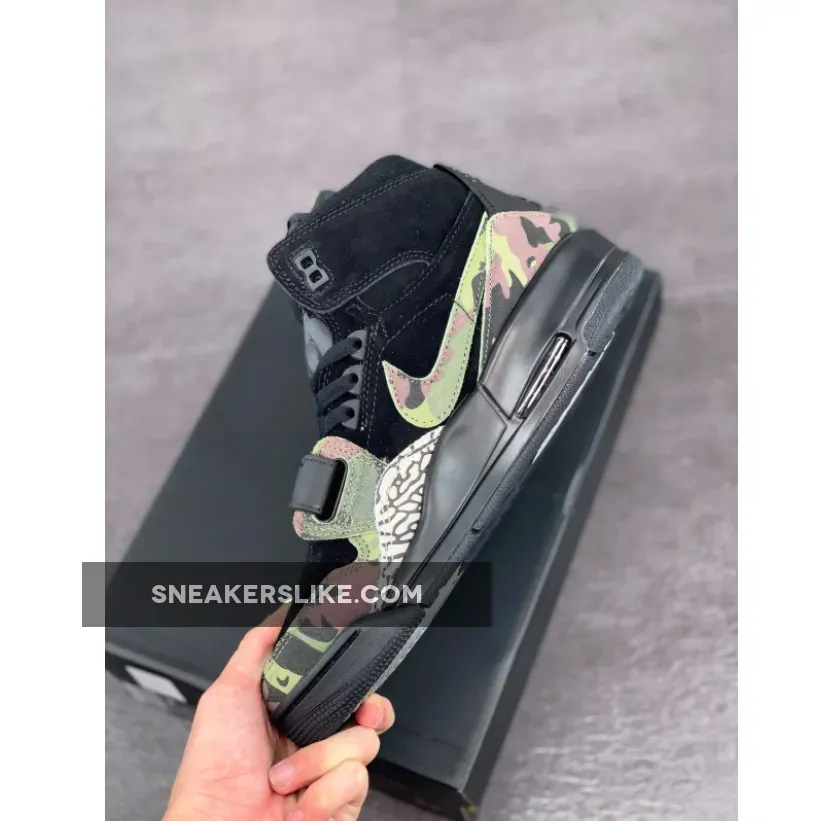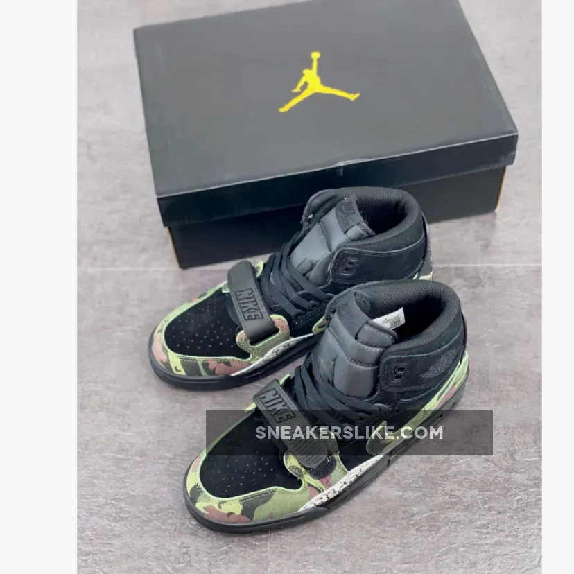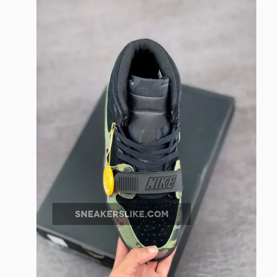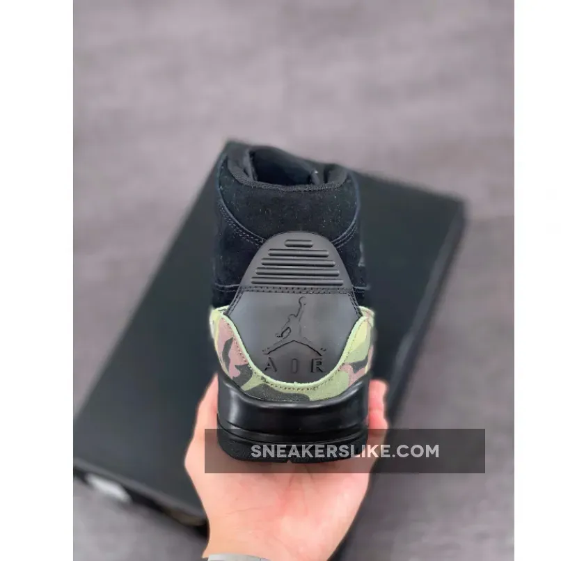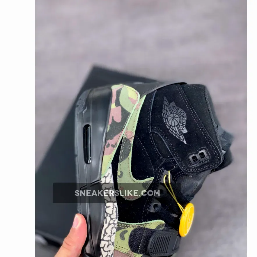 This iteration of the silhouette features a Black nubuck upper with Green camouflage overlays and elephant print on the mudguards.