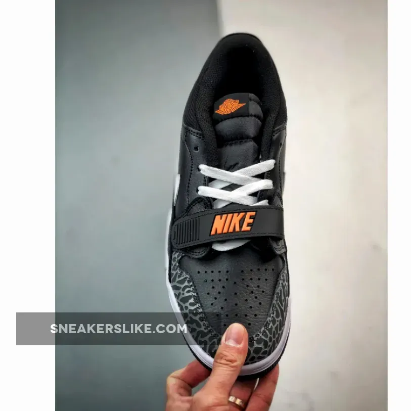Additionally, the low-top trim features a vibrant orange hue, visible on the heel’s Jumpman logo, and the Nike insignias on the forefoot strap and tongue tab, offering a pop of color that complements the darker tones.