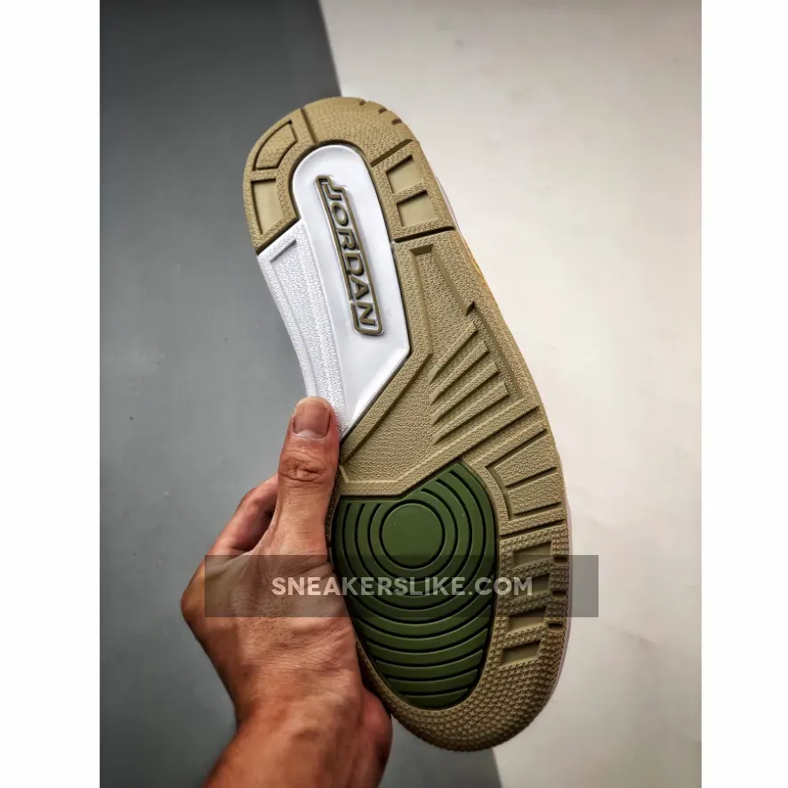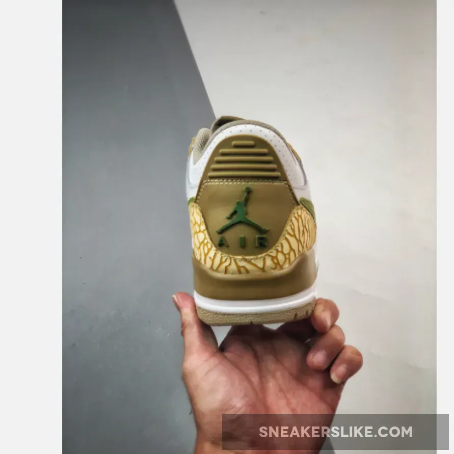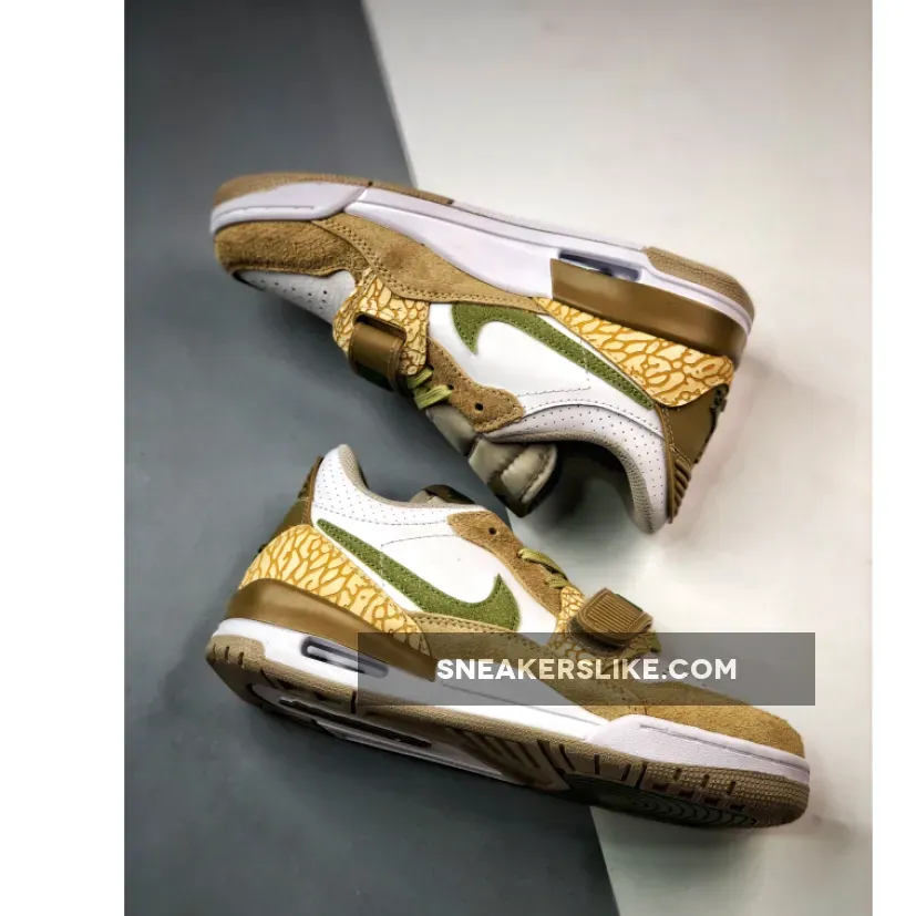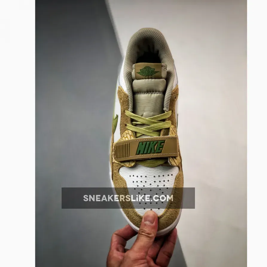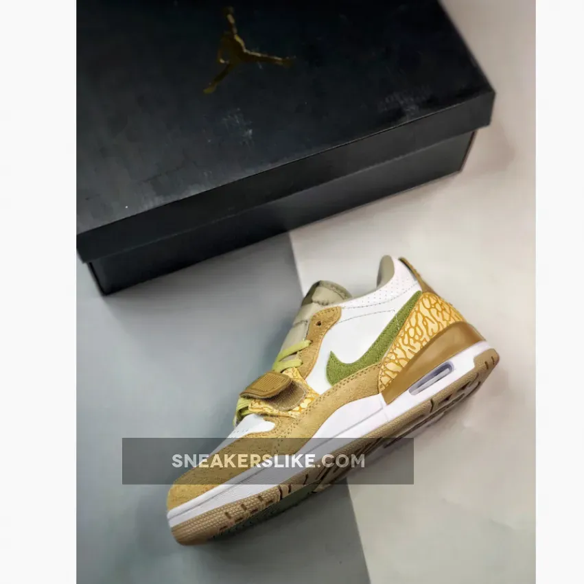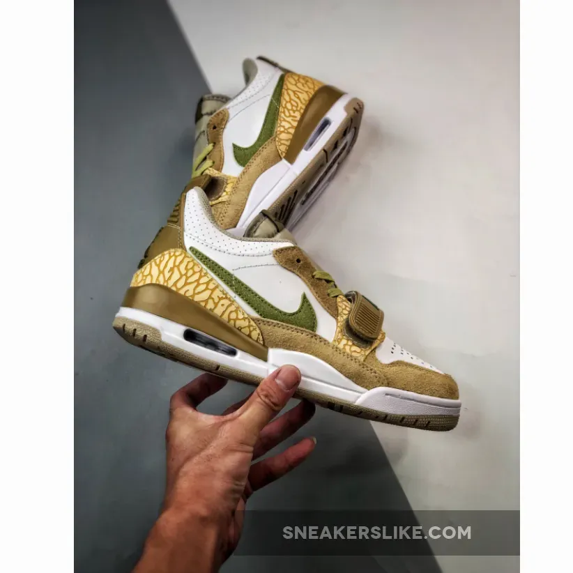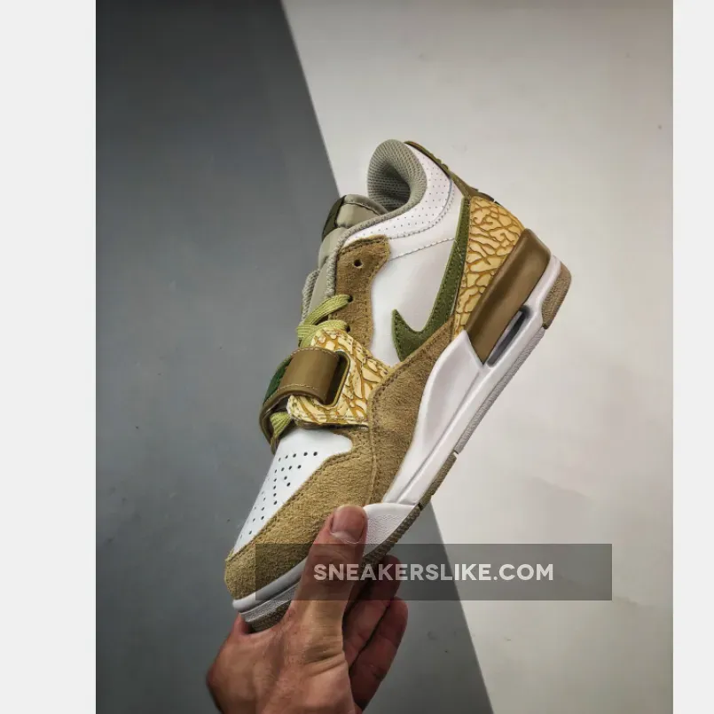 The four-year-old Jordan Legacy 312 joins the “Bayou Boys” collection of the Jordan Brand in honour of Zion Williamson of the New Orleans Pelicans. The colour scheme of this low-cut Legacy 312 is definitely inspired by the New Orleans landscape with swampy looking green on the laces, the fuzzy-looking signature profile Swooshes on both sides of the shoe, the Wings logo on the tan-coloured nylon tongue and the Jumpman on the insoles. The base is a plain smooth white leather to emphasise all the other eye-catching details of the shoe like the hairy suede tan overlays. The mudguard and the heel counter, on the other hand, are tan and golden yellow with an elephant print pattern. The olive green TPU Velcro flaps have bright green Nike branding, matching the look of the heel panel with the bright green Jumpman.