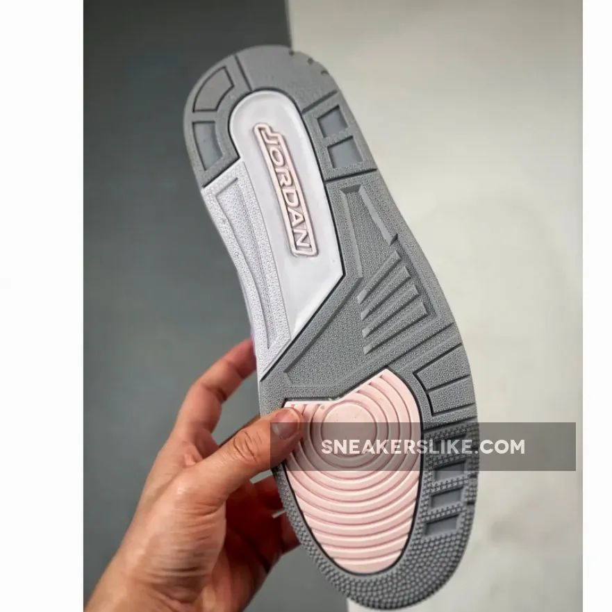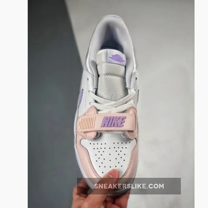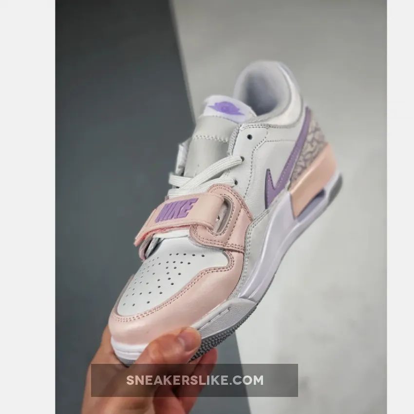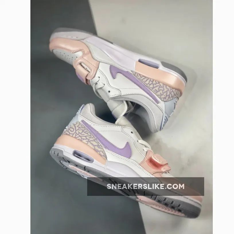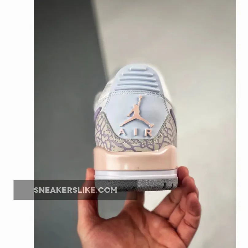 The base layer of theshoe wears standard white leather, setting the stage for what’s to come. The lining and tongue appear in baby blue, matching the color of the heel tab, while pink coloring adorns the toe, lace strap, and accents on the sole unit. A purple Swoosh complements the Jumpman logo on the heel and elephant print leather paneling to complete the shoe.