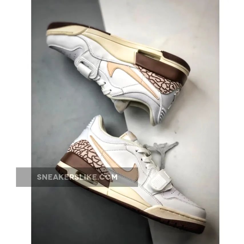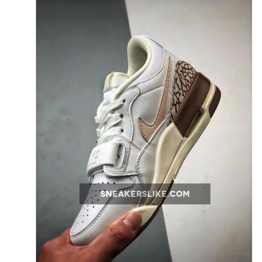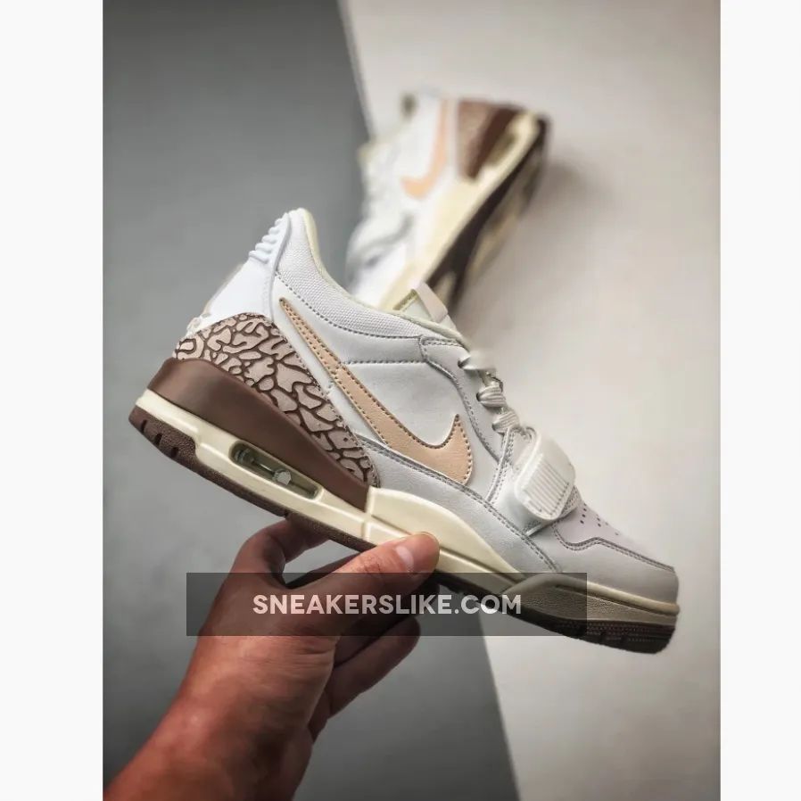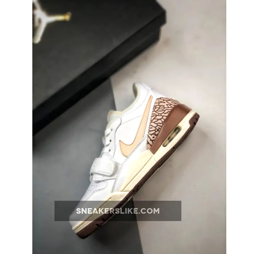 White leather makes up the base layer on this pair, joined by light tan accents on the Swoosh and lining for a tasteful contrast. The heel is adorned with a brown elephant print, echoing the detailing on the sole, while a tan Jumpman logo on the back completes the look.